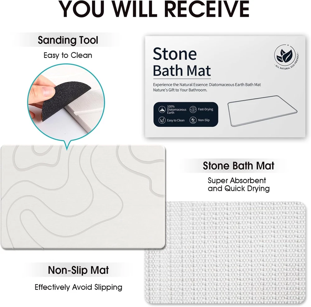 【Sustainable Materials】Crafted from diatomaceous earth, the ZIKIBL stone bath mat is not only safe but also more durable than traditional mats. Over time, it proves to be a cost-effective choice 【Super Absorbent and Fast drying】Say goodbye to damp and unhygienic conditions in your bathroom!Our stone bath mats are highly absorbent and evaporate and dry quickly, which can effectively avoid moisture accumulation and odor generation, thus keeping your feet clean and dry 【Non-Slip Design】Enhance your bath safety with our diatomite stone bath mat featuring a textured surface for added friction and an included rubber anti-slip mat for double protection. Placing a non-slip mat beneath it ensures the stone mat stays securely in place while preserving your floor 【Easy to Clean】Easily maintain your natural diatomaceous earth bath stone mat. Simply rinse it with water or wipe it with a damp cloth as part of your daily cleaning routine. For stubborn stains, gently use sandpaper, and watch them vanish effortlessly 【Stylish and Modern】Our innovative bath stone mats are a fantastic addition to your home. Their minimalist designs effortlessly complement any decor, making them a versatile addition not just in the bathroom, but also as great kitchen drying mats, entryway mats, dish rack mats, pet bowl mats, and poolside mats Product Description At ZIKIBL , we understand that a comfortable bathroom reflects a high-quality lifestyle. Therefore, we not only prioritize product quality but also strive for unique designs and stylish aesthetics, transforming your bathroom into a beautiful sanctuary. Each diatomite stone bath mat is meticulously crafted from natural diatomaceous earth, ensuring a dry, comfortable, and healthy bathroom environment for you. These are some of the problems you may encounter when using a traditional bath mat: Difficulty in thorough drying, which can lead to bacterial growth. Slides easily, posing a safety risk for the elderly and small children. Poor water absorption and difficulty in drying cause deformation of the floor. ZIKIBL presents the perfect solution with our Stone Bath Mat! Made from natural diatomaceous earth with no harmful chemicals,it's healthier for your family. Super Absorbent and Fast-Drying: Thanks to diatomaceous earth's unique physical structure, the millions of pores on its surface can quickly absorb moisture from your feet and rapidly dry them once you step away from the mat. Anti-Slip:The textured surface of the stone bath mat and the non-slip mat on the bottom reduce the risk of you slipping after your bath. Long-lasting: Diatomaceous earth stone bath mats are strong and long-lasting and do not need to be replaced frequently, making it more economical to use them in the long run. Wide Range of Uses : Our diatomite stone bath mat serves as a versatile addition, suitable for use as a bathroom mat, pool mat, plant mat, pet bowl mat, dish mat, and much more. 100% Diatomaceous Earth It is crafted from high-quality diatomaceous earth, known for its strength and durability, free from chemicals, and promoting a healthier environment for your family. Non-Slip Design To prevent slipping after bathing, we've included a non-slip mat for you and your family's safety. Simply place the non-slip mat underneath the stone bath mat, securing it firmly to the floor. Easy to Clean For light dusting, simply rinse with water and wait for it to dry thoroughly before using. For stubborn stains, simply sandpaper it lightly to restore it. ZIKIBL diatomaceous mats can be used wherever water may drip, not just outside the shower stall. You can place them on your kitchen counter, use them as dish drying mats, position them under your pet's water bowl, or beneath your potted plants to safeguard your floor from water damage—the possibilities are endless!
