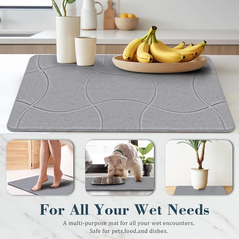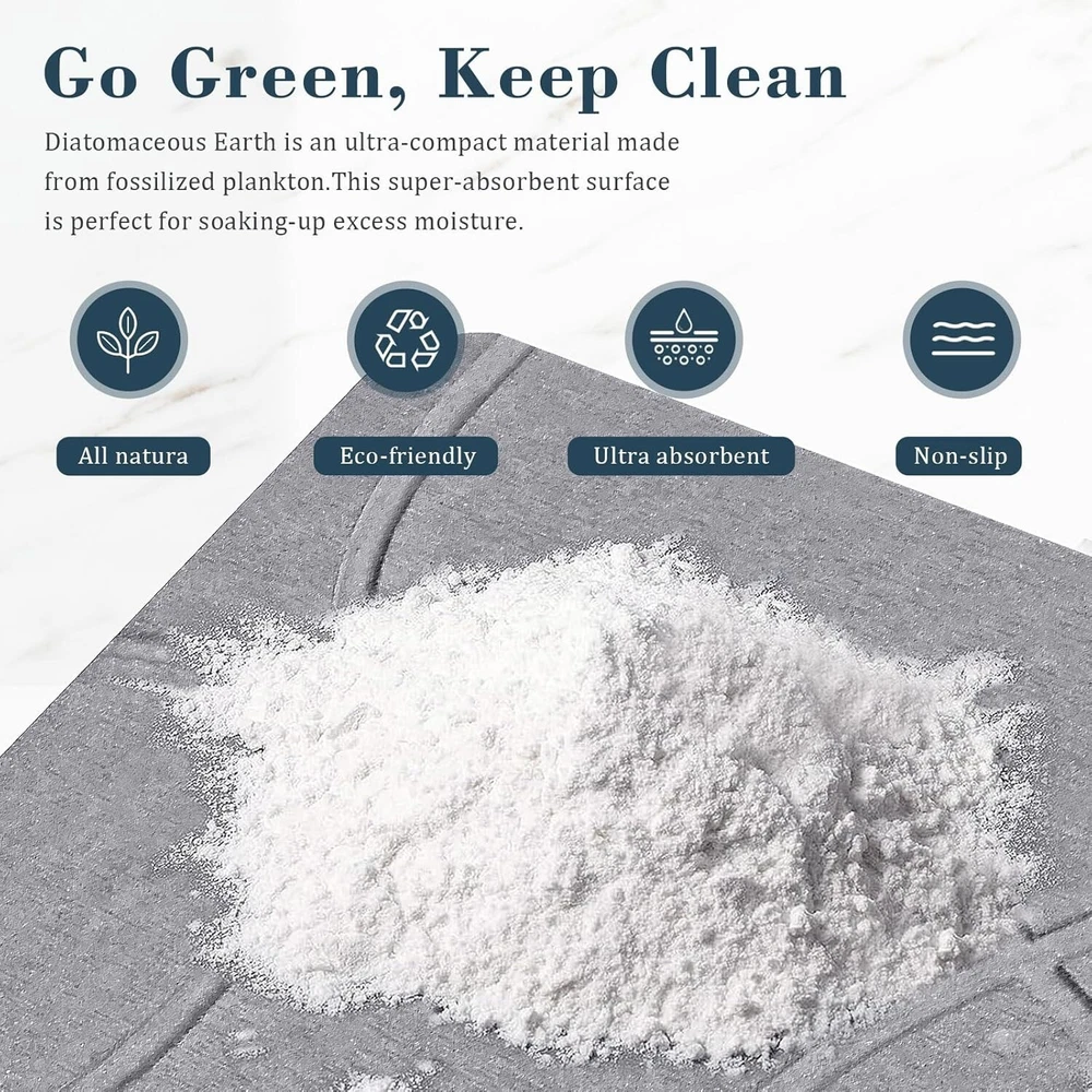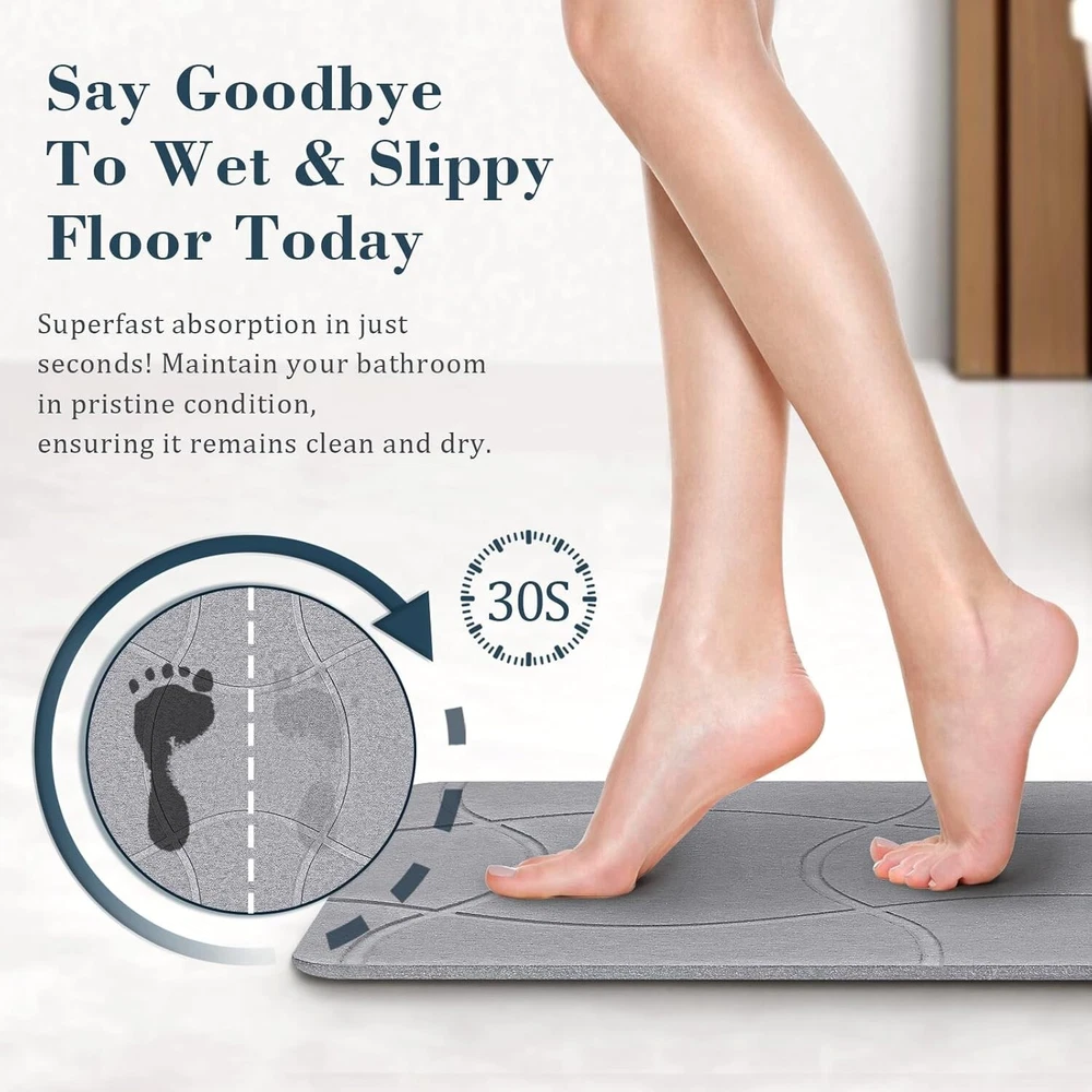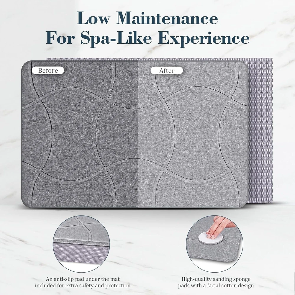Speedy Dry Magic - Step out of the tub or shower and experience instant dryness beneath your feet with Speedy Dry Magic! Our bath mat, made from natural diatomaceous earth, boasts exceptional water-absorbing capabilities. Bid farewell to soggy bathroom floors and traditional bath mats. Embrace the comfort of a worry-free, dry experience like never before! Anti-Slip Assurance - To add a sense of security and stability to your bathroom, our stone bath mat is an ideal choice. Equipped with non-slip pads, our diatomite mats ensure a firm grip on the floor, preventing unexpected slips. Choose our durable and reliable diatomite stone bath mats with confidence, providing peace of mind for you and your family in daily life, ensuring a steady and secure footing in the bathroom. Built to Last - Our super absorbent stone bath mat is designed for hassle-free maintenance compared to traditional bathroom mats. When it gets a bit dirty, there's no need for extensive cleaning – just use the thick sanding sponge pad we include to easily wipe away surface dirt, restoring it to its best condition. Remember to keep the diatomaceous earth bath mat away from direct sunlight; a well-ventilated spot is all it needs. Clean & Green - Experience the comfort of our stone bathroom mat, crafted from a sustainable blend of natural diatomaceous earth and renewable paper. It's not just about comfort; it's a commitment to a green planet. Plus, with proper usage, its lifespan surpasses that of traditional fabric mats, making it a more economical choice. Timeless Minimalist Design - With its sleek and timeless linear design, our stone bathroom mat is not just a stylish choice but a versatile one too. Beyond its visual appeal, it seamlessly adapts to various uses - from a bathroom mat to a perfect spot for pet bowls, plants, dishes and more. With its exceptional water absorption, it ensures a dry and clean environment wherever it's placed, making it a functional and stylish addition to any space.