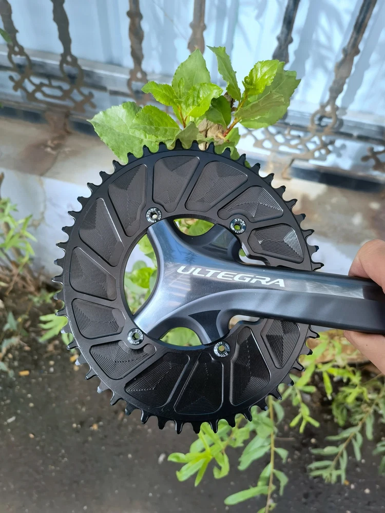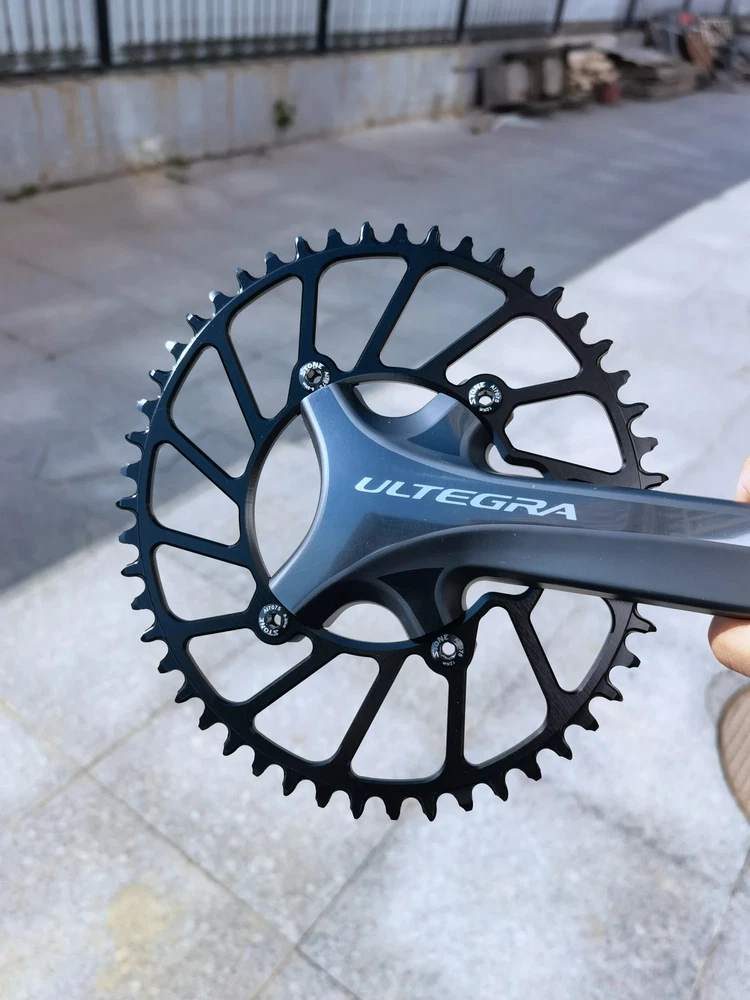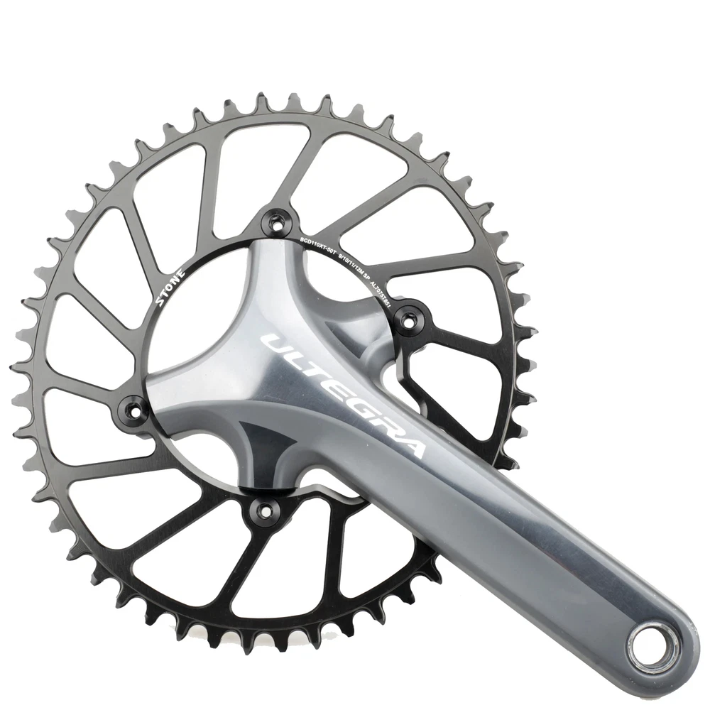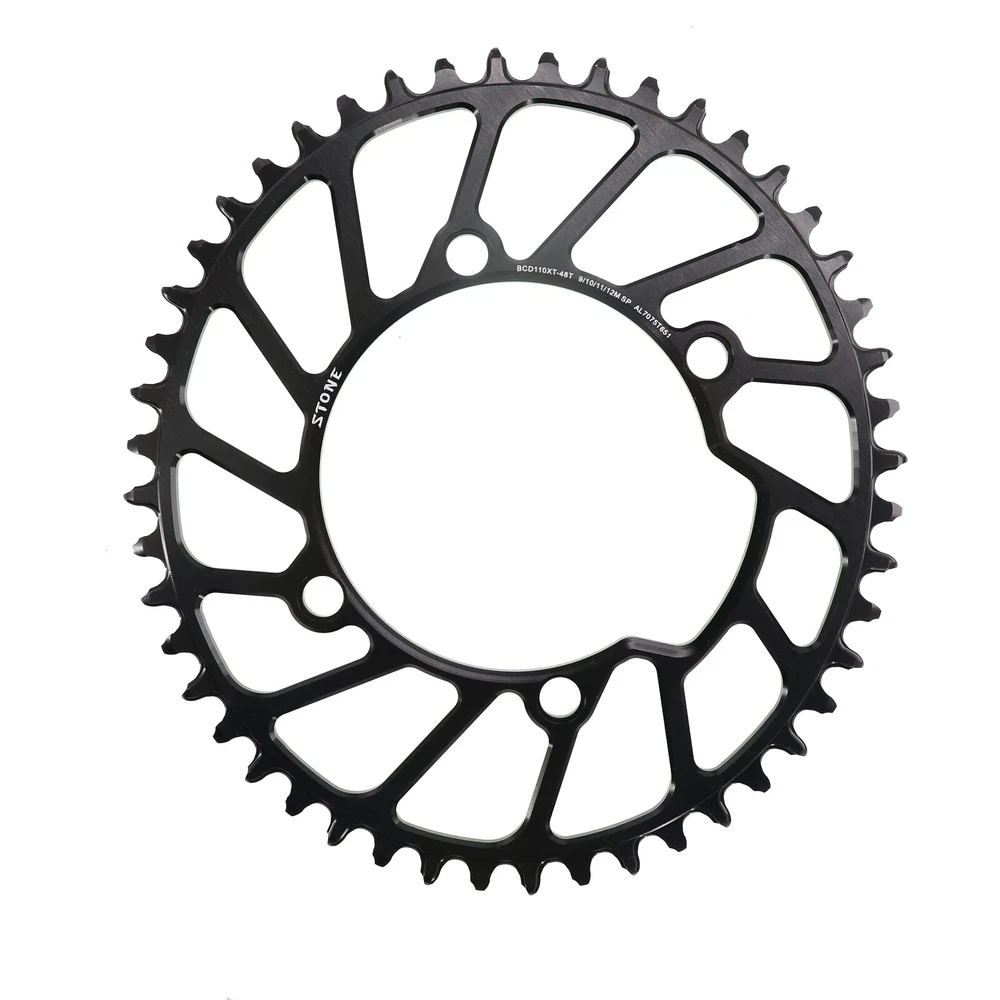 Stone Chainring 110BCD for Shimano 4700 5800 6800 9000 Oval 34 36 38 40 42 44 46 48 58T 60T Narrow Wide Road Bike 110bcd Material: High strength Aluminum 7075-T651. Material Hardness:HB150 CNC process precision:0.03mm Color: black anodized Style:Hollow(42t to 60t),Aero(36t to 60t) Size: 110 BCD, oval Thickness: 4MM Narrow wide tooth Notice:Only fit for 1x use,NOT for 2x use.No refund or return for wrong purchase. Notice:Only fit for 1x use,NOT for 2x use.No refund or return for wrong purchase. Notice:Only fit for 1x use,NOT for 2x use.No refund or return for wrong purchase. Chain Speed support: 9-10-11-12 speed(MTB chain) 9-11s( for Sram Road bike chain) 9-12s(for shimano Road bike chain) Default Not support AXS flattop chain. If want tooth shape for sram axs flattop chain, please send us a message to customize and pay extra surcharge. NOTICE: 12 speed chain connector is a must if you use shimano 12 speed chain , otherwise the 12 speed chain can not work with this chainring. Fit for shimano 5800 6800 4700 9000 Surface treatment: Anodize, high speed CNC Package Contents: 1 x chainring or 1 set bolts cover Advantages: 1 Material: High strength Aluminum 7075-T651. Offer best stiffness and endurance. 2 High precision CNC processing. Working accuracy 0.03mm. Ensure offers you the best riding component. Tooth Max diameter(mm) Weight(g)(Aero Style) 36 T , 162 mm , 67 g 38 T , 170 mm , 80 g 40 T , 178 mm , 86 g 42 T , 186 mm , 89 g 44 T , 194 mm , 102 g 46 T , 202 mm , 106 g 48 T , 210 mm , 115 g 50 T , 219 mm , 131 g 52 T , 226 mm , 136 g 54 T , 235 mm , 145 g 56 T , 242 mm , 150 g 58 T , 250 mm , 166 g 60 T , 259 mm , 175 g