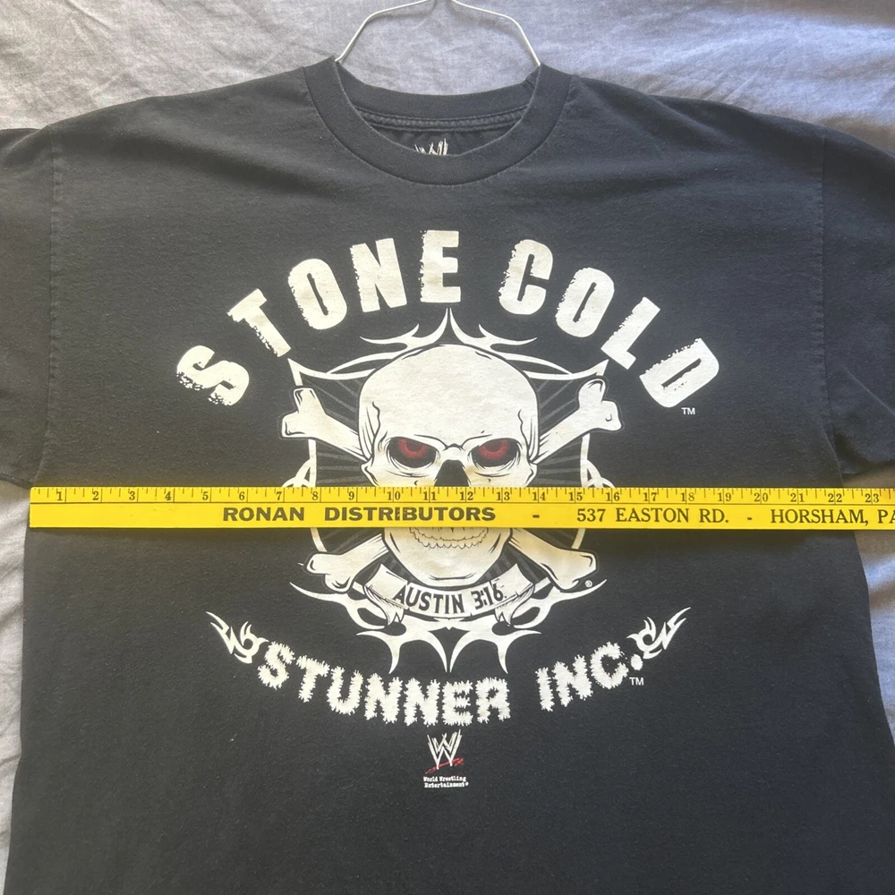 This Stone Cold Stunner T-shirt, featuring Steve Austin, is a must-have for any WWE fan. Made of high-quality cotton, this black shirt is available in XL size fits true to size. Measurements are also in the photos. The shirt is designed with the iconic Stone Cold Stunner logo. Shirt is dated 2010.