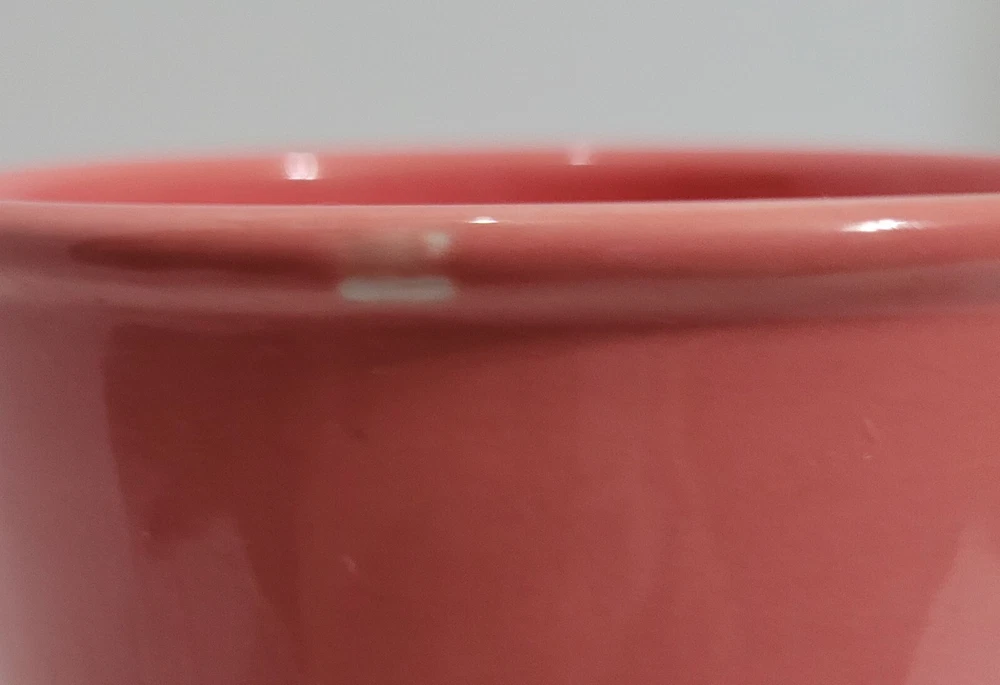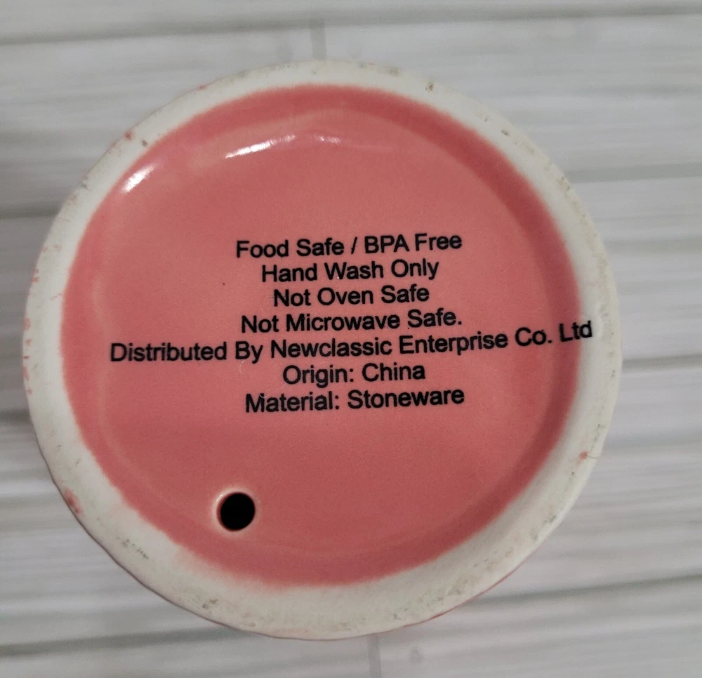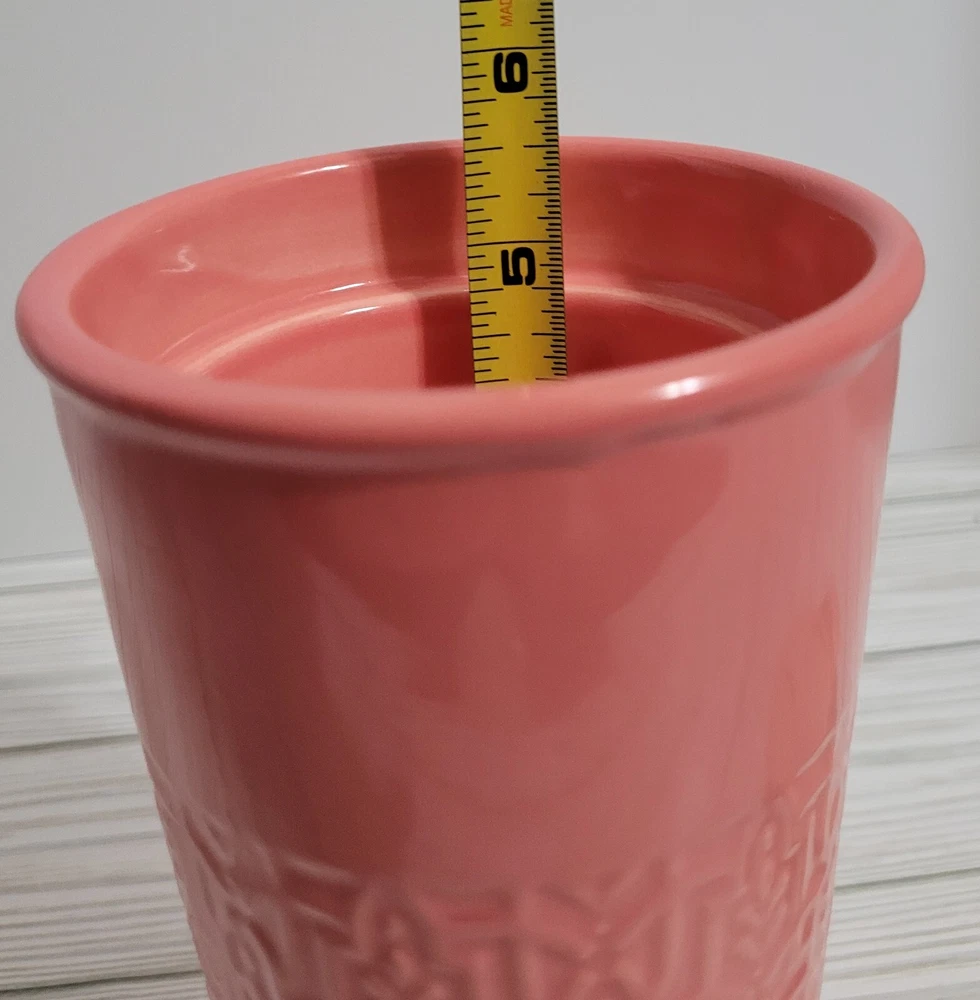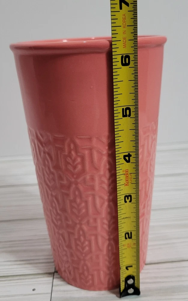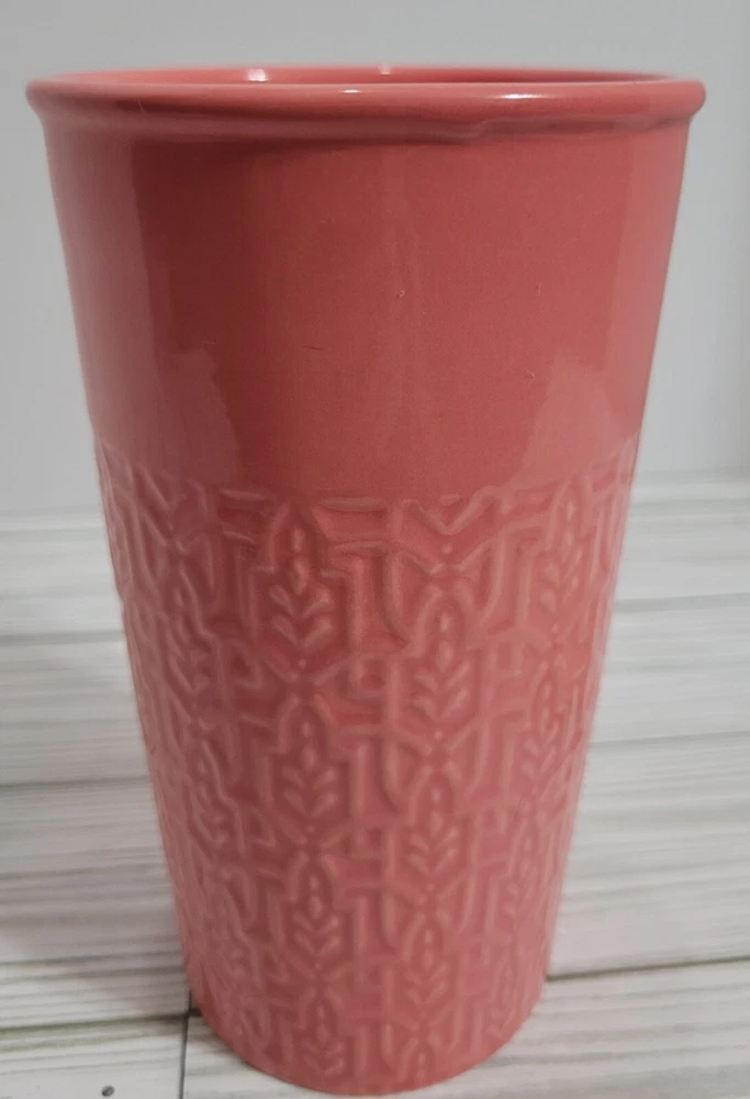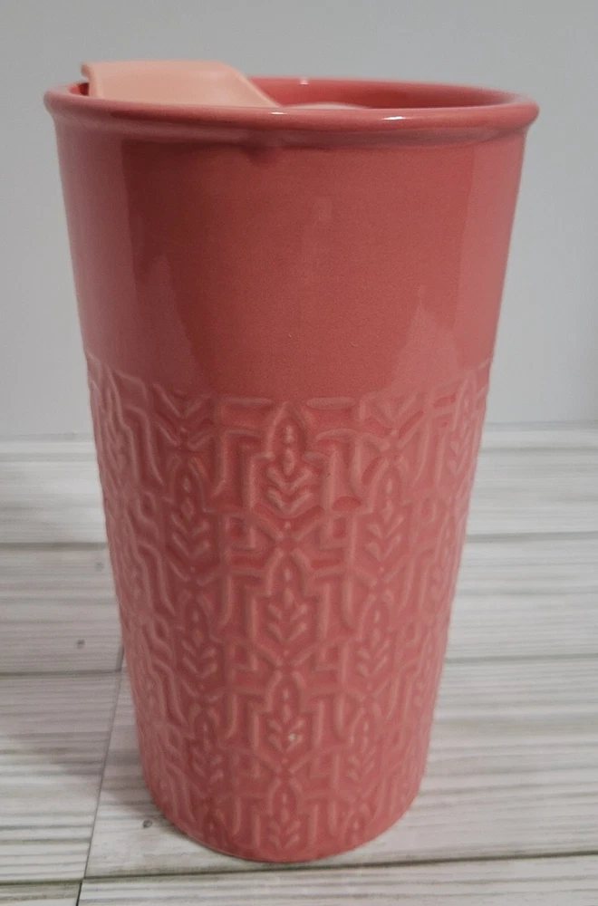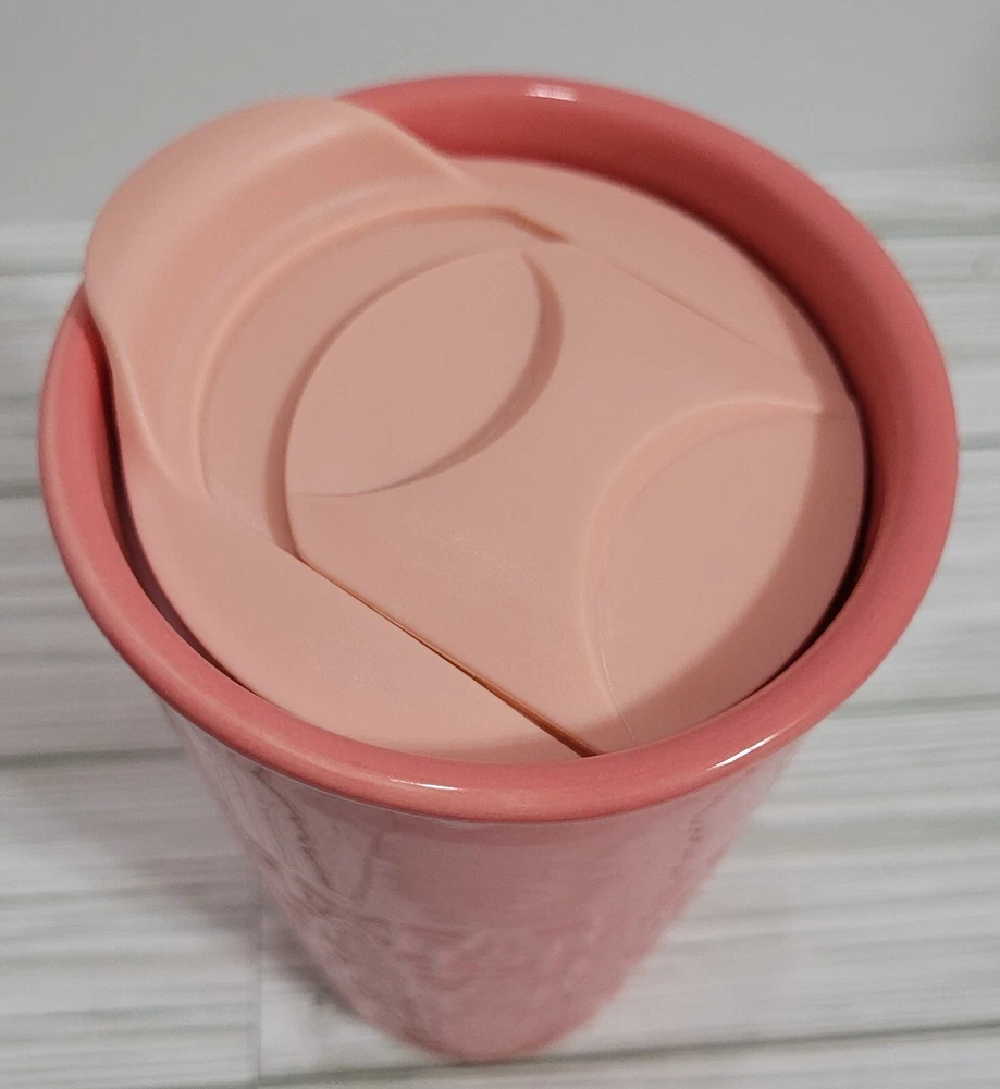 Pink Etched Stoneware Breakable Coffee/Tea Glass with Lid Pre-Owned - Good Condition - (Paint discoloration at top rim - Rubber inside lid has a yellowish color) Note: Hand Wash Only, DO NOT USE in the oven or microwave. Material - Stoneware