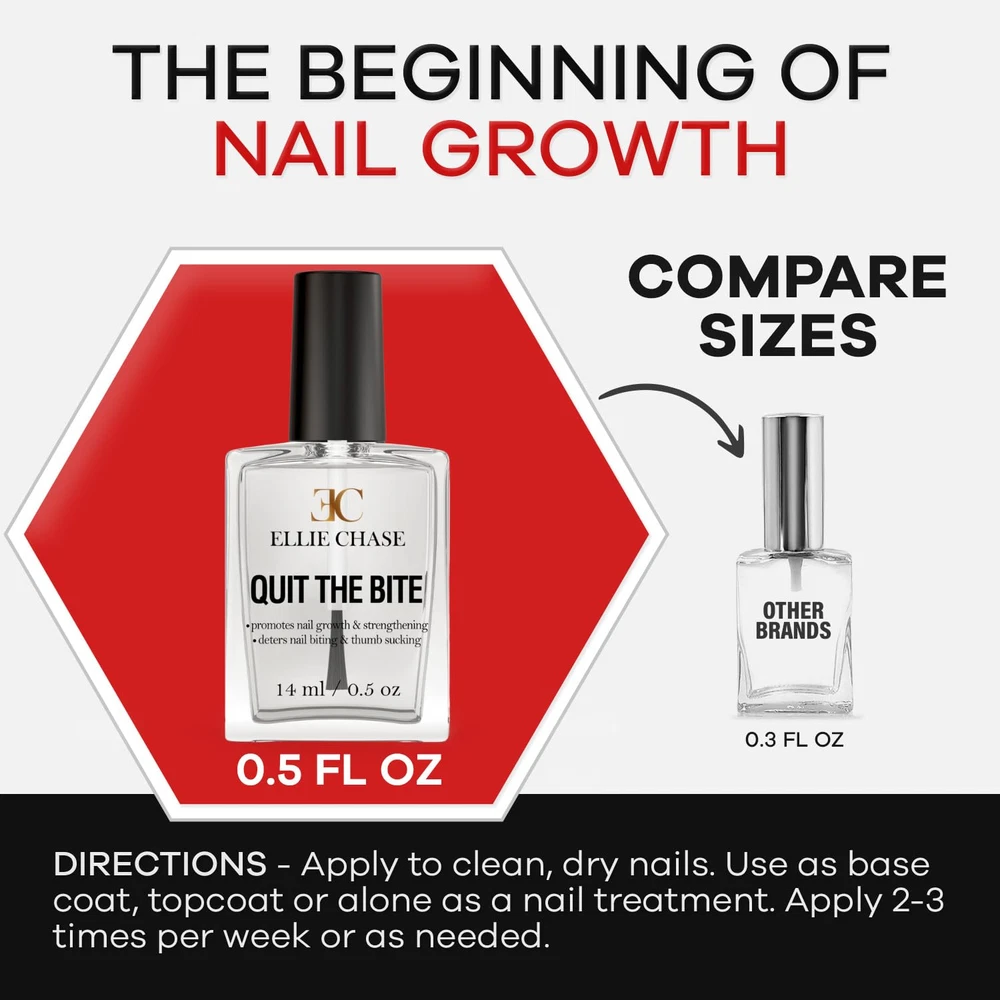 Instantly starts working to stop adults and kids from putting fingers in their mouth. Great deterrent treatment for nail biting or thumb sucking that need immediate attention An effective adult & children deterrent with an easy-to-use brush on application. The bitter yet harmless taste helps discourage you from putting fingers in your mouth so nails can grow faster, stronger, and longer Keep your fingernails looking healthy, clean, and rejuvenated with this nail care aid. Ellie Chase stop treatment helps keep hands out of the mouth so nails can grow and repair themselves Ellie Chase quit the bite nail biting treatment is safe for kids and adults. Recommended by dentists, orthodontists, and pediatricians nationwide to prevent putting fingers in or near your mouth and to repair damaged or chewed nails Made in the USA. Can be used as topcoat, base Coat, or standalone nail treatment. Dries on clear and contains 0.5 FL OZ. Cruelty Free, Vegan, Toluene Free, Formaldehyde Free, Camphor Free, DBP Free, TPHP Free, Xylene Free Product Description