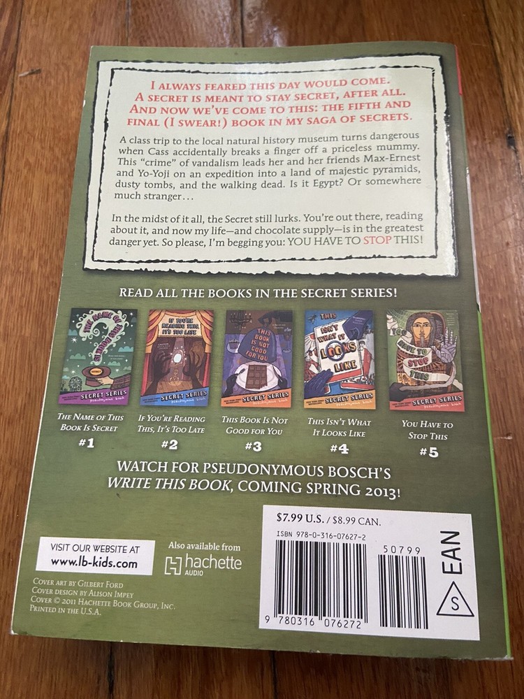 payment | shipping rates | returns You Have to Stop This (The Secret Series, Book 5) Product Category : Books ISBN : 0316076279 Title : You Have to Stop This (The Secret Series, Book 5) EAN : 9780316076272 Authors : Bosch, Pseudonymous Binding : paperback Publisher : Little, Brown Books for Young Re Publication Date : 10/2/2012 12:00:01 A Pages : 368 Signed : False First Edition : False Dust Jacket : False List Price (MSRP) : 9.99 Height : 1.4200 inches Width : 5.2400 inches Length : 7.5600 inches Weight : 0.6393 pounds Condition : Very Good Crease on cover and a few pages* About Bookmonger Ltd Bookmonger is dedicated to providing you with the best quality, lowest cost products on eBay. Payment We accept PayPal for all eBay orders. Please see payment details below. Shipping Multiple shipping options are available for this item. For more detail, please see below, and select the shipping option that is most convenient for you. International Shipping: Import duties, taxes, and charges are NOT INCLUDED in the item price or shipping charges. These charges are the buyer's responsibility. Please check with your country's customs office to determine what these additional costs will be prior to bidding / buying. These charges are normally collected by the delivering freight (shipping) company or when you pick the item up do not confuse them for additional shipping charges. We do not mark merchandise values below value or mark items as "gifts." US and International government regulations prohibit such behavior. International shipping not available on all items - pleae see item details for available shipping options. Returns Your satisfaction is very important to us. Please contact us via the methods available within eBay regarding any problems before leaving negative feedback. Any defects, damages, or material differences with your item, must be reported to us within 7 days of receipt of the item or 30 days from date of shipment. The returned merchandise must be postmarked within 30 days of the shipment notification. Non-deliveries must be reported within 30 days of Shipment Notification. Undeliverable, unclaimed, refused, or insufficient addresses will be subject to a 20% restocking fee plus the cost of shipping. © 2024 Bookmonger Ltd