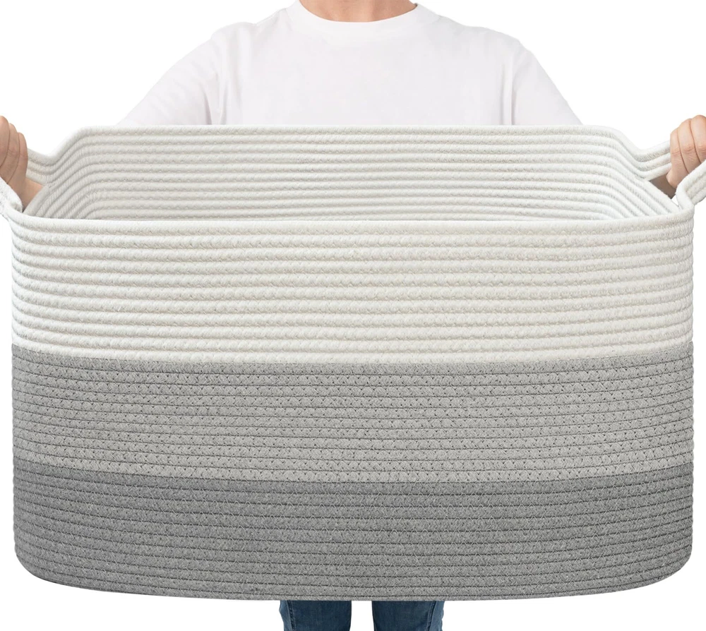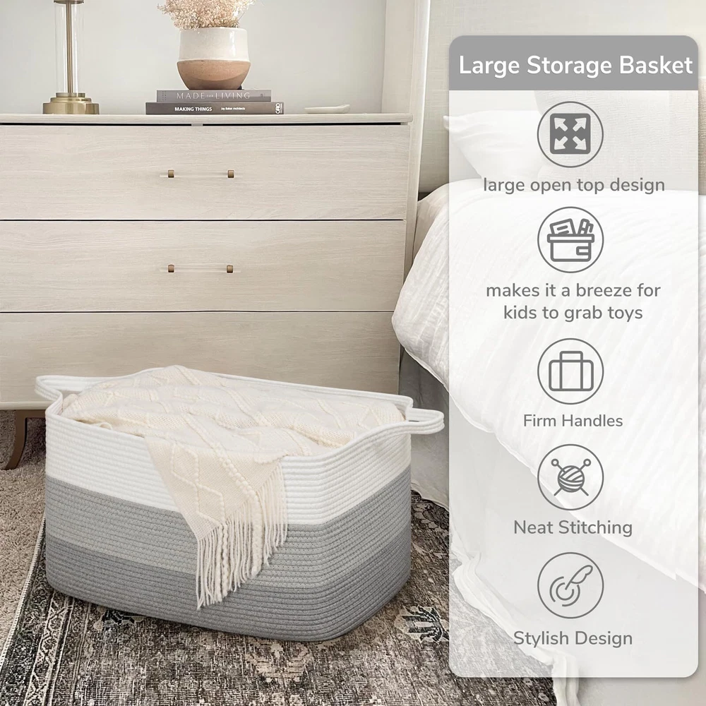 Extra Large Blanket Basket: measures 21.6" x 14.9" x 11.8", providing ample space for 4-5 throw blankets, 3 big pillows, or 2 throw-sized quilts. Keep your home organized and clutter-free with ease Rectangle Storage Basket Design: Say goodbye to round baskets that only occupy the floor. Our rectangular laundry basket can be placed on the floor or fitted onto a shelf, wardrobe, or closet. Perfect for organizing dirty clothes and keeping them out of sight Convenient and Easy to Move: Our large toy basket comes with two handles, making it easy to move from room to room. With a height of 12 inches, it is also easily accessible for kids who want to reach in and grab their toys. And when not in use, it can be easily folded and stored to save space Multifunctional Storage Basket: With a neutral color scheme, our woven decorative storage baskets blend seamlessly with any room decor. Use them to store extra throw blankets in the living room, kids' stuffed toys in their room, towels in the bathroom, and clothes in the laundry room Durable and Soft Material: Our cotton rope basket is made of thick, durable fabric that is good for babies, kids, and pets to touch. It is also no chemical smells, making it perfect for storing a wide range of items