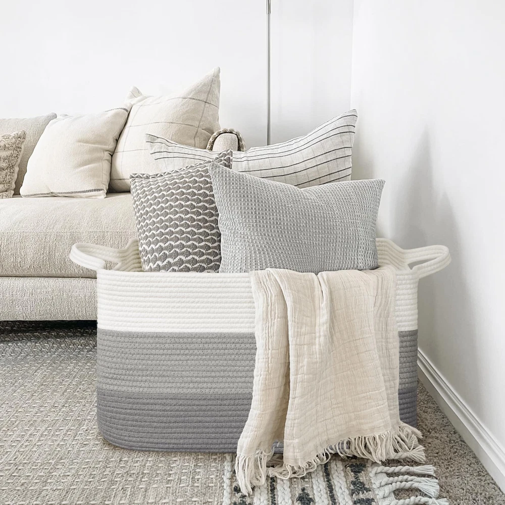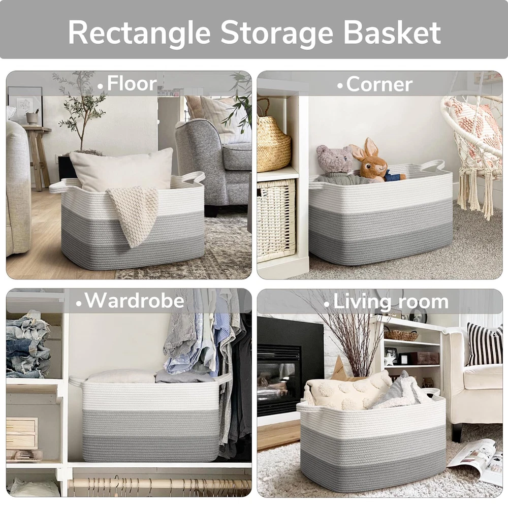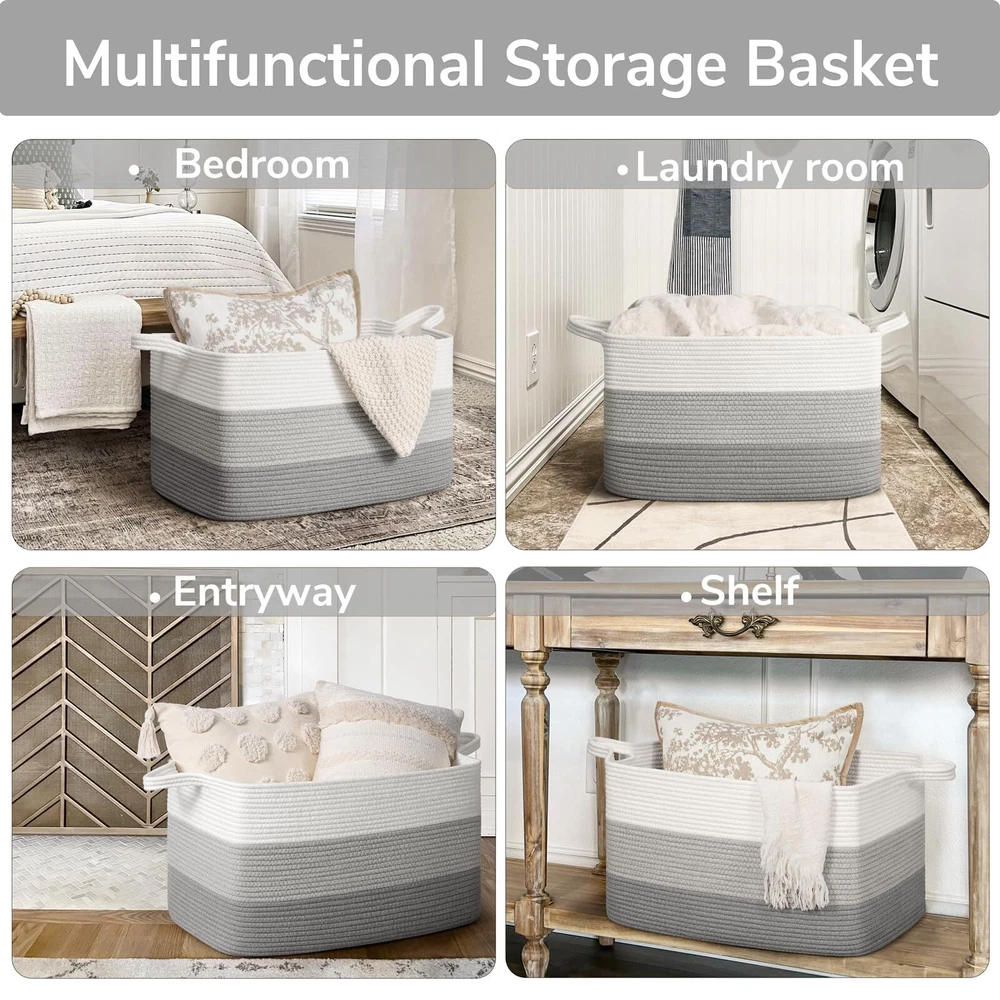 Extra Large Blanket Basket: measures 21.6" x 14.9" x 11.8", providing ample space for 4-5 throw blankets, 3 big pillows, or 2 throw-sized quilts. Keep your home organized and clutter-free with ease Rectangle Storage Basket Design: Say goodbye to round baskets that only occupy the floor. Our rectangular laundry basket can be placed on the floor or fitted onto a shelf, wardrobe, or closet. Perfect for organizing dirty clothes and keeping them out of sight Convenient and Easy to Move: Our large toy basket comes with two handles, making it easy to move from room to room. With a height of 12 inches, it is also easily accessible for kids who want to reach in and grab their toys. And when not in use, it can be easily folded and stored to save space Multifunctional Storage Basket: With a neutral color scheme, our woven decorative storage baskets blend seamlessly with any room decor. Use them to store extra throw blankets in the living room, kids' stuffed toys in their room, towels in the bathroom, and clothes in the laundry room Durable and Soft Material: Our cotton rope basket is made of thick, durable fabric that is good for babies, kids, and pets to touch. It is also no chemical smells, making it perfect for storing a wide range of items