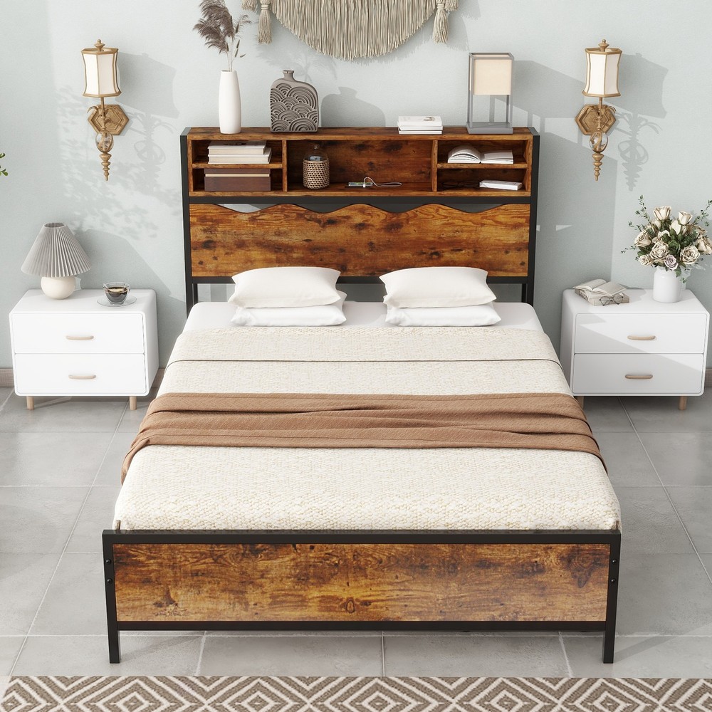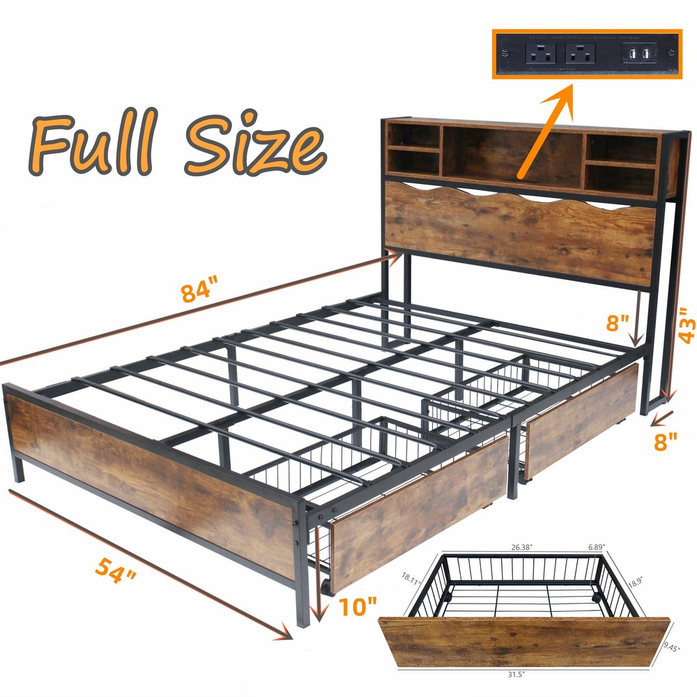 Ready for SpringThe 3-Tier bookshelf headboard of this storage bed has 5 open storage cubies with a built-in charging station in the middle, with 2 power outlets and 2 USB Ports, you can easily charge your phone, laptop, headphones and other electronic devices at arm's reach. It also has 10.31" under-bed clearance with 2 extra pull-out storage drawers on one side and a basket or suitcase for your bedding and toys on the other side, providing plenty of storage space. This storage bed has a high blend of rustic and industrial style, it will be perfect to match your interior, whether rustic or modern decor. Let's beginFeatures:.Rustic Design: In particular, the water ripple headboard is quite unique in its design. This storage bed is a wonderful addition to your home, offering a fairly Free Shipping Over $49.99* Details Storage Bed Frame Bookcase with Power Outlets, 2 Storage Drawers Included, Product Description: Ready for Spring The 3-Tier bookshelf headboard of this storage bed has 5 open storage cubies with a built-in charging station in the middle, with 2 power outlets and 2 USB Ports, you can easily charge your phone, laptop, headphones and other electronic devices at arm's reach. It also has 10.31" under-bed clearance with 2 extra pull-out storage drawers on one side and a basket or suitcase for your bedding and toys on the other side, providing plenty of storage space. This storage bed has a high blend of rustic and industrial style, it will be perfect to match your interior, whether rustic or modern decor. Let's begin Features: .Rustic Design In particular, the water ripple headboard is quite unique in its design. This storage bed is a wonderful addition to your home, offering a fairly practical bookcase metal bed frame and extensive storage drawer space .Convenience of Bookcase: After reading a book or magazine before sleep, you can put it in our bookcase headboard. There are also 2 power outlets & 2 usb ports built in, charging becomes more convenient from now on .Storage Space: The metal platform bed's powerful storage function consist of bookcase headboard with 5 open cubies and 2 additional removable under-bed drawers with brake wheels, tidying up your home becomes simple and easy .Sturdy Construction This bed frame with storage bookcase headboard is made of premium steel slats and MDF boards for solidly supporting your mattress. In addition, the sturdy bed legs greatly increase the load carrying capacity of the bed .Easy to Install: Headboard, bed frame, drawers each a separate manual, please follow the corresponding instructions to install. All the parts and instructions come in 1 package. If you need any assistance, please feel free to contact us Dimension: MaterialSteel + Wood SizeFull & Queen optional Storage DecorationBookcase Headboard & Storage Drawers with Brake Wheels Full Size Bed 84 in.L x 54 in.W x 43 in.H Queen Size Bed89 in.L x 60 in.W x 43 in.H Weight CapabilityFull:600 lb ; Queen:700 lb Box Spring RequiredNo Warranty period1 year MattressesNot included Check all the components & screws before assembly. Do not install in case part is missing, contact us to get. Send email with your question to our After-sales mailbox (marked on the instruction manual). We will arrange a reissue for you right away [Please rest assured to buy, just choose the style and size, and leave the rest to us. Once the order is created, we will arrange the delivery immediately, to help you build a dream ASAP] A perfect blend of vintage and simplicity, Kuurfuurdo's STORAGE BED collection incorporates classic and modern design styles. Drawing inspiration from practical and durable craftsmanship, these pieces draw on both classic and contemporary influences. Make your dream house come true.