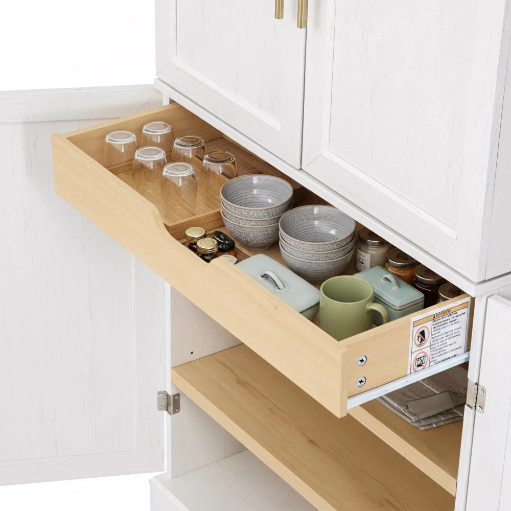 K&K 78.2" Tall Farmhouse Pantry Cabinet - 8 Door Shelves, Adjustable Shelves, Hidden Drawer & Wine Rack (Retro White/Ash Black) ๐ฅ Elevate Storage & Style with Timeless Farmhouse Charm ๐ฅ Introducing the K&K 78.2" Tall Farmhouse Pantry Cabinet โ where American traditional elegance meets all-in-one storage functionality. Available in two versatile finishes (Retro White & Ash Black), this freestanding cabinet features 6 doors, 8 door shelves, 4 adjustable shelves, a hidden drawer, and a built-in wine rack, making it perfect for organizing kitchen essentials, diningware, bathroom supplies, or living room decor. Crafted with premium MDF and accented with gold handles, itโs designed to add sophistication to any space while standing up to daily use. ๐จ Choose Your Perfect Finish Retro White The soft retro white finish pairs beautifully with natural wood grain undertones and gold handles, creating a warm, inviting ambiance. It seamlessly blends with farmhouse, cottage, or classic American decor, brightening up kitchens and dining rooms with its timeless appeal. Ash Black The rich ash black hue exudes modern sophistication, complemented by sleek gold accents and subtle wood textures. Itโs ideal for contemporary, industrial, or transitional spaces, adding depth and a touch of luxury to your storage area. ๐ Standout Features of This Pantry Cabinet Iconic Farmhouse Aesthetic : Designed with two-tone color contrast, chamfered edges, recessed panel frames, and elegant gold handles, this cabinet captures the essence of American traditional style. Clean lines and natural wood grain details add warmth, making it a focal point in any room while blending seamlessly with existing decor. 17 Compartments for Ultimate Organization : This all-in-one storage solution includes 7 shelves (4 adjustable), 8 door shelves (2 adjustable), 1 hidden drawer, and 7 wine racks โ totaling 17 compartments across 3 separate cabinets. Customize the layout to fit items of all sizes, from tall cereal boxes to wine bottles and dinner plates. Adjustable Storage Flexibility : Four main shelves and two door shelves are fully adjustable, allowing you to reposition them at various heights. Accommodate tall cookware, bulky appliances, or small spice jars with ease โ tailor the space to your unique needs. Rock-Solid Stability & Durability : Crafted from premium P2 engineered wood with scratch-resistant P2 grade laminate, this cabinet is built to last. The middle and bottom shelves support up to 250 lbs each, while other shelves hold 75 lbs, the hidden drawer holds 50 lbs, and each door shelf supports 35 lbs. A included wall anchor kit prevents tipping for added safety. Thoughtful User-Friendly Design : Features magnetic door catches for easy, quiet access and durable gold handles for a comfortable grip. The individual top cabinet separates from the lower storage area, enhancing usability. Beyond the kitchen, it works perfectly as a bathroom linen cabinet or living room display cupboard. Easy Assembly Process : No need for professional help! The cabinet comes with detailed step-by-step instructions, clearly labeled parts, and all necessary hardware. Assemble it with confidence โ we conduct thorough quality checks before delivery to ensure a smooth setup. ๐ Detailed Specifications (Both Finishes) Specification Details Overall Assembled Dimensions 31.50โ W ร 15.75โ D ร 78.20โ H Product Weight 138.34 lbs Packaging Dimensions 37.99โ L ร 19.69โ W ร 18.11โ H Packaging Weight 147.05 lbs Material Premium MDF (P2 Engineered Wood Core + P2 Laminate) Doors/Drawers 6 Doors, 1 Hidden Drawer Special Features 8 Door Shelves, 4 Adjustable Shelves, 7 Wine Racks, Gold Handles Origin China ๐ก๏ธ Shop with Complete Peace of Mind 1-Year Quality Warranty : We stand behind the craftsmanship of our K&K Pantry Cabinet. Enjoy a 1-year warranty covering any manufacturing defects, ensuring your investment is protected. 30-Day Free Return & Exchange : Not completely satisfied with your cabinet? Return or exchange it within 30 days of delivery โ no questions asked, and we cover the shipping costs. Important Notes : 1. Actual product color may vary slightly from images due to lighting or monitor settings. 2. Manual measurements may have a reasonable margin of error. This pantry cabinet isnโt just a storage solution โ itโs a statement piece that combines functionality with timeless style. Whether youโre organizing your kitchen, adding storage to your dining room, or decluttering your bathroom, it adapts to your needs while enhancing your spaceโs aesthetic. The blend of farmhouse charm and modern practicality makes it a must-have for any home. ๐ฆ Fast & Secure Shipping | ๐ ๏ธ Easy Assembly | ๐จ Two Elegant Finishes Add it to your cart today and transform your storage space with style!
