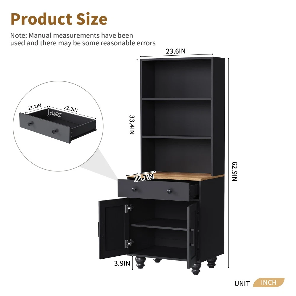 ON-TREND Farmhouse Storage Cabinet (White+Natural) | 5-Tier Bookshelf with Drawer for Living Room Origin : China Color : White+Natural Material : Particle Board + MDF Style : Farmhouse & Modern Ideal For : Living Room, Kitchen, Primary Living Space Assembled Dimensions : 23.60"L × 15.70"W × 63.00"H Product Weight : 62.20 lbs Package Dimensions : 40.50"L × 20.00"W × 9.75"H Package Weight : 70.88 lbs Elevate your farmhouse-inspired space with this ON-TREND Farmhouse Storage Cabinet —where rustic charm meets practical storage! Blending wood grain accents with a crisp white finish, this cabinet is tailored to complement your cozy, classic home decor. The vintage gourd-shaped solid wood legs and retro black handles add a touch of refined elegance, making it a standout piece in any room. Why This Cabinet Is a Must-Have ✅ Multi-Purpose Versatility This 5-tier cabinet works overtime to meet your needs! Use it as a stylish bookshelf for your favorite reads, an elegant plant shelf to display greenery, or a convenient kitchen pantry to store cutlery, tableware, and pans. It seamlessly fits into living rooms, kitchens, or hallways. ✅ Ample & Customizable Storage Featuring 3 open storage shelves, 1 spacious drawer, and a large bottom compartment with an adjustable shelf , this cabinet offers flexible storage for books, photo albums, crafts, decor, and kitchen essentials. Customize the shelf height to fit taller items—no more wasted space! ✅ Sturdy & Safe Design Equipped with 4 robust solid wood gourd-shaped legs, this cabinet boasts enhanced stability and weight capacity for daily use. It also comes with a dependable anti-tip kit to keep the unit securely anchored, giving you and your family total peace of mind. ✅ Farmhouse-Chic Aesthetic The perfect mix of wood grain and solid color pairs flawlessly with farmhouse, modern, or transitional decor styles—adding warmth and character to your primary living space. Hassle-Free After-Sales Guarantee ✅ 1-Year Warranty on construction and materials for long-term reliability ✅ 30-Day Free Return & Exchange if you’re not completely satisfied—no questions asked! ON-TREND Farmhouse Storage Cabinet (Black+Natural) | 5-Tier Bookshelf with Drawer for Living Room Origin : China Color : Black+Natural Material : Particle Board + MDF Style : Farmhouse & Modern Ideal For : Living Room, Kitchen, Primary Living Space Assembled Dimensions : 23.60"L × 15.70"W × 63.00"H Product Weight : 62.20 lbs Package Dimensions : 40.50"L × 20.00"W × 9.75"H Package Weight : 70.88 lbs Add a touch of rustic sophistication to your home with this ON-TREND Farmhouse Storage Cabinet in sleek black+natural finish! Designed to complement farmhouse-style decor, this cabinet features vintage gourd-shaped solid wood legs and retro black handles that exude timeless elegance—perfect for elevating your living room, kitchen, or hallway. Standout Features You’ll Love ✅ 3-in-1 Functional Design This versatile cabinet does it all! Serve it as a stylish bookshelf for your book collection, an elegant plant shelf for your favorite foliage, or a practical kitchen pantry to organize tableware, cutlery, and cookware. It’s the ultimate space-saving solution for busy homes. ✅ Flexible & Spacious Storage With 3 open display shelves, 1 deep drawer, and a large bottom storage compartment fitted with an adjustable shelf , this cabinet offers customizable storage for all your essentials—from books and crafts to kitchen gadgets and home decor. Adjust the shelf height to fit tall items effortlessly. ✅ Stable & Family-Safe Construction Built with 4 durable solid wood gourd legs for enhanced stability and weight capacity, this cabinet also includes a reliable anti-tip kit to keep it securely in place. You can store your belongings with confidence, knowing it’s safe for kids and pets. ✅ Timeless Farmhouse Charm The black+natural color scheme and classic details blend seamlessly with farmhouse, modern, or rustic decor—making it a versatile addition to your primary living space. Trusted After-Sales Support ✅ 1-Year Warranty on structure and materials for your peace of mind ✅ 30-Day Free Return & Exchange —we’re confident you’ll love your new storage cabinet!