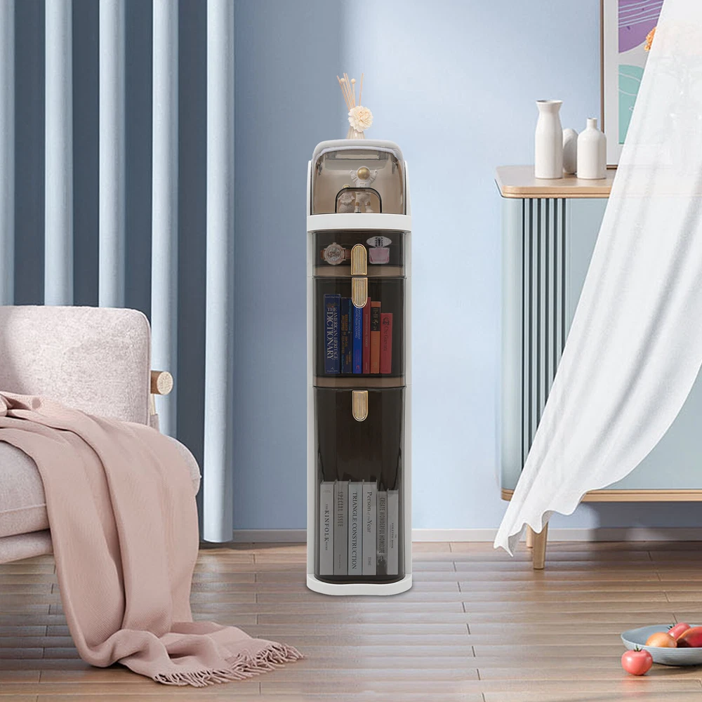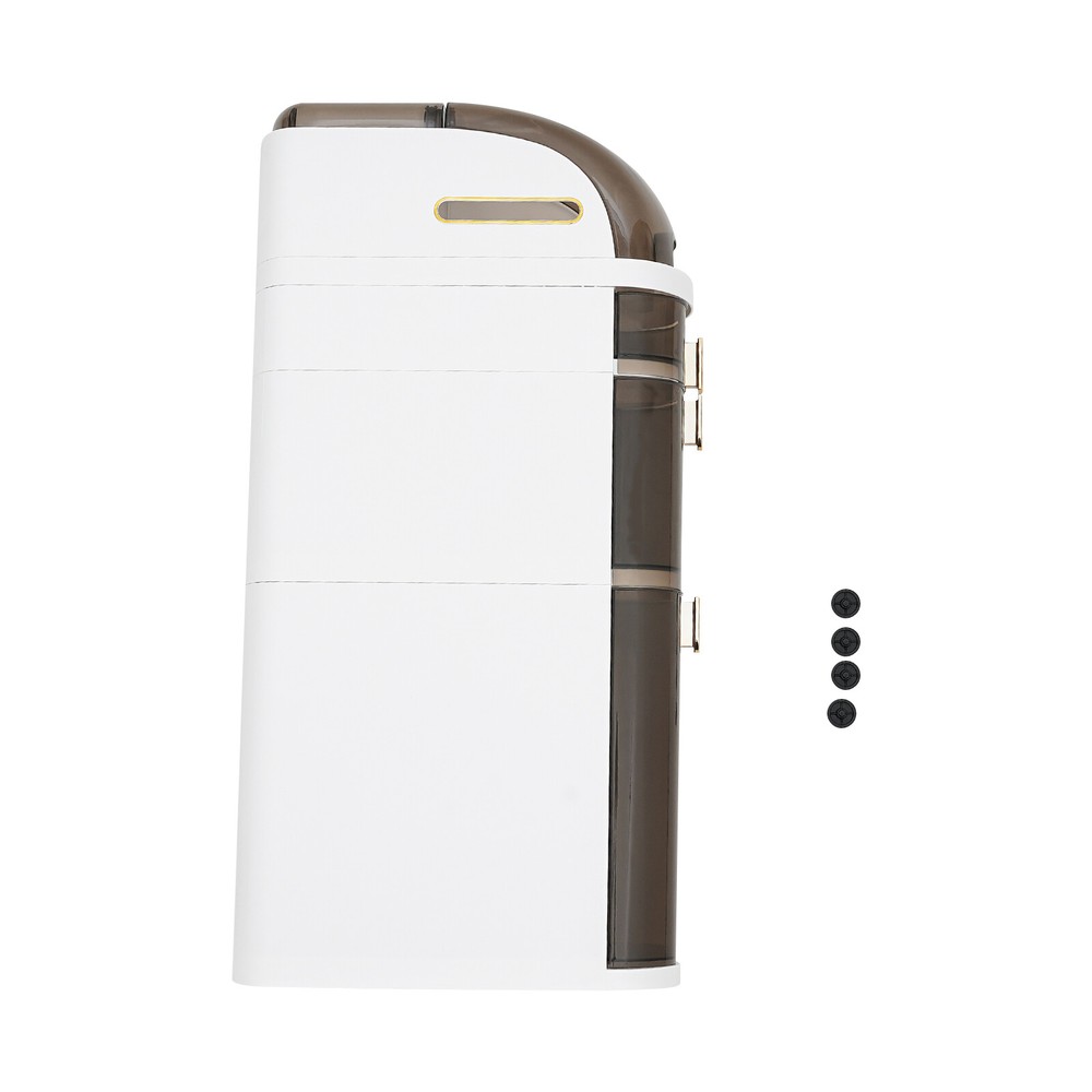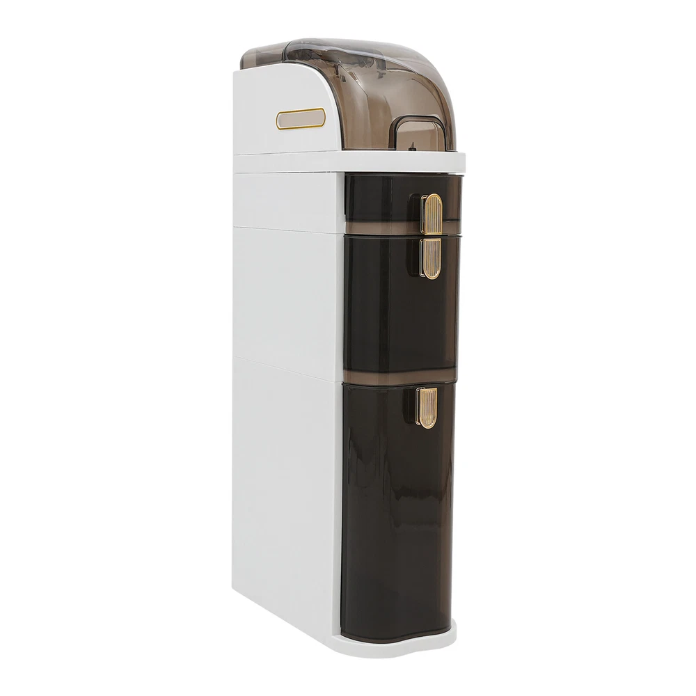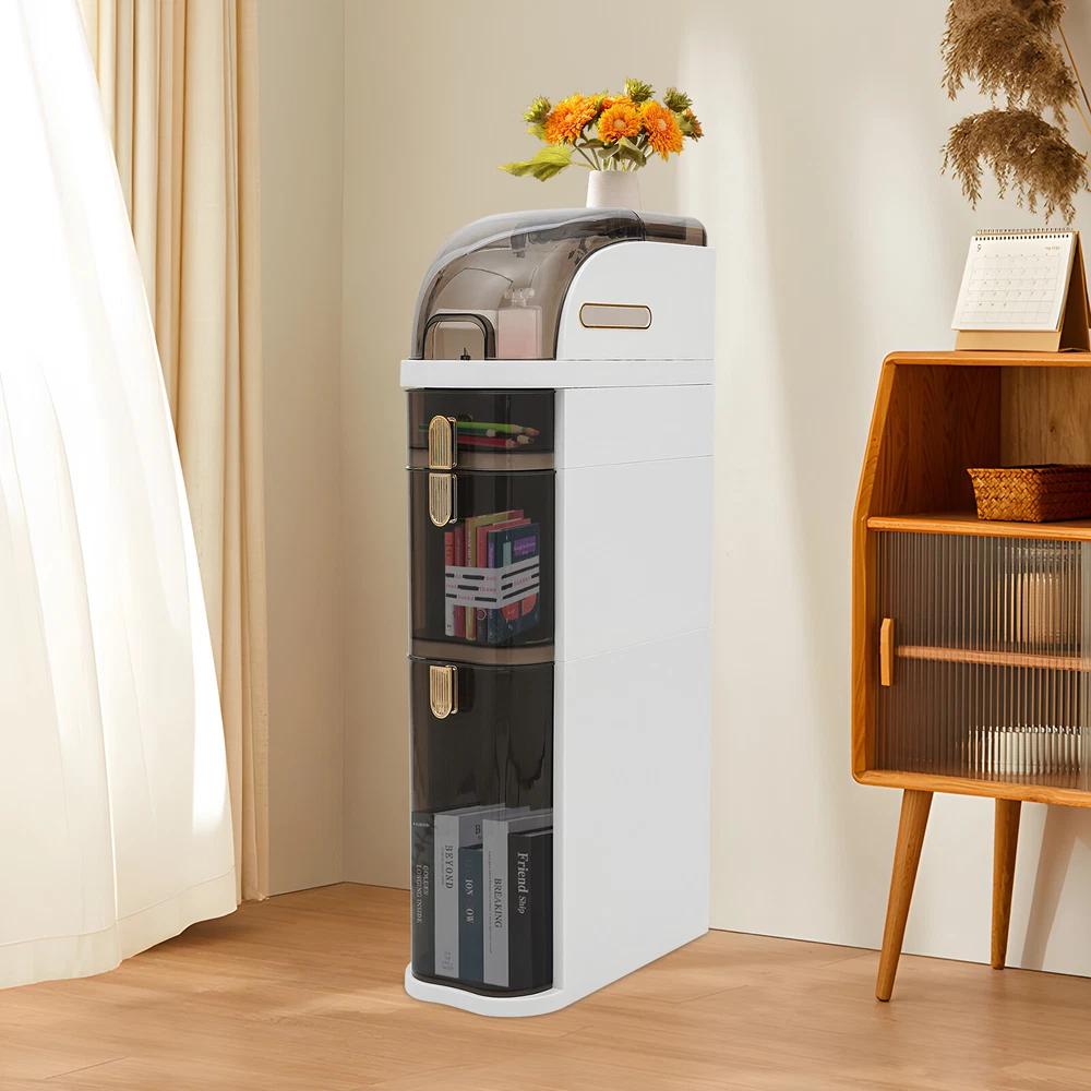 Description With a large capacity of 3-tier drawers and a top hidden space design, the slim and tall storage cabinet adds organization and storage to your small bathroom space, making your bathroom or kitchen more neat with clutter well organized. It is made of high-quality PP and PET and has four removable wheels, which is ideal for narrow dressing rooms or bathrooms with insufficient storage space. Details Rounded Corners and Edges: The corners are rounded and smooth to reduce collisions and improve safety. Comfortable U-shaped Pulls: They make drawer opening and closing even smoother. Raised Bottom Drawer: The raised bottom drawer (13.6inch) can accommodate more bulky household items such as laundry detergent and cleaning tools. Specifications Material: PP, PET Surface Treatment: Brightening Process Color: White, Clear Brown Style: Modern Shape: Rectangular Mount Type: Free Standing Number of Drawers: 3 Assembly Required: No Third-tier Drawer Height: 34.5cm/13.6in First and Second-tier Drawer Height: 29cm/11.4in Product Size: 41*18*78cm/ 16.1*7*30.7in Package Included 1* Storage Cabinet 4* Wheels Notes Please allow the slight color difference caused by the shooting light and 1-3cm error due to manual measurement, and make sure you do not mind before you order. Build to Last: The product is mainly made of PP and PET and after the surface brightening process, which is odorless, non-toxic, chemical resistant, fatigue resistant, and friction resistant. Large Storage Capacity: The storage cabinet measuring 16.1*7*30.7 inches has three-tier drawers and a hidden space at the top, so you can easily categorize toys, clothes, books, drinks, toiletries, tissues, towels, etc. Space-saving: Its compact design(footprint: 16.1*7 inches) allows the cabinet to provide maximum capacity in minimum space and effortlessly slide into seemingly useless tight spaces next to the toilet or closet. Whether you use it in your living room or bathroom, it delivers full use of space. Thoughtful Design: The hidden space at the top is designed with a large flap, so you can open and close it at a wide angle for hassle-free access. Also, the top is equipped with flat round holes on both sides, through them, you can draw and take toilet paper more conveniently. High Load-Bearing Capacity: The sturdy rectangular structure and high-quality materials allow it to withstand a heavy load without collapsing, you can use it with peace of mind. Semi-transparent Design: The drawer and top lid are designed semi-transparent, you can clearly glance at the items stored inside, easy to access and store your things. Easy to Move: Equipped with four removable wheels, you can easily move and secure the storage cabinet anywhere, making it ideal for the kitchen, bathroom, office, or any narrow space that needs to be efficiently organized. Beautiful Appearance: The product with a two-color sleek and stylish look adds a touch of elegance to your kitchen or bathroom décor and enhances the overall ambiance of your bathroom.