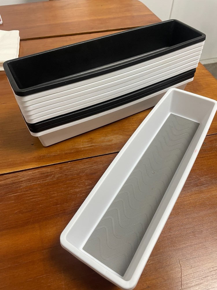 MPN: None Item Length: 13.5in Model: None Features: Non-Lidded gtin13: 0639277101686 Number in Pack: 1 Finish: Matte Item Width: 3.75 In Theme: None Size: Small Style: Modern Personalize: No Mounting: Free Standing Item Height: 2 In Number of Compartments: 1 UPC: 0639277101686 Pattern: None Type: Drawer Box Seller Notes: “Hand washed thoroughly, some have blemishes” Brand: Storage Essentials Color: Black Shape: Rectangle Capacity: None Material: Plastic