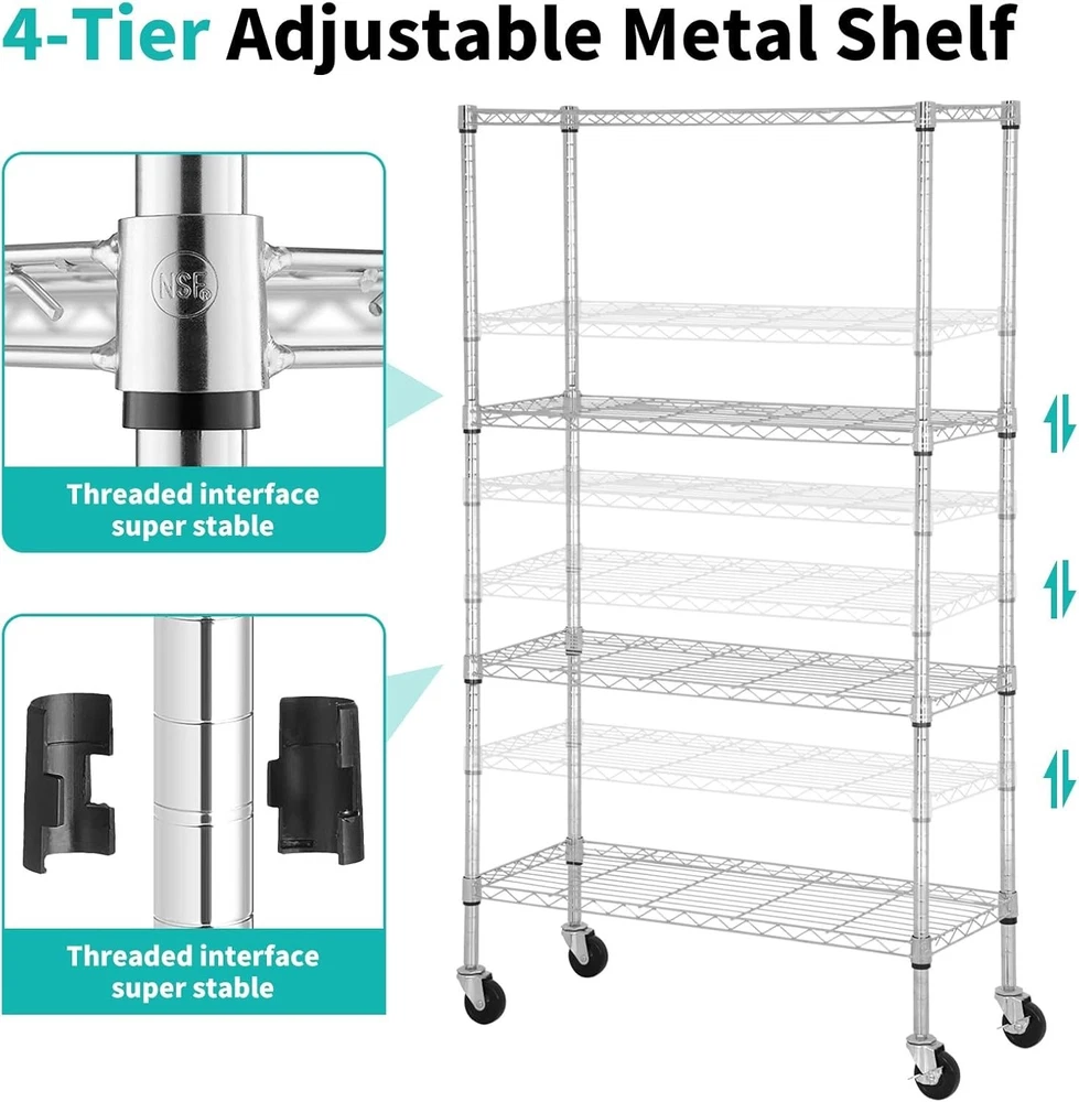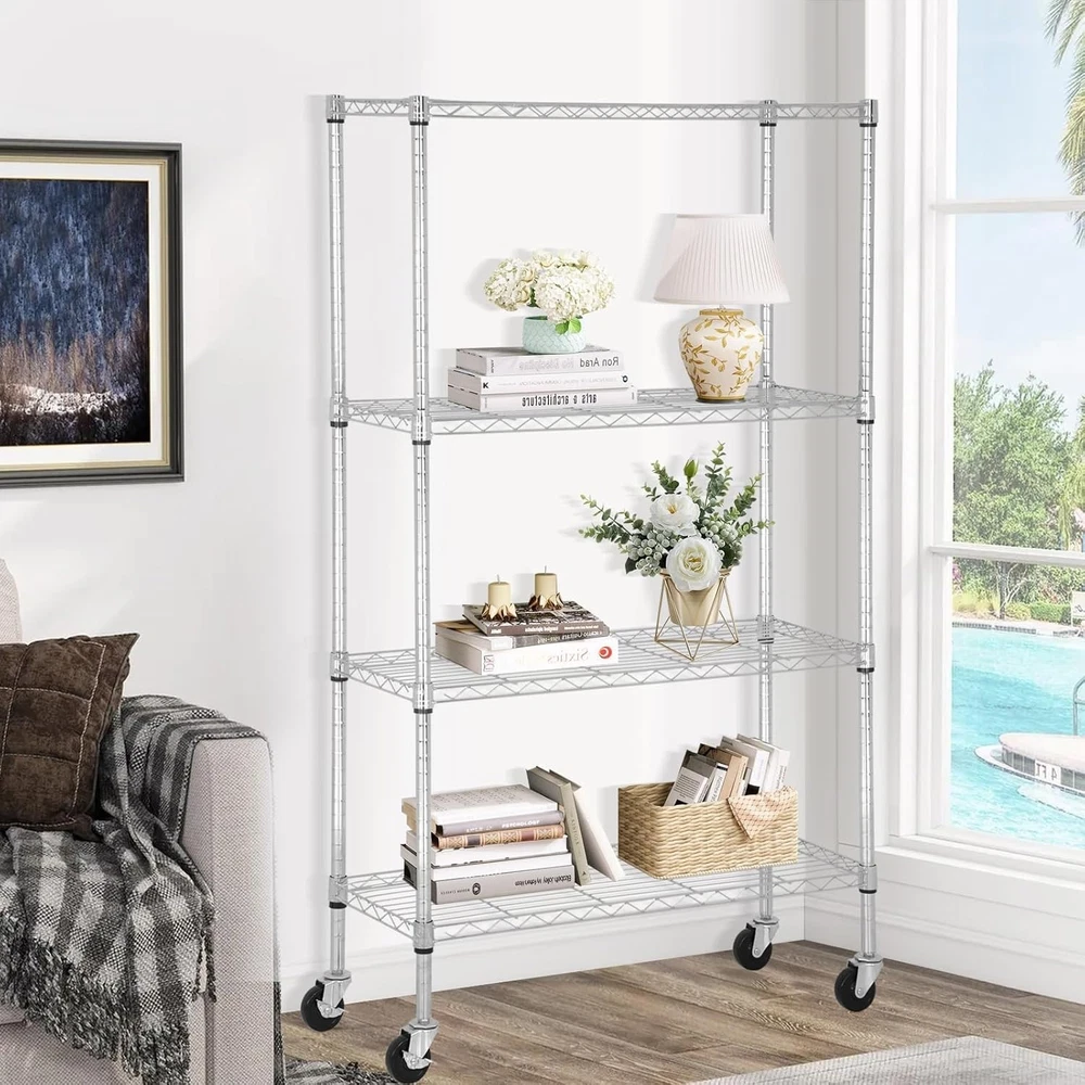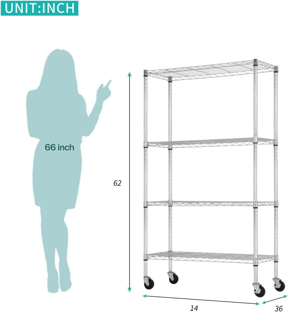 Storage Shelves with Wheels, Heavy Duty 4 Tier Garage Storage Rack, Adjustable Wire Shelving Unit, Metal Shelf Organizer for Pantry, Kitchen, Basement, 36" W x 14" D x 62" H, Chrome 【Heavy Duty Storage with Max Capacity】Constructed from high-strength steel, each shelf supports up to 350 lbs with leveling feet or 125 lbs with wheels, for a total load of 1400 lbs (stationary) or 500 lbs (mobile). Ideal for storing heavy tools, storage bins, and pantry supplies. 【Adjustable 4 Tier Wire Shelves】Each tier can be adjusted in 1-inch increments to fit large or small items. Create your ideal garage storage rack, pantry shelving, or laundry organization system. 【Mobile or Fixed – You Decide】Includes both 3” wheels (2 locking) and leveling feet. Easily convert between a rolling metal shelf and a stable unit for uneven floors in the basement or garage. 【Tool-Free 10 Min Assembly】No screws, no hassle. Snap-together design lets you assemble this storage rack in minutes. Clear instructions and safety caps included. 【Multi-Purpose Use Across Rooms】Ideal for garage storage shelves, kitchen pantry, bathroom, laundry, or office use. A versatile solution for anyone needing storage shelves heavy duty. ..