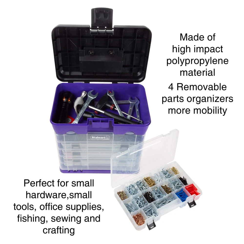 The Storage and Tool Box by is the spot storage solution you have been looking for! Equipped with 4 clear plastic storage boxes, as well as the large main storage section that's perfect for holding bigger items like tools, it has a spot for everything you need to keep organized. Each drawer is fully removable, constructed from durable polypropylene, and features a secure snap shut lid and 19 compartments. The drawers all slide in and out of the main unit for quick access and are locked in with a latched cover when not in use. The case also has a convenient handle for portability and easy travel. It's an excellent multi-purpose storage box that's perfect for everything from tools, hardware like nails, screws and bolts, to fishing tackle, beads, jewelry and crafting supplies! SATISFACTION GUARANTEED- is committed to providing the consumer with the absolute best price and value on all of our products, which we ensure by applying a rigorous quality control process. NOTE: This is an exclusive product of and ONLY Storage and Tool Boxes by are GUARANTEED to be genuine. IMPORTANT: Avoid buying counterfeit products and transacting with unauthorized sellers. Look for our logo on the packaging for every of our products.is a registered trademark protected by U.S. Trademark law and will be vigorously defended. 4 STORAGE BOXES- Equipped with 4 removable clear plastic storage boxes, as well as the large main storage section that’s perfect for holding bigger items like tools, this case has a spot for everything you need to keep organized. DURABLE- Constructed from durable, high-impact polypropylene, this case is a rugged and long-lasting option for all your storage needs. PORTABLE- With sturdy latches on all the compartments and a convenient carrying handle, this case is easily portable and travel friendly. There is also a plastic cover that latches over the front to keep the drawers contained and secure. MULTI-PURPOSE- This excellent multi-purpose storage case is perfect for everything from tools, hardware like nails, screws and bolts, to fishing tackle, beads, jewelry and crafting supplies! It’s the spot storage solution you have been looking for! PRODUCT DETAILS- Material: Polypropylene. Case Dimensions: (L) 12.25" x (W) 8.25" x (H) 12."; Tray Dimensions (4 Total): (L) 10.5" x (W) 6.25" x (H) 1.5"; Top Tray: (L) 12" x (W) 8" x (H) 3". Color: Purple, Black & Clear.