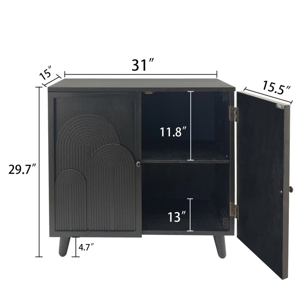 Modern Black Wood Storage Cabinet, 31in Accent Cabinet with Embossed Door for Living Room/Bedroom/Entryway Add both style and functionality to your home with our Modern Black Wood Storage Cabinet—your perfect solution for organized, elegant storage in any space! This 31-inch accent cabinet features a sleek black finish, unique embossed door design, and durable construction, making it a versatile addition to your living room, bedroom, entryway, or any area in need of extra storage and decorative flair. Key Product Details Origin: China Color: Classic Black (Timeless Finish for Any Decor) Material: High-Quality Engineered Wood & MDF Tabletop Weight Limit: 100 lbs Inner Shelf Weight Limit: 30 lbs Customization Service: Available! Please contact the Seller for detailed information about customization options. Assembly Required: Yes (Easy Setup with Included Instructions) Product Dimensions (Assembled) Length (Width): 31.00 inches Width (Depth): 15.00 inches Height: 31.70 inches Product Weight: 47.60 lbs Packaging Dimensions Length: 33.50 inches Width: 7.90 inches Height: 32.70 inches Packaging Weight: 52.00 lbs Why This Storage Cabinet Stands Out 📦 Spacious & Practical Storage Equipped with two interior shelves, this cabinet offers ample space to organize your belongings—11.8 inches for the upper shelf and 13 inches for the lower shelf. Perfect for storing books, decor items, electronics, linens, shoes, or personal essentials, keeping your space clutter-free while keeping items within easy reach. 📏 Compact & Versatile Size Measuring 31in (W) x 15in (D) x 31.70in (H), this cabinet is designed to fit seamlessly into both small and large spaces. Its compact profile doesn’t compromise on storage, making it ideal for apartments, condos, or houses—no more sacrificing style for functionality! 🎨 Unique Embossed Decorative Design Elevate your home decor with the cabinet’s modern geometric embossed patterns on the door. This distinctive detail adds an elegant, sophisticated touch, turning a simple storage cabinet into a statement accent piece that complements any modern, contemporary, or minimalist interior style. 💪 Durable & Stable Construction Crafted from high-quality engineered wood and MDF, this cabinet is built to last. It features strong solid wood legs (4.7 inches in height) that provide exceptional stability, ensuring the cabinet stays sturdy even when fully loaded. With a 100-lb tabletop weight limit and 30-lb inner shelf weight limit, it’s designed to handle your daily storage needs. 🏠 Versatile Placement Options This multi-functional cabinet is more than just storage—it can be used as an accent cabinet, sideboard, nightstand, or entryway storage unit. Place it in your living room to hold decor and media items, in your bedroom as a stylish nightstand, or in your entryway to store shoes and keys—its versatility fits all your needs. 🔧 Easy Assembly No need for professional help! The cabinet comes with simple, clear instructions, making assembly hassle-free. You’ll have your new storage cabinet set up and ready to use in no time. Our Commitment to You ✅ 1-Year Quality Guarantee: We stand behind the craftsmanship of our storage cabinet. Enjoy a 1-year warranty against manufacturing defects, giving you peace of mind with your purchase. ✅ 30-Day Free Return & Exchange: Not completely satisfied with your cabinet? We offer a 30-day free return and exchange policy—shop with confidence, risk-free! Upgrade your home with this stylish, durable, and versatile storage cabinet that combines functionality with decorative charm. Plus, with customization available and our worry-free after-sales service, it’s the perfect addition to your space. Add to cart today!