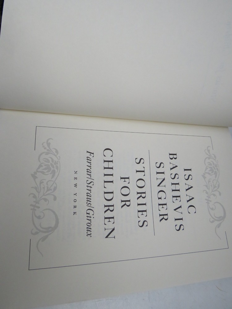 ◆ Book for Sale - Stories For Children by Isaac Bashevis Singer 1986 ◆ Author - Isaac Bashevis Singer ◆ Date - 1986 ◆ Publisher - Farrar/Straus/Giroux ◆ Place of Publication - New York ◆ Format - Hardcover ◆ Condition - Near Fine ◆ Condition Description - Very slight staining to upper dark blue front board. Private library sticker on inside front board. Bright, clean pages throughout. A few small marks to page edges. ◆ Height of Book - 24 cm ◆ Page Number - 338