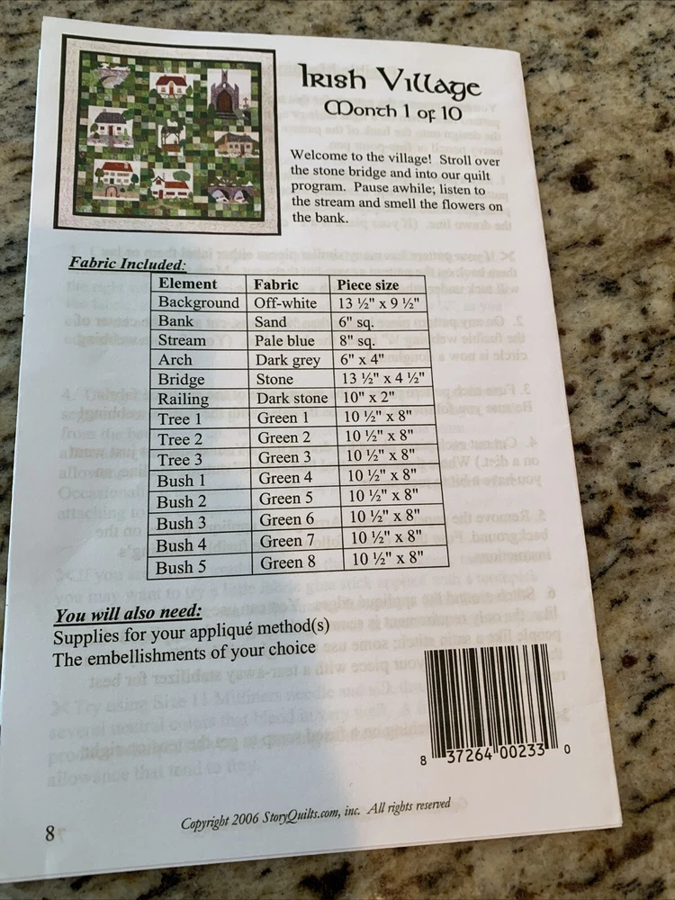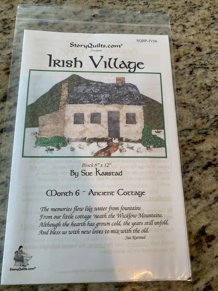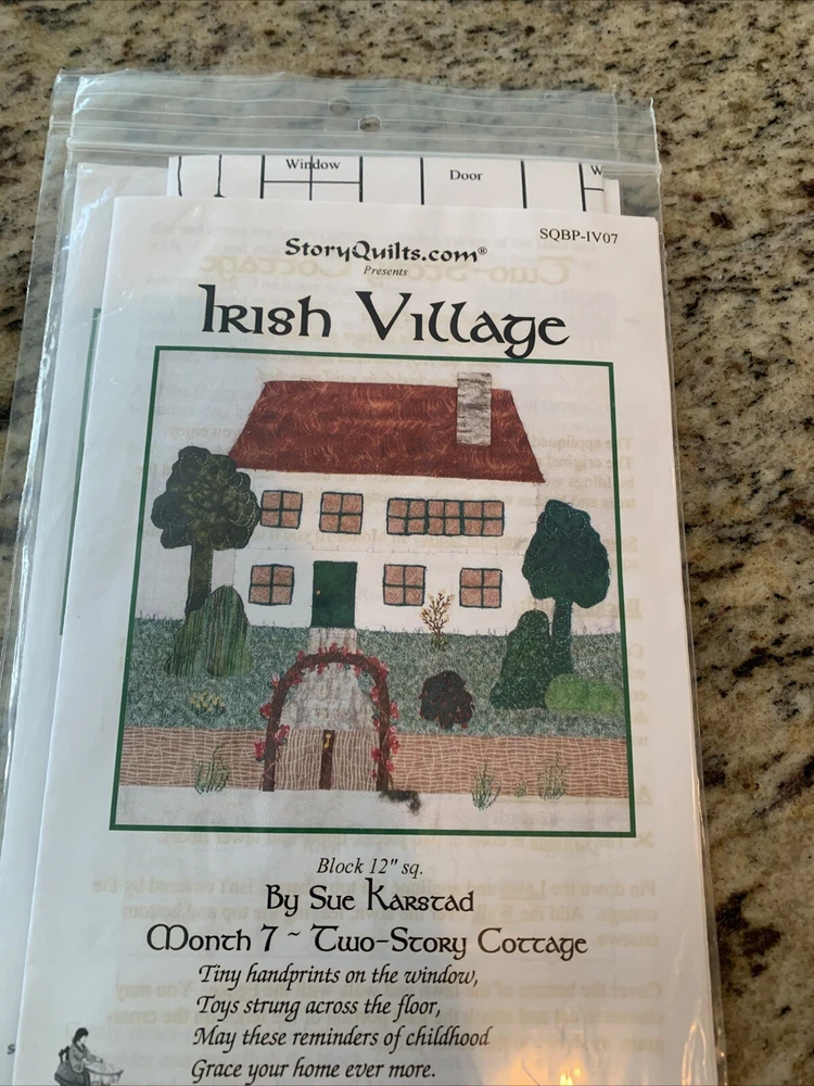 Story Quilts Irish Village St Of Ten Patterns For Appliquéd Quilt 8”x12” blocks Bridge to the village Red-door cottage Church Willow cottage Village well Ancient cottage Two-story cottage Gabled cottage Bridge from the village The last packet is for assembly and the borders.