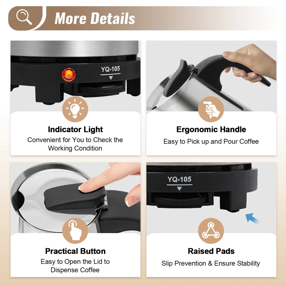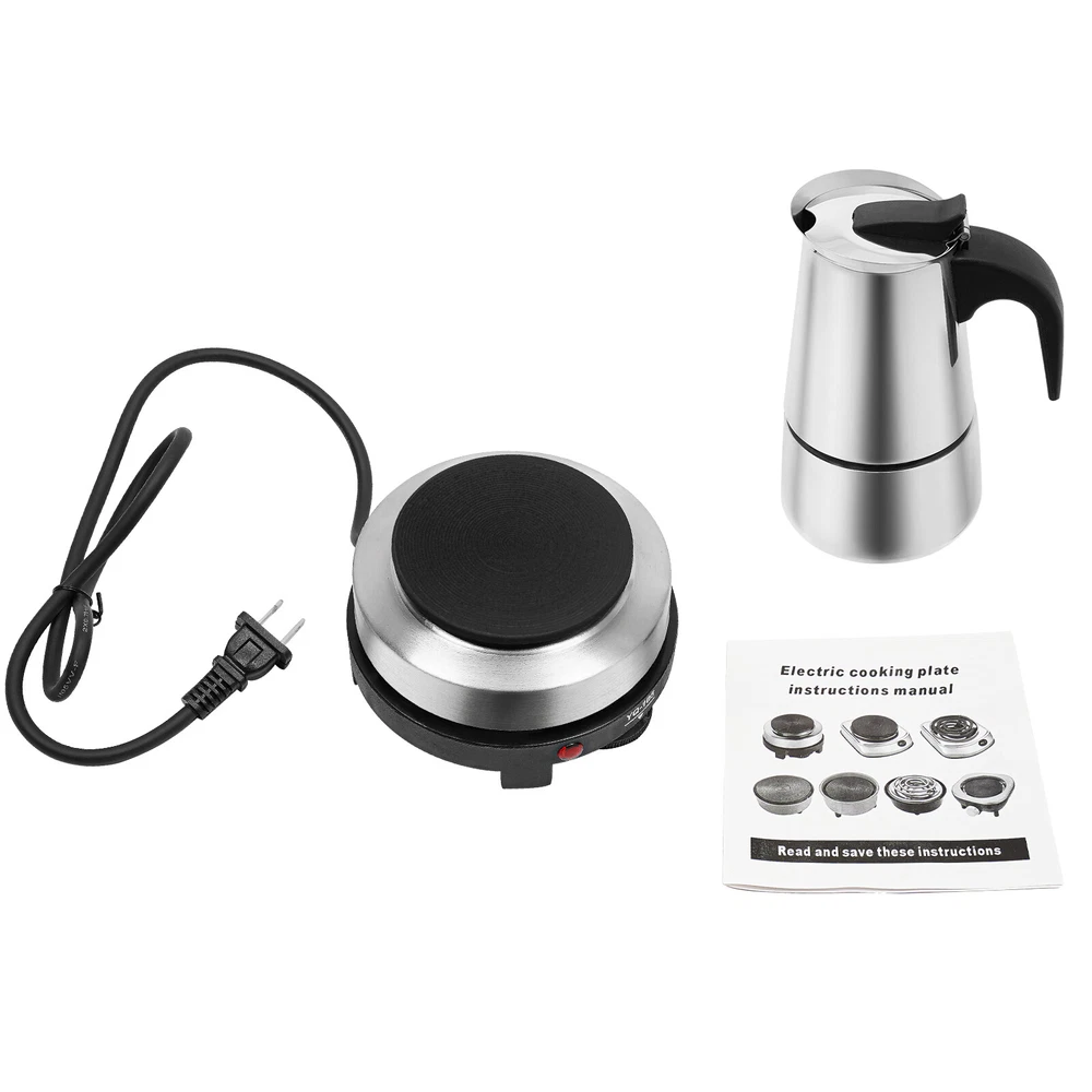 How to Use 1. Grasp the body and turn the top and bottom parts. 2. Take out the filter. 3. Fill the lower part with water, not exceeding the safety valve. 4. Fill the filter with ground coffee(not included) and scrape it with a spoon(not included), and please do not compact it. You can stick one piece of filter paper(not included) on the filter. If you do not have filter paper, you can leave it on. 5. Turn the upper and lower parts tightly, adjust the temperature of the stove, and put the espresso maker on the electric stove to heat up. 6. Wait for the coffee to be ready. Specifications Material: Stainless Steel Model: YQ-105 Color: Silver Process: Polishing and Sandblasting Power Source: Corded Plug Type: US Standard Mount Type: Countertop Operation Type: Manual Capacit 4 Cups 200ml Espresso Maker Moka Coffee Pot With Electric Stove Stainless Steel How to Use 1. Grasp the body and turn the top and bottom parts. 2. Take out the filter. 3. Fill the lower part with water, not exceeding the safety valve. 4. Fill the filter with ground coffee(not included) and scrape it with a spoon(not included), and please do not compact it. You can stick one piece of filter paper(not included) on the filter. If you do not have filter paper, you can leave it on. 5. Turn the upper and lower parts tightly, adjust the temperature of the stove, and put the espresso maker on the electric stove to heat up. 6. Wait for the coffee to be ready. Specifications Material: Stainless Steel Model: YQ-105 Color: Silver Process: Polishing and Sandblasting Power Source: Corded Plug Type: US Standard Mount Type: Countertop Operation Type: Manual Capacity: 4 Cups(About 200ml/6.76oz) Temperature Setting Range: 0-200°C/32-392℉(5 Gears) Voltage: 110V, 50/60Hz Power: 500W Coffee Pot Size(D*H): 8.5*17.5cm/3.35*6.89in Stove Size(D*H): 13.5*7.5cm/5.31*2.95in Stove Heating Diameter: 10cm/3.94in Gross Weight: 1.6kg/3.53lb Package Size: 24*16*11cm/9.45*6.3*4.33in Package Included 1* Coffee Pot 1* Stove 1* English Instruction Manual Key Features Build to Last: It consists of high-quality stainless steel with polishing and sandblasting processes, making it safe and durable, which helps maintain the original flavor of the coffee. Powerful Function: With the powerful power of 500W, adjustable temperature from 32-392℉ with 5 gears, it can make different flavours of coffee for you efficiently and satisfy you and your family's taste buds. High Safety: The safety valve can be used to control the water pressure and remind you of the water level, thus ensuring the quality of espresso. In addition, the cooling holes at the bottom of the stove can dissipate the heat in time, ensuring the stability and safety of the product when in use. Enjoy Coffee Time: With a cup capacity of around 6.76 ounces, you can brew up to 4 cups of delicious coffee at a time, while the integrated filter incorporates the finest grinds and all the flavors into the final result, giving you a wide range of brewing options for you and your family to enjoy. Cost-saving: With it, you can experience the fun process of making coffee and making great-tasting coffee on your own without the time-consuming and costly expense of going out and buying coffee! Moreover, the reusable filter reduces the frequency of changes. Easy to Clean: Thanks to its smooth surface, and simple construction, you can just rinse it off with water! Ideal Gift: You can give it as a gift to your coffee-loving family, colleagues, and friends on Christmas, Thanksgiving, birthdays, etc. Simple Installation: The product is almost assembled, you put the coffee pot on the stove and plug it in and use it, very time-saving and convenient! Details Indicator Light: The red indicator light shows the heating status, which is convenient for you to check the working condition of the product. Ergonomic Handle: It makes it easy to pick up and pour your coffee. Practical Knob: The knob on the lid makes it easy to open the lid to dispense coffee. Raised Pads: The raised pads on the bottom of the stove have a non-slip effect and ensure stability. Application The coffee pot can be heated on open fires, gas stoves, alcohol stoves and electric ceramic stoves, while the stove is suitable for stainless steel kettles, aluminum kettles, iron kettles, single-layered glass teapots, single-layered stainless steel kettles, single-layered milk jugs, single-layered stainless steel cups and single-layered glass cups. It is suitable for offices, bars, restaurants, lounge bars, cafes, teahouses and so on. It can make coffee, tea, etc. Notes Please check the size carefully before ordering. When using it, please ensure the temperature is not too high, otherwise, the coffee will splash out. Please do not hold the handle when turning the pot to avoid breaking the handle. Please do not add more water than the safety valve. Please always allow the coffeemaker to cool down before opening it to wash. Please wash the machine by hand and use filtered water to make coffee. Please strictly follow the English instruction manual for use, and pay attention to the safety matters inside. Please allow the slight color difference caused by the shooting light and 1-3cm error due to manual measurement, and make sure you do not mind before you order. Payment Delivery details Terms of sales About us Contact us Payment We accept ebay payment 。 Fees such as import duties, taxes are not included in the item price or shipping costs. These charges are the buyer's responsibility. Delivery details Shipping: 2-9 working days to: USA Terms of sales We maintain high standards of excellence and strive for hundred percent customer satisfaction. Feedback is very important to us. We hope that you contact us immediately before you give neutral or negative feedback, so that we can address your concerns. It is impossible to address issues if we do not know about them! About us Your satis faction is our ultimate goal. We work hard to earn your trust and future business. Our ce