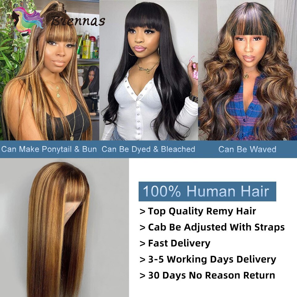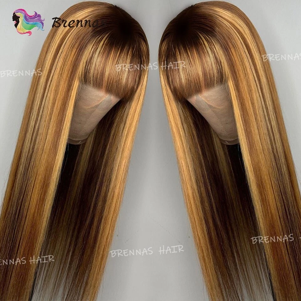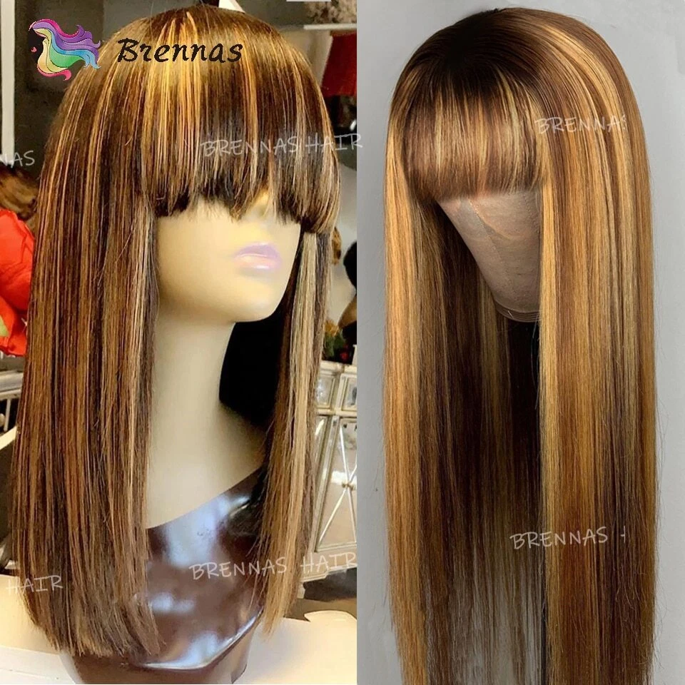 Ombre Human Hair Wigs Highlight Straight Wig With Bangs Glueless Machine Made Wigs 100% Peruvian Human Remy Hair For Black Women Hair Color: Highlight honey blond color Hair Material: 100% Human Hair Hair Density: 150% 180% Density Available for Your Choice Capsize: Medium default Cap color: Medium Brown default Baby Hair and Bleached Knots : Yes Cheap Machine Made Wig Isee Hair Unice Hair Easy To Wear Human Hair Wigs Natural Hairline: Yes
