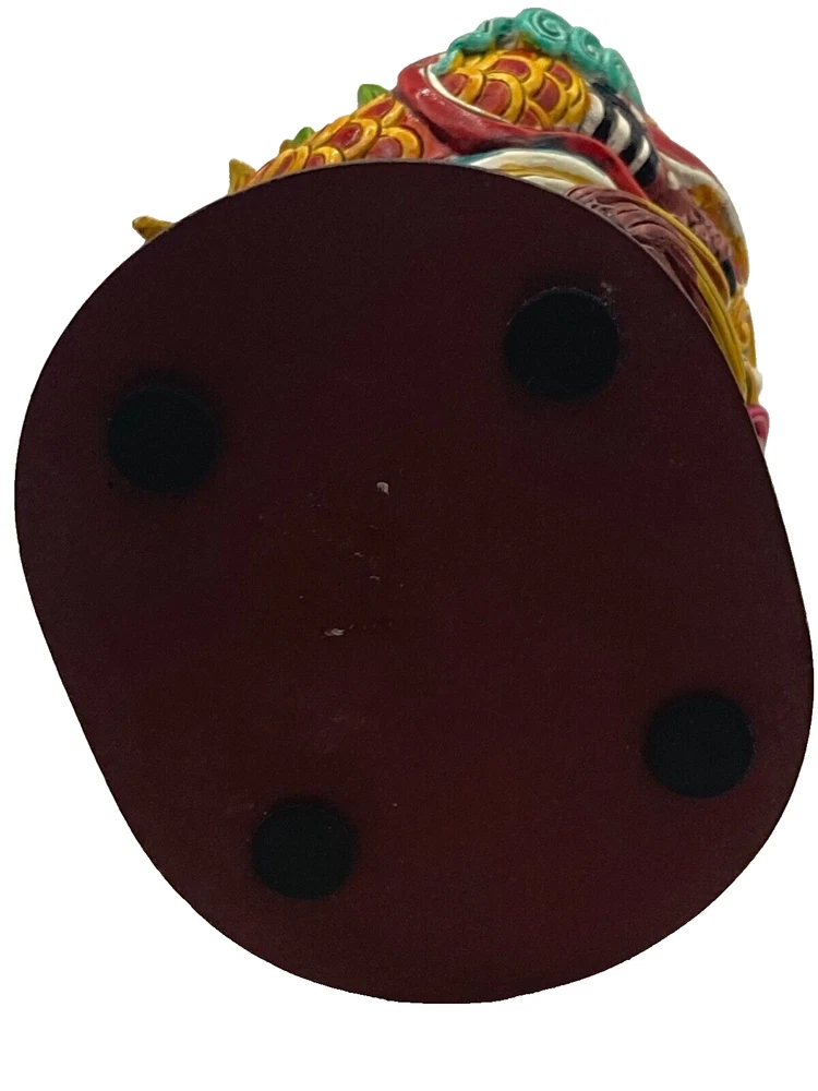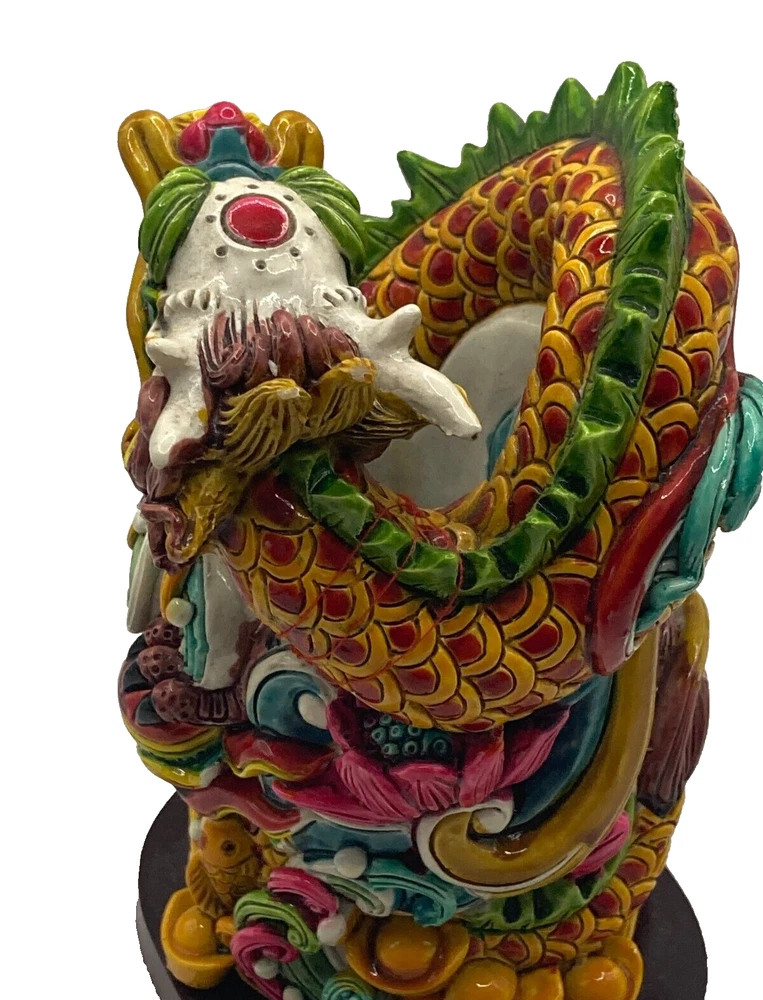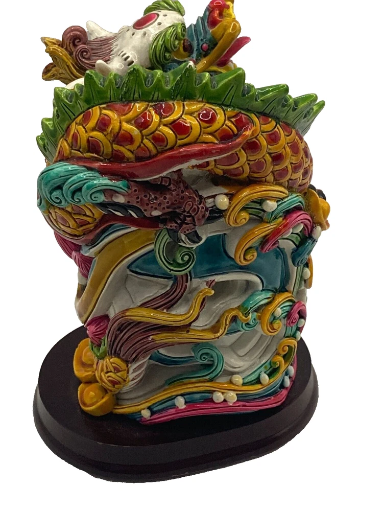 Chinese Dragon Sculpture Ornament Figurine H: 14 cms approx. 840 grams approx. Ceramic with a wood base. VGC. No chips or damage.