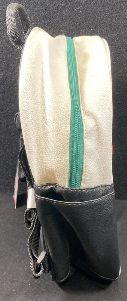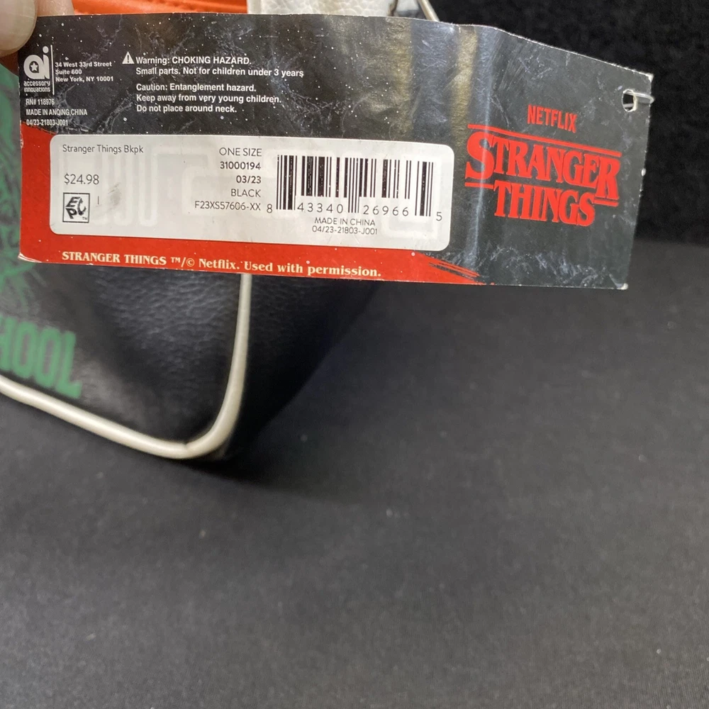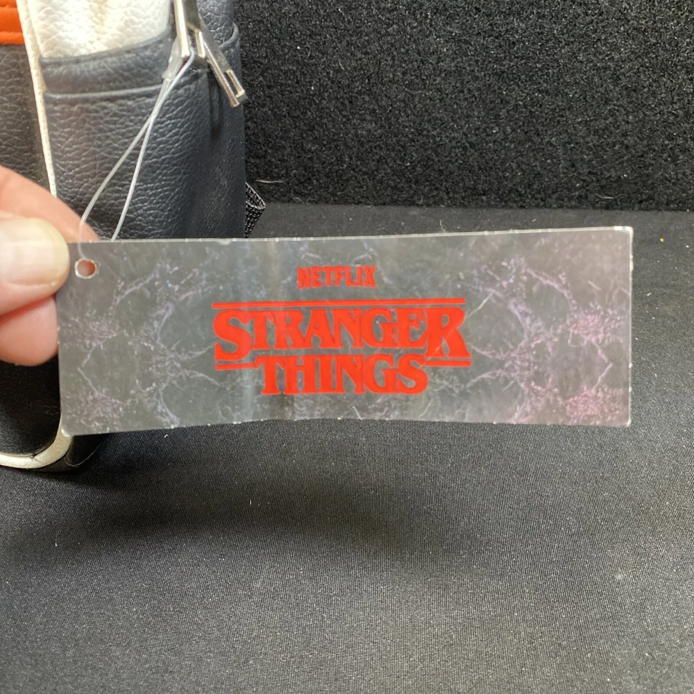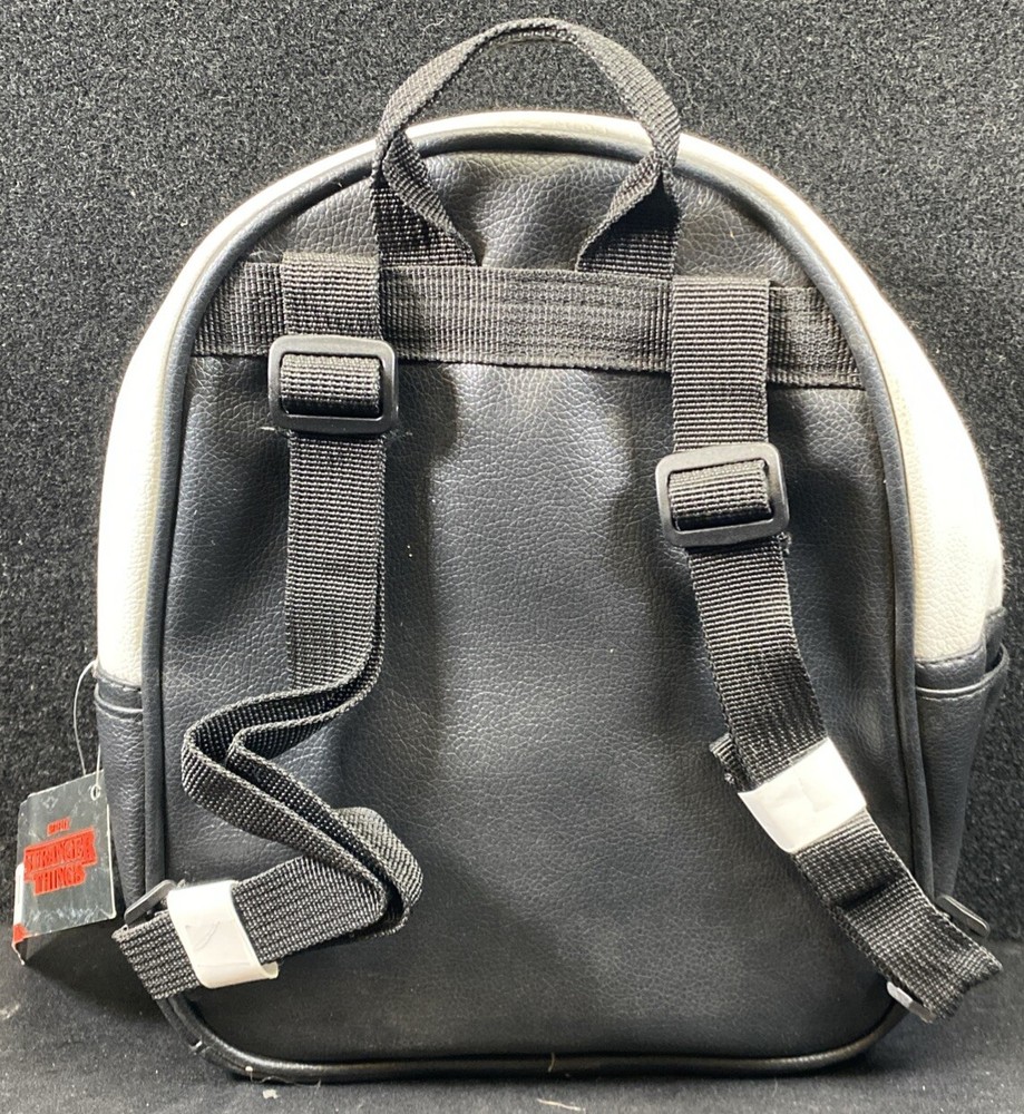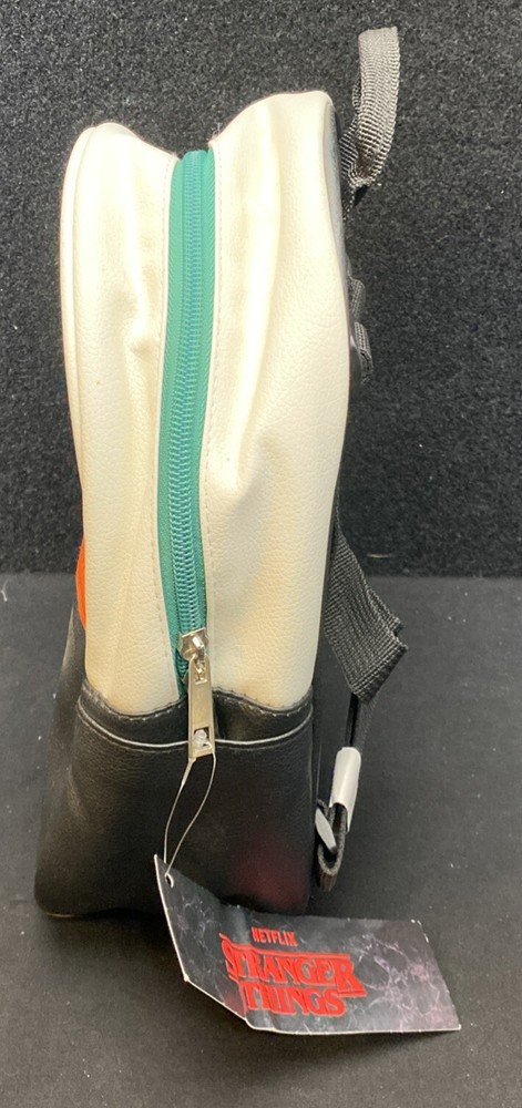This Netflix Stranger Things Hawkins High School Adult Mini Backpack features a multicolor print with a Hawkins High School design, inspired by the TV show "Stranger Things." The backpack is designed in a rectangular shape with a zip closure and measures 11 inches in height, 9 inches in width, and 4 inches in depth. It has a black handle/strap, black lining, and is made of faux leather, polyester, and leather materials. This mini backpack is a stylish accessory for fans of the show, offering a compact yet fashionable option for carrying essentials.