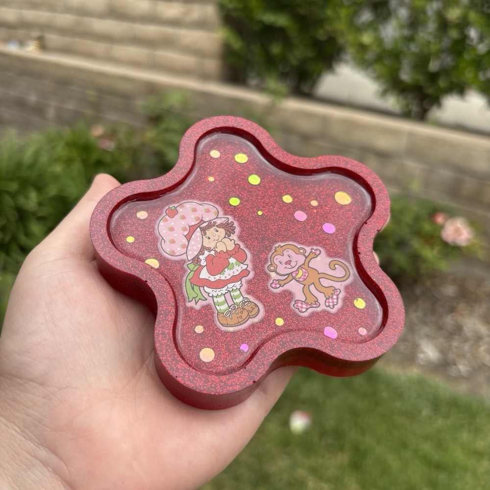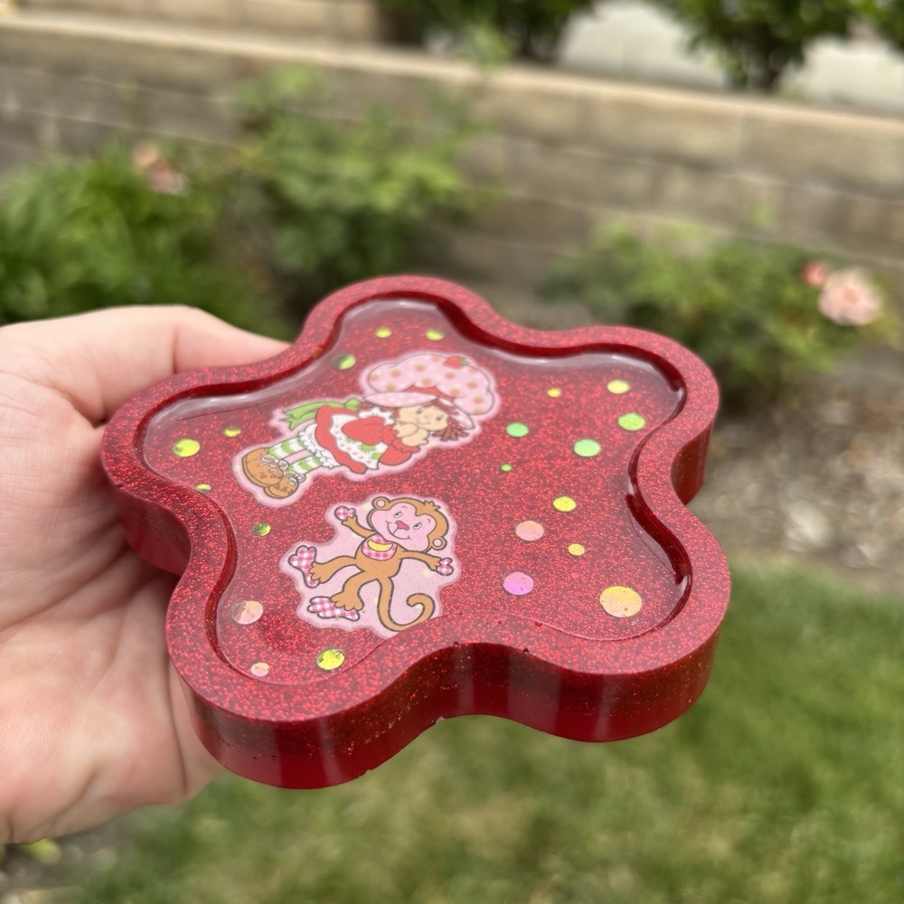 ‘Strawberry Disco’ Strawberry Shortcake Inspired Rhubarb Monkey and Reflective Dotted Red Sparkly Flower Shaped Resin Coaster Handmade by Shop EarthySmurf. *Please note, resin is an imperfect art. Craters, holes, sharp edges, bubbles and more may be present in your piece. Please examine all pictures*