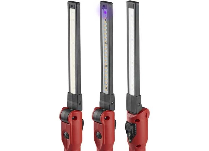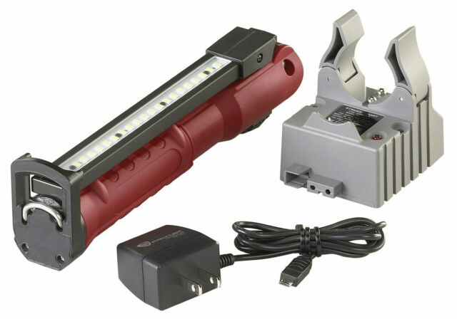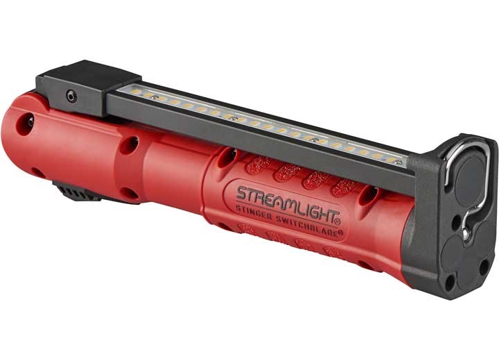 Authentic Streamlight 76801 Stinger Switchblade red multi-function work light with 180 degree rotating light bar features dual charging options: USB or existing Stinger chargers (included), High CRI LEDs with Color-Rite Technology, UV LEDs for leak detection, Cool White LEDs for bright light, enhanced hook with multiple options, stronger tail-end magnet, drop light, hands-free light, IPX4 Water-Resistant, Chemical-Resistant Lens, folds for storage and has a limited lifetime warranty. Brand new.