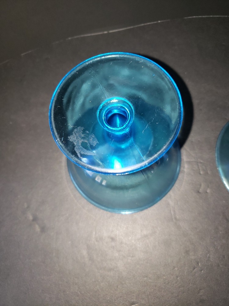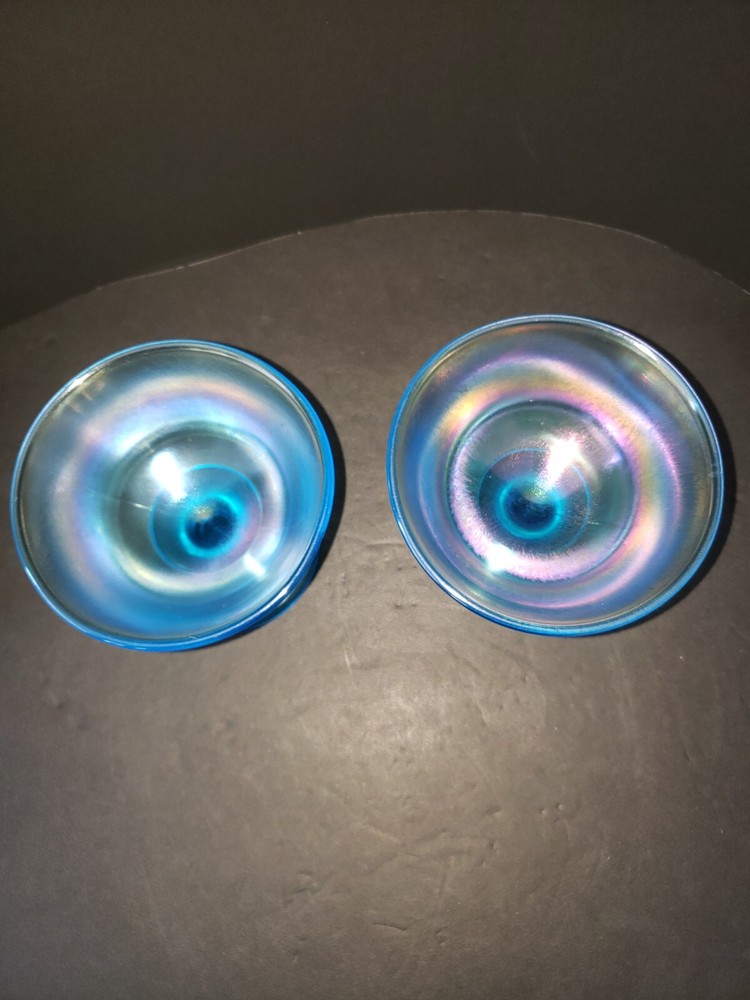The product is a set of two Fenton Celeste Blue stretch glass sherbet or champagne glasses, measuring 3.5 inches in height. These mid-century modern glasses showcase Fenton's signature production style of stretch glass, known for its unique and elegant design. The deep blue color adds a touch of sophistication to any drinkware collection, making them a stylish and practical addition for serving champagne or cocktails in a retro-inspired setting.