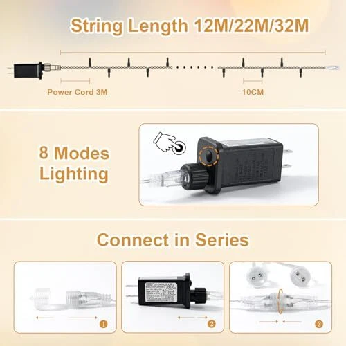Light Color: Warm White Theme: Christmas Indoor Outdoor Usage: Outdoor, Indoor Special Feature: Twinkling, Connectable EAN: Does Not Apply Power Source: Corded Electric Color: Warm White Item Width: 4.17 MPN: Does Not Apply Type: Does Not Apply Package Dimensions: 7.05 x 4.17 x 4.13 inches; 1.3 Pounds Item Height: 4.13 Manufacturer: Does Not Apply seller: Does Not Apply Style: Modern Brand: Does Not Apply Light Source Type: LED UPC: Does Not Apply Size: 105FT 320LED Item Length: 7.05 Date First Available: July 2, 2024 Item model number: MA-LDC32M320L Occasion: Christmas, Wedding, Anniversary, Birthday gtin13: Does Not Apply Country of Origin: China