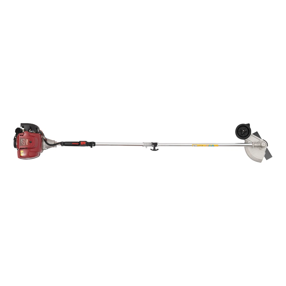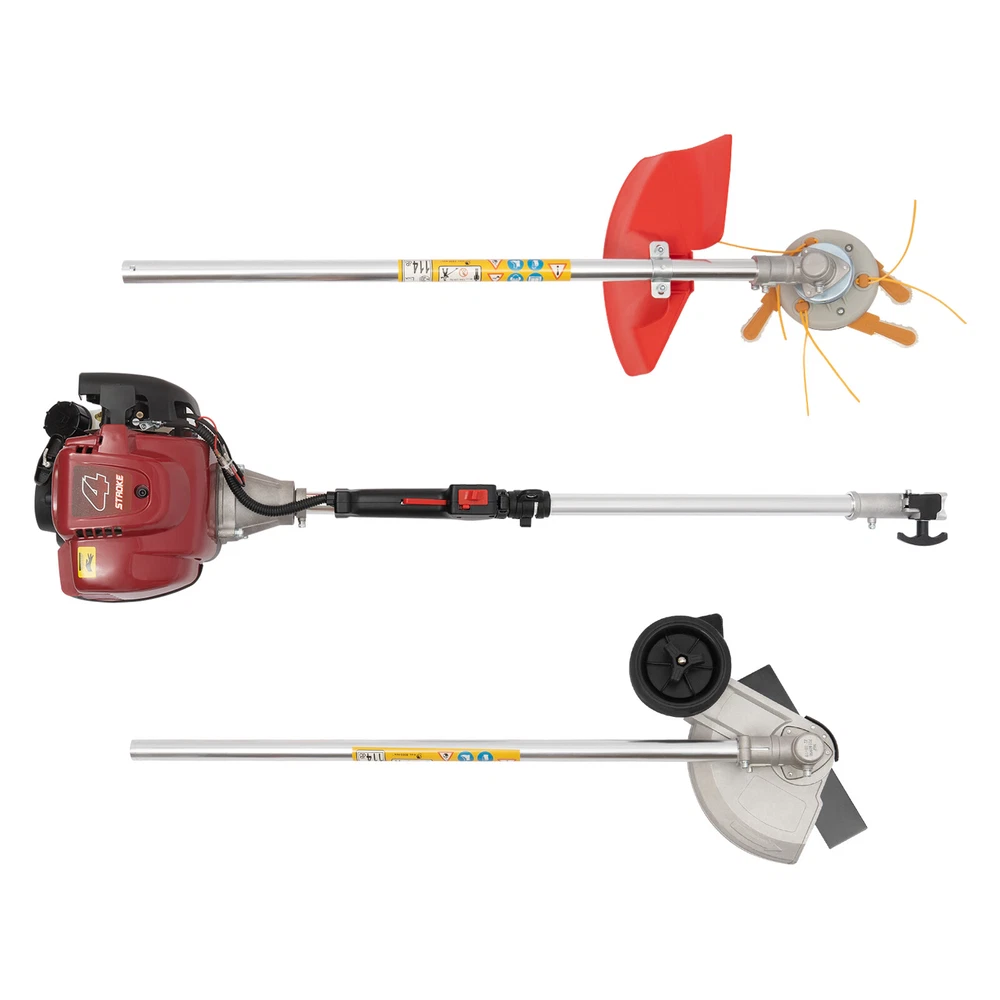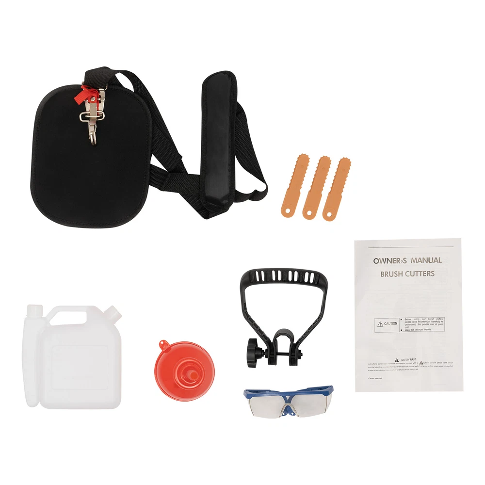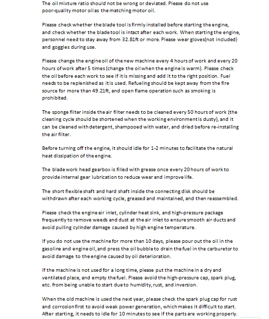 Key Features Sturdy and Durable: This product is mainly made of PP, aluminum alloy, manganese steel, and nylon, with high hardness, high abrasion resistance, anti-corrosion, anti-rust performance, and long service life. High Power: The high-quality engine with 35.88CC displacement and power up to 0.75kw provides the product with super high speed (8500r/min ), thus effectively improving your working efficiency. Two Blade Heads: The 2T cutting edge blade head with a roller is suitable for paddy pool ridge, crop field, etc. The multi-purpose mowing head is suitable for orchards, vineyards, etc., which can avoid accidentally injuring or cutting saplings when mowing. High Comfort: The cordless design and gasoline power source make this product more suitable for outdoor use without String Trimmer Cordless Edger &Weed Trimmer 35.88CC 4-Stroke Brush Cutter Garden Key Features Sturdy and Durable: This product is mainly made of PP, aluminum alloy, manganese steel, and nylon, with high hardness, high abrasion resistance, anti-corrosion, anti-rust performance, and long service life. High Power: The high-quality engine with 35.88CC displacement and power up to 0.75kw provides the product with super high speed (8500r/min ), thus effectively improving your working efficiency. Two Blade Heads: The 2T cutting edge blade head with a roller is suitable for paddy pool ridge, crop field, etc. The multi-purpose mowing head is suitable for orchards, vineyards, etc., which can avoid accidentally injuring or cutting saplings when mowing. High Comfort: The cordless design and gasoline power source make this product more suitable for outdoor use without the need for connecting cables and electricity, with high flexibility. The adjustable position of the handle allows you to control its direction freely and conveniently, thus making mowing easier and more precise. Easy to Carry and Store: The carrying strap allows for easy carrying while lightening the load on your hands. Its detachable design ensures convenient storage when not in use. Safety Protection: The throttle safety lock prevents accidental touching of the accelerating throttle and causing an accident to ensure the safety of users during operation. Efficient Heat Dissipation: The multiple heat dissipation holes on the engine can effectively speed up the heat dissipation inside the engine, thus guaranteeing the efficient and smooth running of the engine. Simple Assembly: Thanks to the long pole with a fastener design, complete installation components, and a detailed English manual, you can assemble this product or replace the blade heads easily and quickly. Protective Shipping: Multiple packaging of foam shafts, bubble wrap, plastic bags, sponges, and rigid cardboard boxes can protect the product from wear and tear during shipping so that you can receive an almost non-destructive product. Details Large Fuel Tank: The 22&2.7 oz fuel tanks ensure long-term use without frequent refueling. Grass Baffle: It can effectively prevent the broken grass from splashing around when mowing the lawn, thus making it easier to clean up the lawn after mowing and ensuring your safety. Funnel: The red funnel makes it easier to add fuel and less likely to leak. Starting Method 1. Just add four-stroke gasoline engine oil to the oil tank to the bottom thread. 2. Add 93 unleaded gasoline to the fuel tank. 3. Press the oil bubble to pump oil until the oil bubble is full of fuel and the fuel return pipe returns oil. 4. Put the flameout switch in the "I" position (0 for flameout, I for start). 5. Toggle the damper upward to close the damper (hot start does not need to close the damper). 6. Pull the starter puller at a constant speed until it starts (if there is a start response after pulling 5 times but it fails to start, please pull the damper to the following to open the damper in pulling). 7. After the engine starts, pull the damper to the bottom to open the damper, slowly pull the throttle trigger, lightly add oil to the throttle and test whether it is normal. Application This product is mainly used for home lawn mowing, orchard mowing, tea garden mowing, cutting rice and wheat, cutting corn stalks, reed harvesting, pond side weed removal, bushes cutting, etc., and mostly used in agriculture, forestry, landscaping, and urban greening. Specification Color: Red, Silver Material: PP, Aluminum Alloy, Manganese Steel, Nylon Assembly Required: Yes Usage: Side-mounted Displacement: 35.88CC Power: 0.75kw Rotation Speed: 8500r/min Idling Speed: 2800-3000r/min Engine Type: 4-stroke Gasoline Engine Carburetor Type: Diaphragm Carburetor Gasoline Tank Volume: 650ml/22 Oz Oil Tank Volume: 80ml/2.7 Oz Engine Size: 26*22*27cm/10.24*8.66*10.63in Product Length: 1.75m/5.74ft Gross Weight: 8.5kg/18.74 lbs Package Size:105*25*25 cm/41.34*9.84*9.84 in Package Included 1 * Weed Wacker 1 * Oil Pot 1 * Funnel 1 Pair* Goggles 1 * Carrying Strap 1 * English Manual All Accessories for Installation Notes The oil mixture ratio should not be wrong or deviated. Please do not use poor-quality motor oil as the matching motor oil. Please check whether the blade tool is firmly installed before starting the engine, and check whether the blade tool is intact after each work. When starting the engine, personnel need to stay away from 32.81ft or more. Please wear gloves(not included) and goggles during use. Please change the engine oil of the new machine every 4 hours of work and every 20 hours of work after 5 times (change the oil when the engine is warm). Please check the oil before each work to see if it is missing and add it to the right position. Fuel needs to be replenished as it is used. Refueling should be kept away from the fire source for more than 49.21ft, and open flame operation such as smoking is prohibited. The sponge filter inside the air filter needs to be cleaned every 50 hours of work (the cleaning cycle should be shortened when the working environment is dusty), and it can be cleaned with detergent