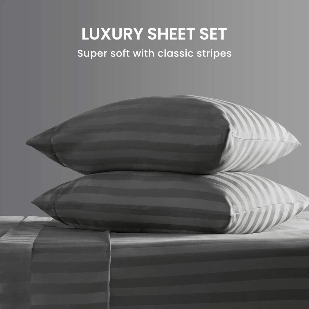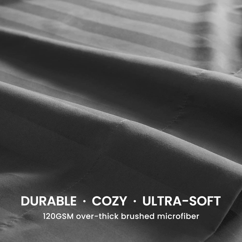 120g Damask Stripe Bed Sheet Sets Soft Wrinkle Free Fade Resistant easy LUXURY - We use yarns with advanced satin weaving craftsmanship, washing process to create this bed sheets. The satin width is more than 1 inch, presents different matte finish and lustrous colors under the light, adding extra elegance and luxury to your bedroom. Classic colors in White, Navy Blue, Grey and Stone Blue offer you timeless elegant looks and easy to match with your traditional and contemporary home decor TEMPERATUE REGULATION - Fabric treated with NANOTEX Coolest Comfort Technology. The advanced moisture-wicking fabric dries 100% faster than cotton, actually balances your body temperature, pulling moisture away from your skin out to the fabric's surface, moisture can more easily evaporate and gives superior comfort against your skin without extra heat and sweat. Leave you feeling refreshed and rejuvenated. It will keep you cool in the summer and warm in the winter ULTRA SOFT & COZY - The 120gsm over-thick, and ultra-soft double brushed microfiber fabric is thicker, softer and more durable than most market's 90gsm and 110gsm products. The excellent softness makes it very comfortable. Quality craftmanship keeps it more stable and durable. The sheets will provide you with the utmost soft and cozy sleeping experience DEEP POCKET & PRECISION FIT - Deep pocket fits mattresses up to 16 inches deep, perfect for oversized mattresses. All around covered by elastic to ensure the sheets stay on bed and not slip off or move around. Shrink and wrinkle resistant. Machine wash cold, do not use bleach, tumble dry low SIZE INCLUDE - Twin size includes 3 pieces - 1 Flat Sheet 66x 96 inch, 1 Fitted Sheet 39x75 inch, 1 Pillow Case 20x30 inch. Full size includes 4 pieces - 1 Flat Sheet 81x 96 inch, 1 Fitted Sheet 54x75 inch, 2 Pillow Case 20x30 inch. Queen size includes 4 pieces - 1 Flat Sheet 102x 90 inch, 1 Fitted Sheet 80x60 inch, 2 Pillow Case 20x30 inch. King size includes 4 pieces - 1 Flat Sheet 102x 105 inch, 1 Fitted Sheet 80x78 inch, 2 Pillow Case 20x40 inch