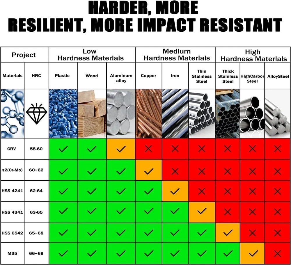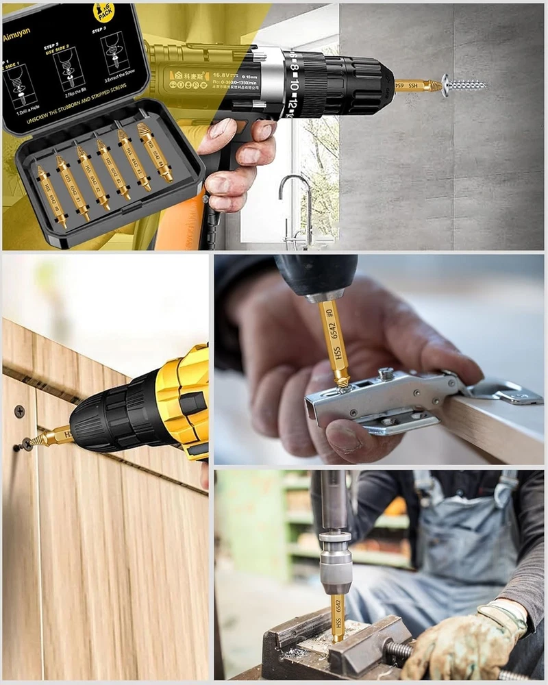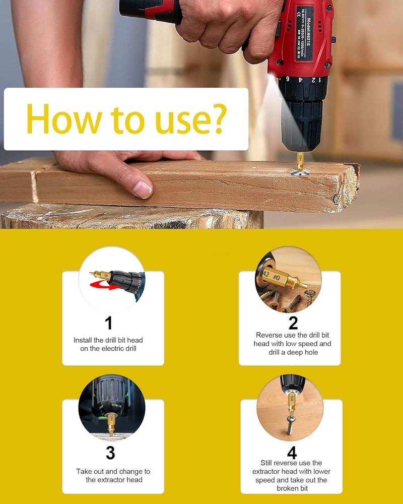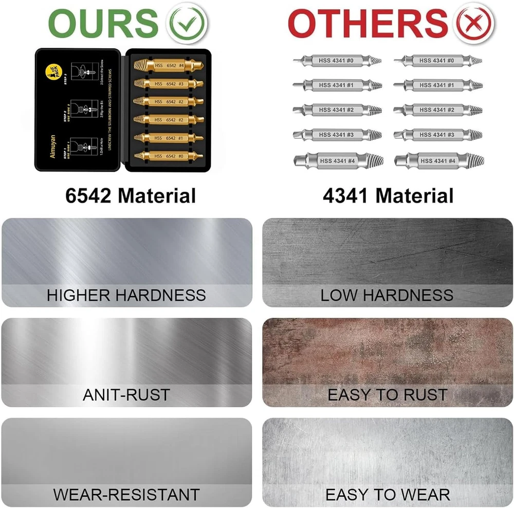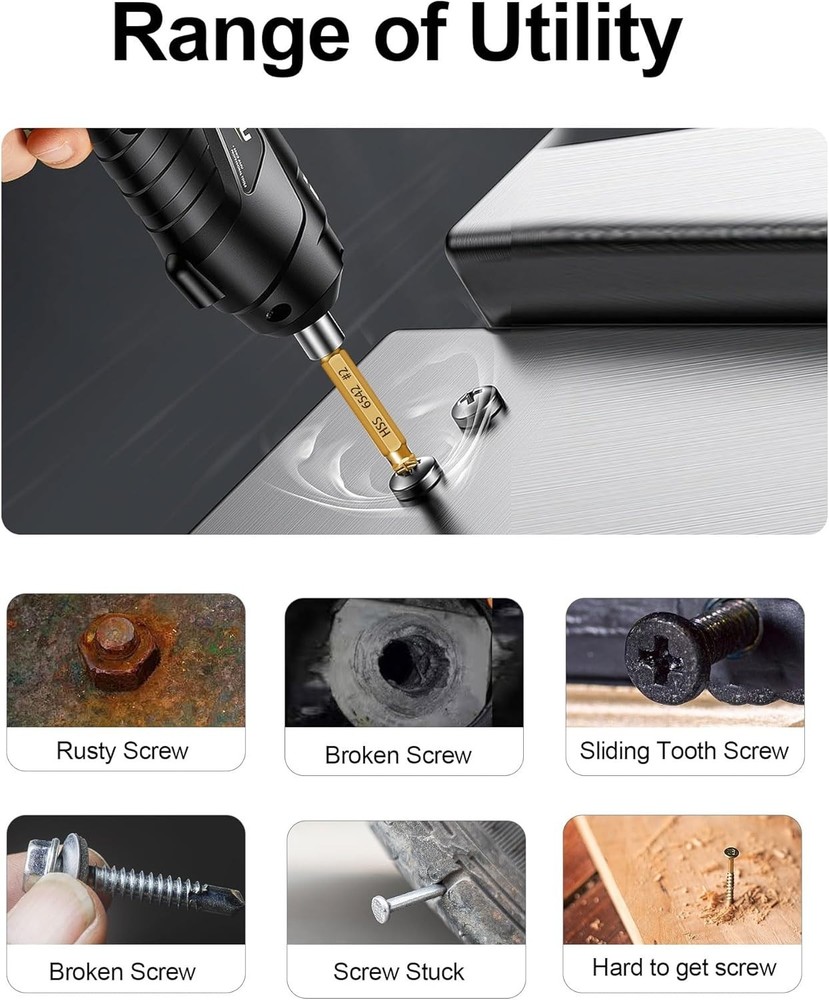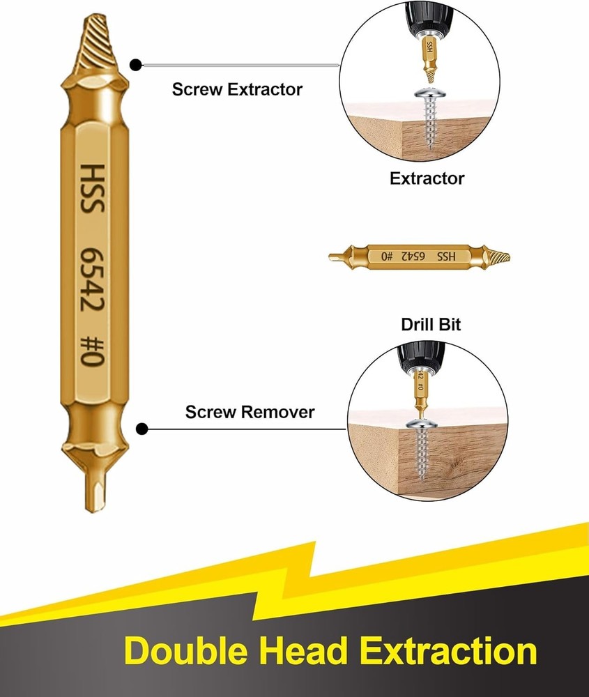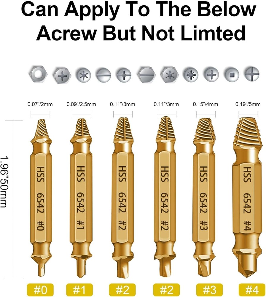 Damaged Screw Extractor Set- 6 psc HSS 6542 Stripped Screw Removal Tool, Stripped Screws Nuts & Bolts Drill Bit Tools for Easy Removal of Rusty & Broken Bolt Extractor Kit, Christmas Gifts for Man 【HHS 6542 Material】Unlike ordinary materials, our screw extractors set made from HSS 6542 material possess remarkable strength and heat resistance. This superior material excels in extracting screws from a wide range of higher hardness metals, including stainless steel, iron, copper, aluminum alloys, and wood.The strength HSS 6542 is much higher than HSS 4341,improve work efficiency. 【Efficient Design】Tailored for extracting screws and bolts, each bit boasts a double head design. One end drills a central hole in damaged screws or bolts, while the other end extracts them with ease. Others Only can drill the hole or removal the screw. 【Multi-Size for Multi-Choose】Our set offers versatile solutions with models 0, 1, 2, 3, and 4, with Model 2 as the frequent choice, provided in pairs. This comprehensive selection addresses various damaged screws and bolts, conveniently housed in a sturdy case for organized transport. works with any drill and any size screw or bolt. Choosing the right size extractor is crucial for successful stripped bolt remover. 【Easy Use】Two easy steps 1: Create a deeper hole in the damaged screw or bolt by using the screw remover head. 2: Convert screw remover head to screw extractor head and take out the broken screw or bolt.Remember, The drill must be operated in the reverse direction when pulling out, maintain a consistently low speed for optimal results.