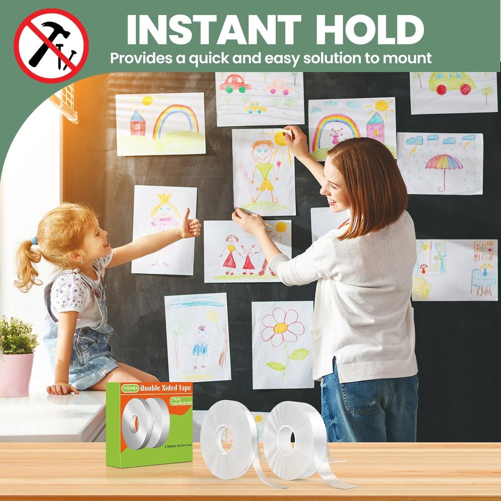 Double Sided Tape, Nano Mounting Tape Heavy Duty (2 Sizes, Total 400 INCHES), Clear Two Sided Wall Tape, Removable Picture Hanging Adhesive Tape Strips, Poster Carpet Tape for Home Office Car Product Details Brand: YUUMEA Color: Clear Material: Acrylic Number of Items: 2 Recommended Uses For Product: Outdoor, Wall, Arts And Craft, Indoor, Picture, Hooks, Led Light, Carpet, Tissue Box, Office Decor, Poster, Holiday Decor See more Package Dimensions : 4.53 x 4.49 x 1.5 inches; 11.46 ounces Date First Available : August 6, 2023 Manufacturer : YUUMEA Best Sellers Rank: #20,316 in Office Products (See Top 100 in Office Products) #181 in Mounting Tape #181 in Mounting Tape Customer Reviews: 4.4 4.4 out of 5 stars 922 ratings Package Included: You will receive two rolls of clear double sided tapes, a total length of 400 inches. Two widths (0.5 inches and 1 inch) can meet your different pasting needs, making it perfect for your next DIY wall-hanging project Strong Adhesion: Whether you are using it outdoors or indoors, our strong nano tape can provide long-lasting and reliable fixation. But for temporary pasting or hanging heavy objects, we do not recommend using it on wallpaper and painted walls Instant Hold: Our heavy duty double sided tape provides a fast and safe solution to mount. It can be easily bonded in just 60 seconds without nails and hammers. Children can also easily complete lightweight wall-hanging projects Residue Free: Unlike other poster tapes, our double sided mounting tape does not leave adhesive residue after removal from a smooth surface. It is the perfect solution for renters, students, and anyone who wants to avoid damaging furniture Versatile Uses: Our two sided tape is a must-have for families, cars, apartments, classrooms, and offices. You can hang photo frames, mirrors, murals, posters, LED lights, holiday decorations, and other home decorations wherever you need them