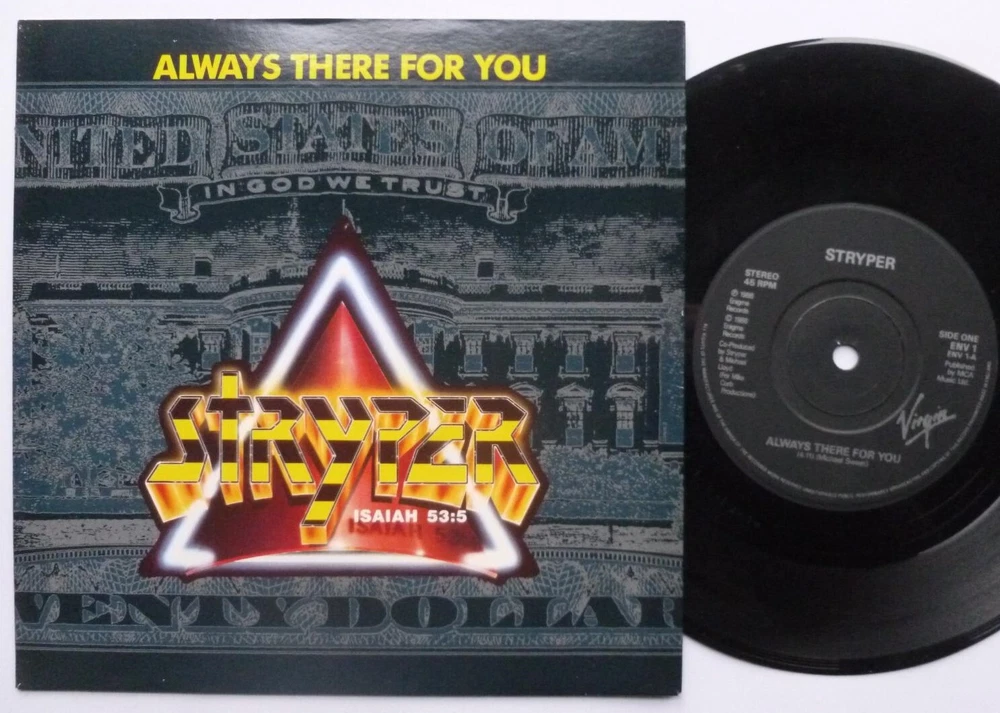 Artist: Stryper Title: Always There For You Format: 7" Label & Cat No: Enigma ENV1 Grading: EX/EX Year: 1988 Additional info: picture sleeve, Always There For You/In God We Trust *********************************************************************************** • thespacebar.records have been selling vinyl online for over 20 years. • We don't use stock photos. What you see is what you get. If we have multiple copies we'll send the best one. • If there are any issues when we come to pack up your record we will message to let you know and wait for you to confirm or cancel prior to shipping. • Much of our stock is in near-perfect condition. • Many items are unplayed but are graded conservatively as EX. • We're in the process of adding more photos to our listings. It's a big job. In the meantime if you'd like to see more images of any item, please send a message and we'll fast-track it. • We grade the vinyl 1st and the sleeve (if applicable) 2nd. • If there is only one grading and it seems very cheap, please check the item description carefully as we sell some records without sleeves and some sleeves without records. We always check with buyers before posting these items. • Singles that don't have a picture sleeve are supplied in an original company sleeve where possible. Otherwise they are sent in a plain white sleeve. • Records are supplied with a 400g polythene sleeve for protection. • To prevent seam splits, records are removed from their original sleeves for posting. • Everything is pressed in the UK unless otherwise stated in the item description. • More information/track listings/photographs available on request. Enjoy browsing our shop - Jeff & Catherine
