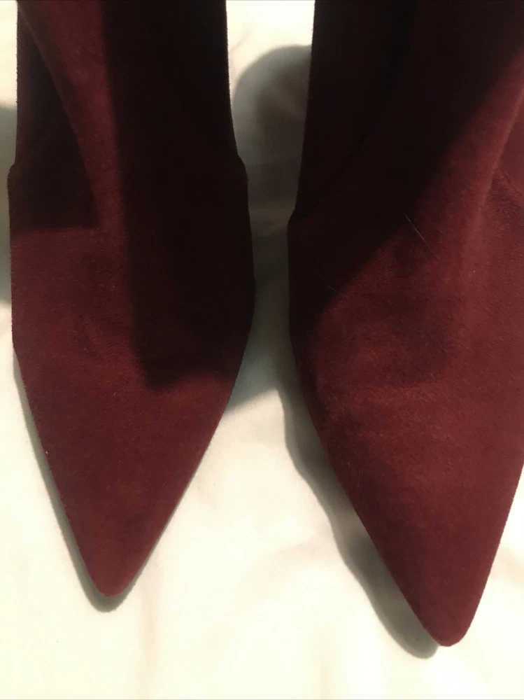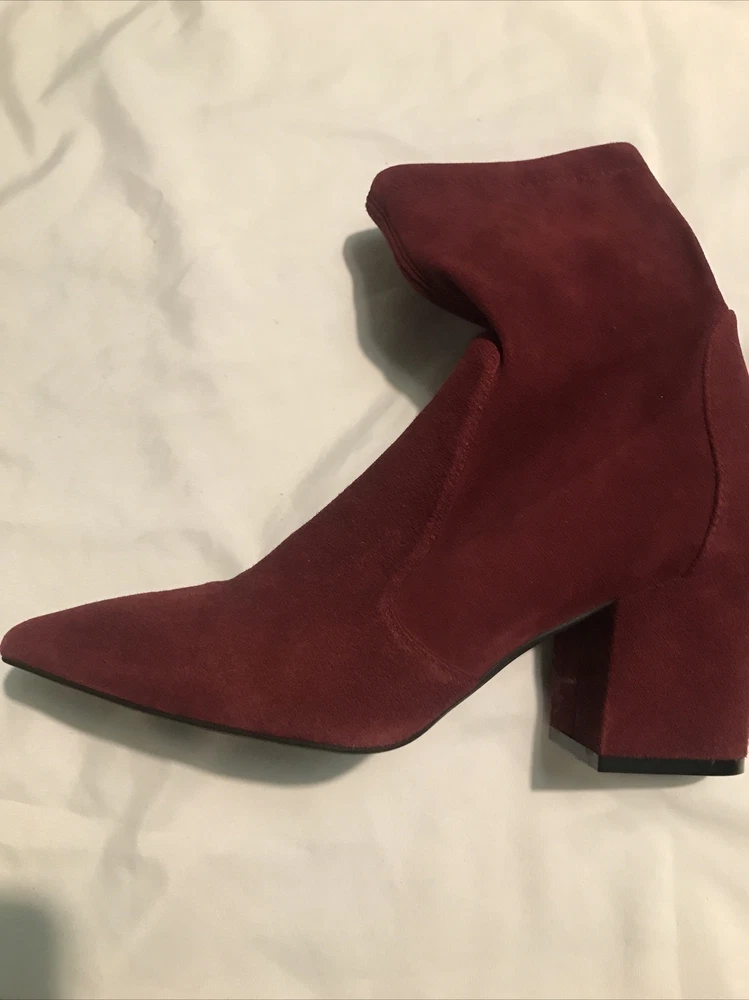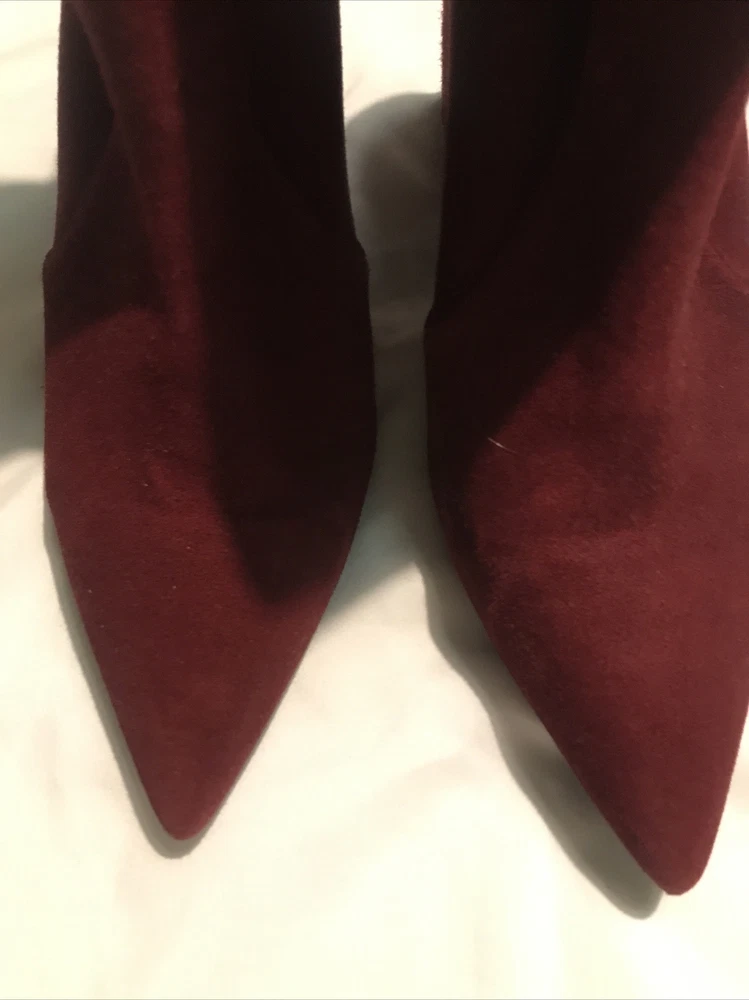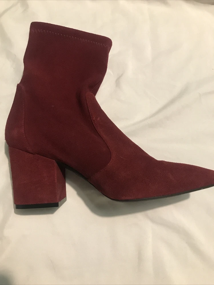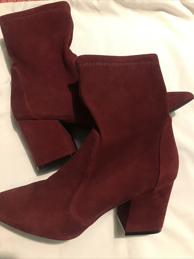Elevate your shoe game with these stylish Stuart Weitzman Suede Ankle Sock Boots in a beautiful burgundy color. These boots feature a pointed toe and pull-on closure, making them perfect for any occasion from casual to formal. The high block heel adds a touch of sophistication, while the velvet suede upper material and leather lining provide comfort and stretch. These boots are perfect for any season, whether it's winter, summer, fall, or spring. They come in women's size 8 and have a regular calf width. These boots have a versatile style and can be worn for various themes such as festivals, weddings, and even preppy or punk rock. Get your hands on these stunning boots from Spain today! Measure: Shaft 3,5 in Circumference 4,5” Heel 3 in It comes from a smoke free home in very good condition.