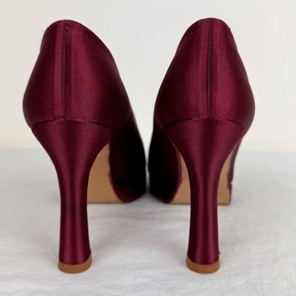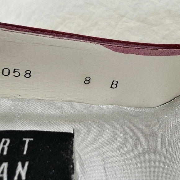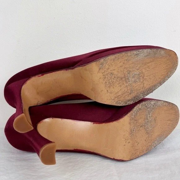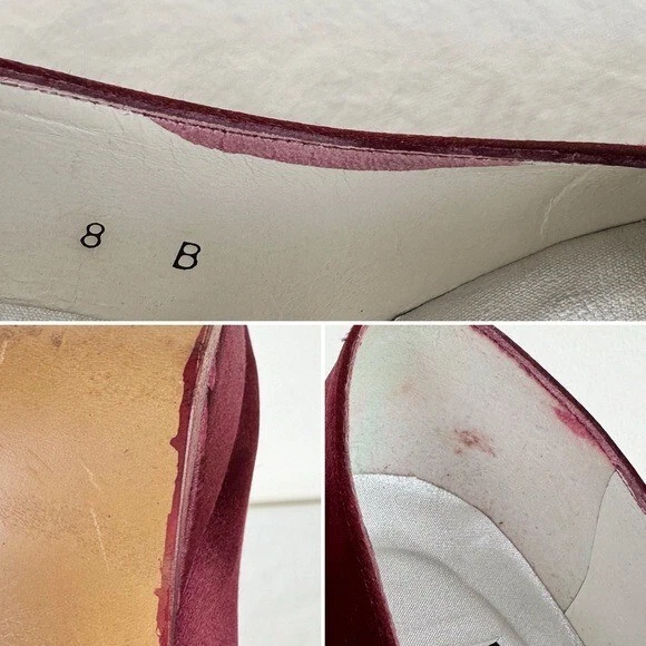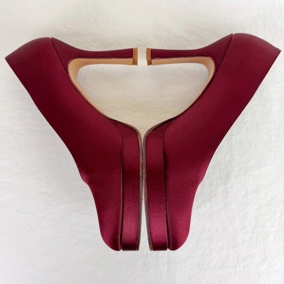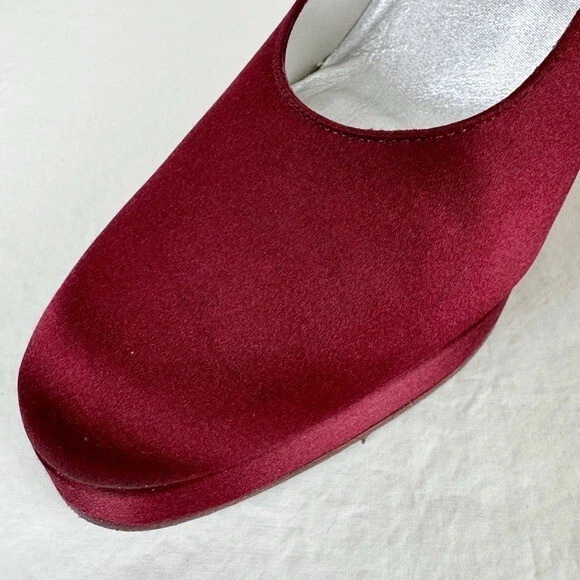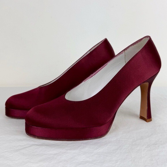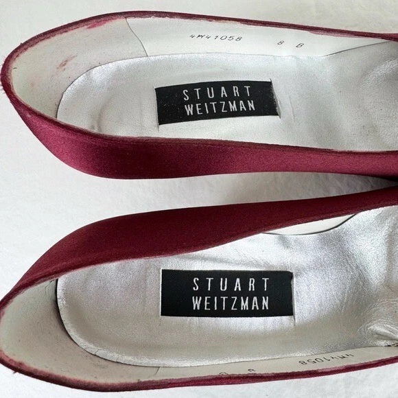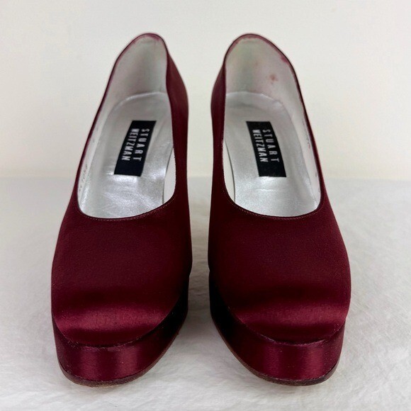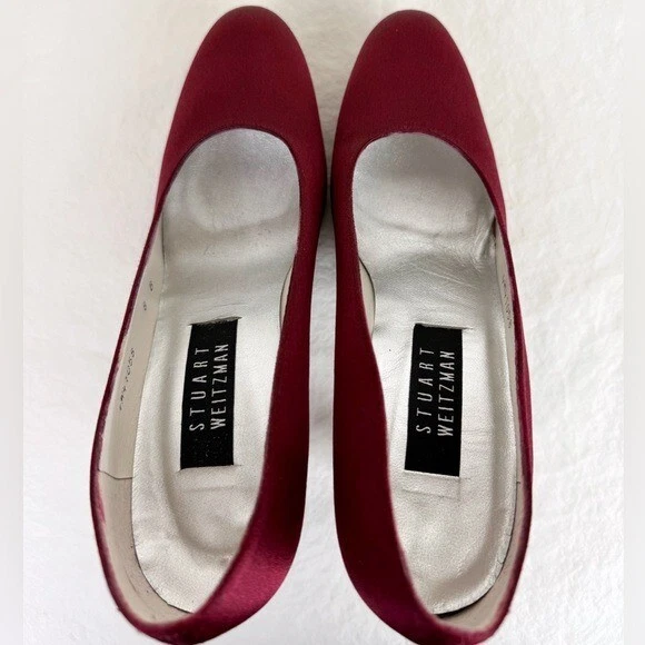 Stuart Weitzman Vintage Burgundy Satin Pumps Amazing vintage Y2K heels. Beautiful red/burgundy color. Platform sole. Silver insole. Lovely and great quality. Size: 8 B (standard with) **I'm an 8 and these are pretty tight on me- I'd recommend for a 7.5-8 or someone with a narrow foot Approx. Measurements: Heel: 4"; Platform: 1" Condition: Great vintage condition. Some dye on edges of shoe and a very light water spot on the inner right toe- very hard to see. See photos for detail Material: likely silk satin and leather sole