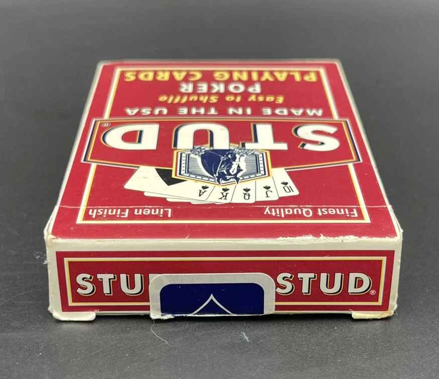 Stud Poker Playing Cards Linen Finish Made In The USA Red Pre-Owned Pre-owned in overall good condition. Actual item shown in the photos. Ships within 1 business day of payment being received We ship with care! Checkout my other items for sale for other playing cards, sports cards, comics, video games, and much much more! Please feel free to ask any questions!