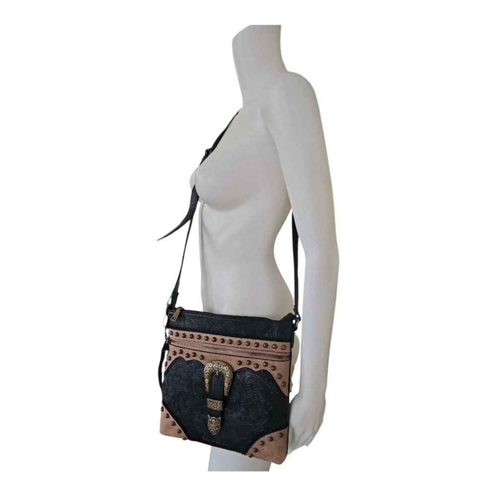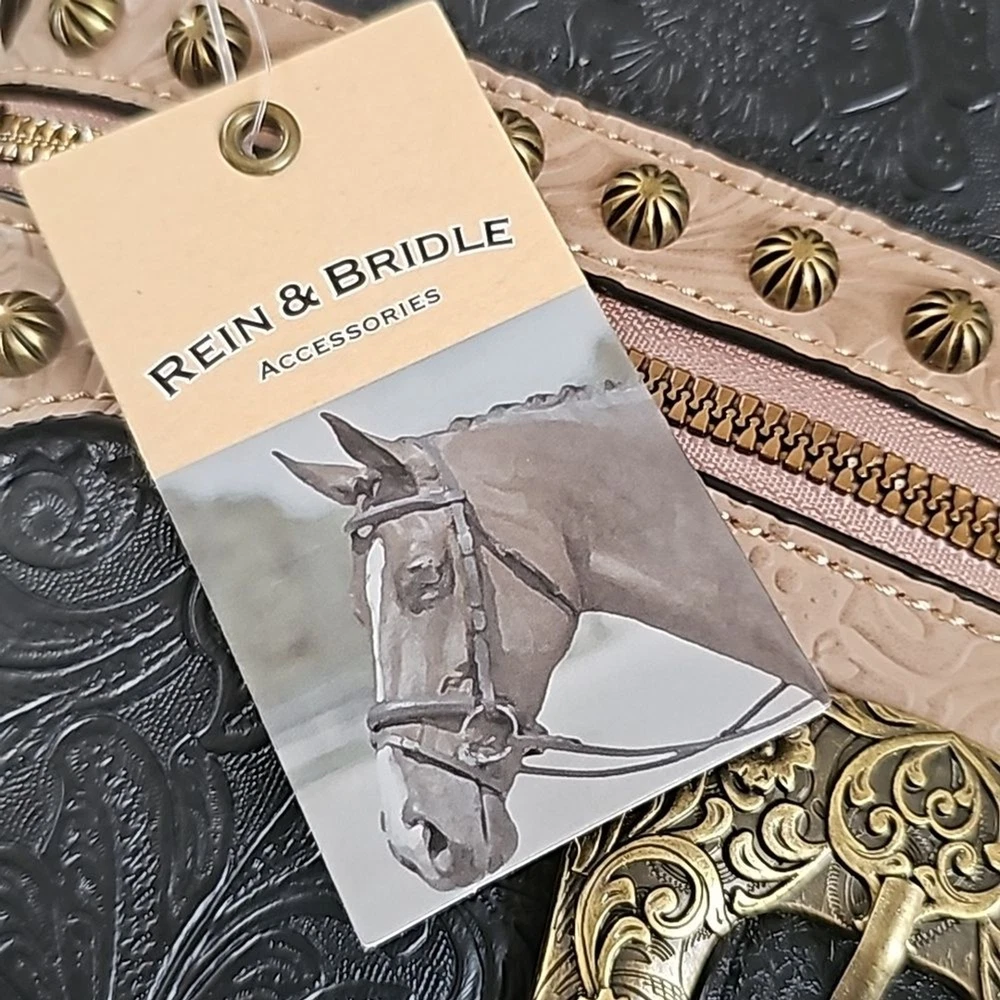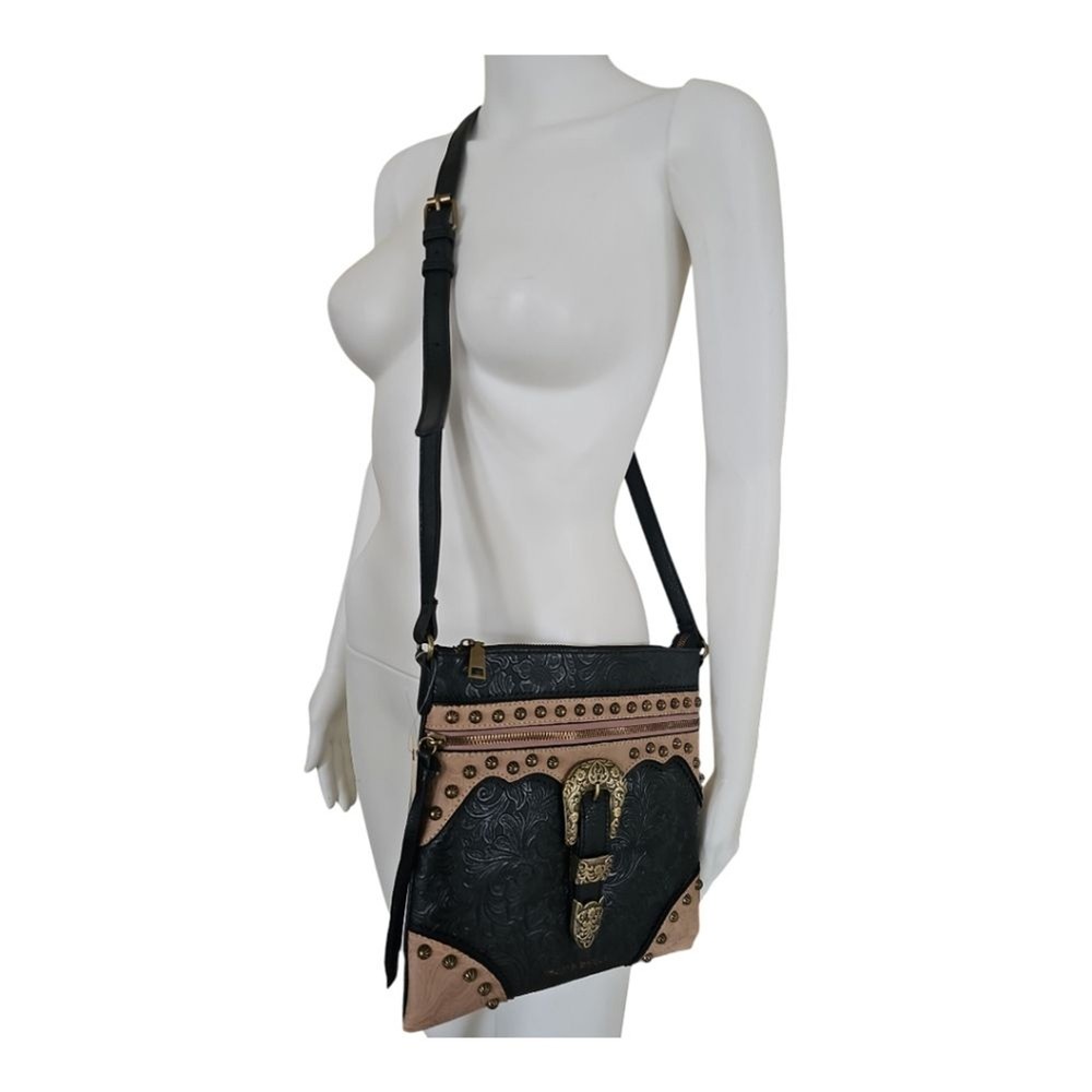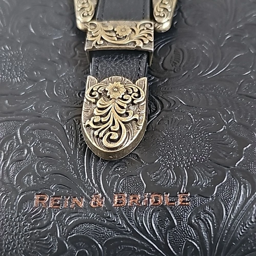Rein & Bridle Studded Buckle Crossbody Embossed Faux Leather Bag NWT Details: Decorative front buckle Front zip pocket Top zip closure 1 interior zip pocket 2 interior slip pockets Adjustable cross-body strap MSRP: $99.00 Approx 10" H x 10" W Brass finished hardware Tags: boho bohemian vegan leather southwest southwestern black cream trending trendy southwest southwestern cowgirl festival party statement bag bags Purse Purses