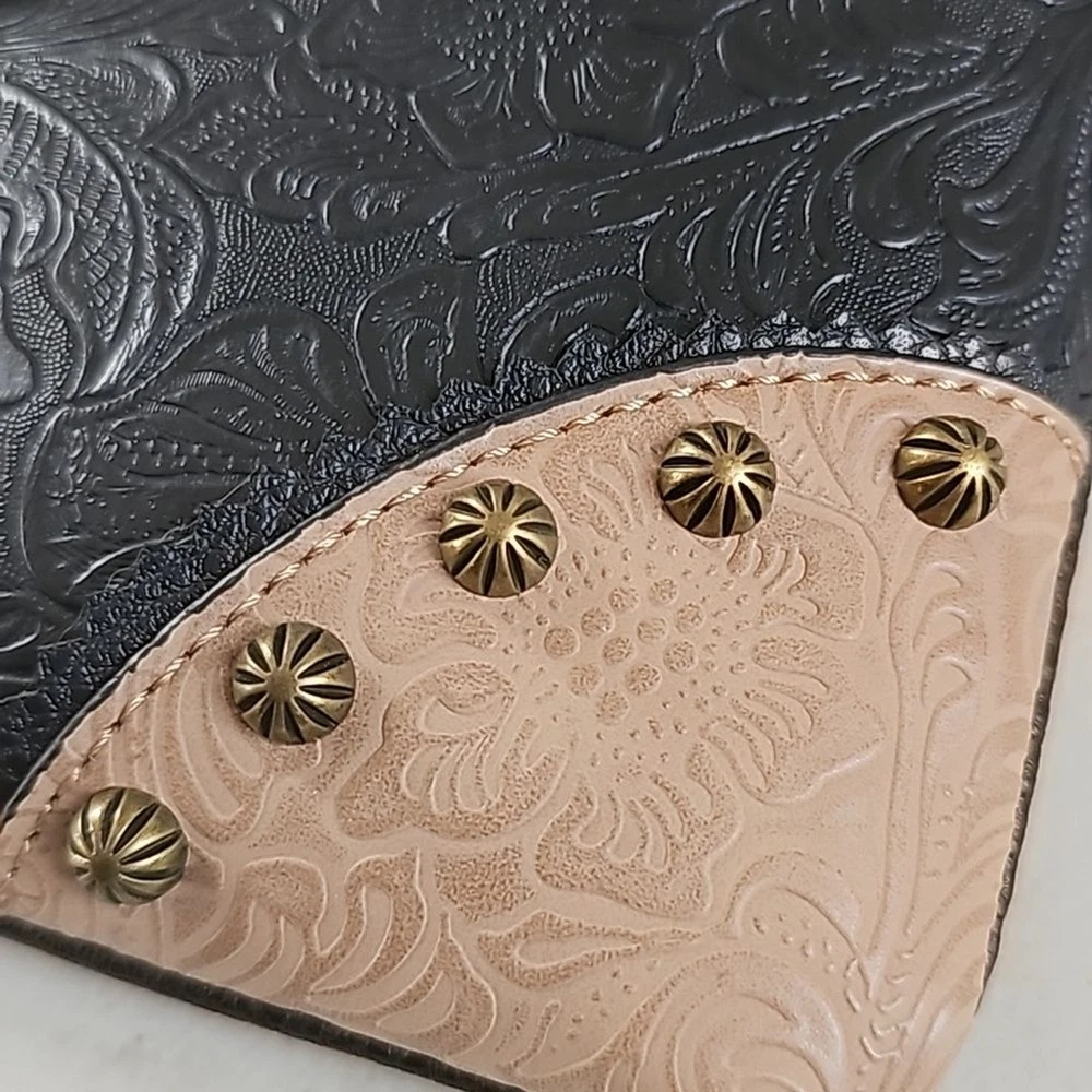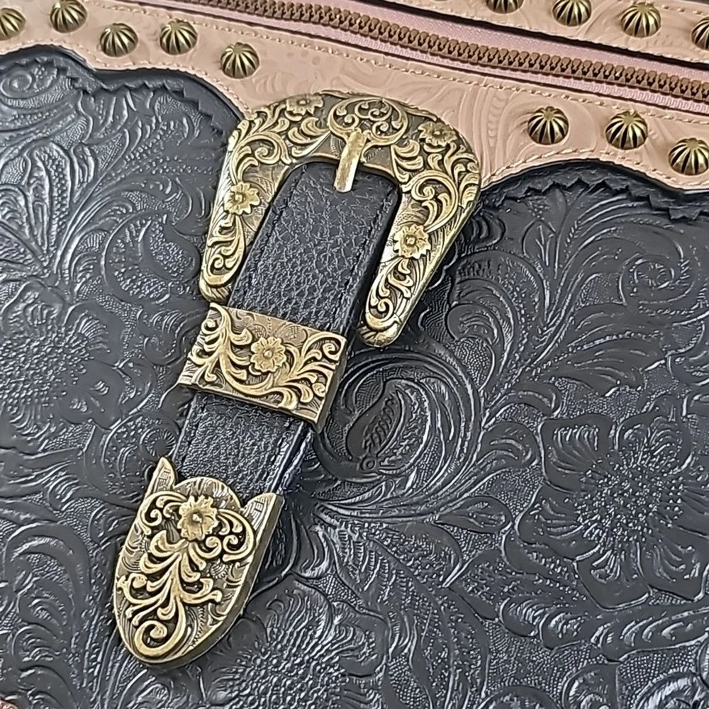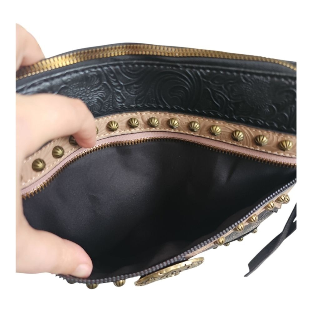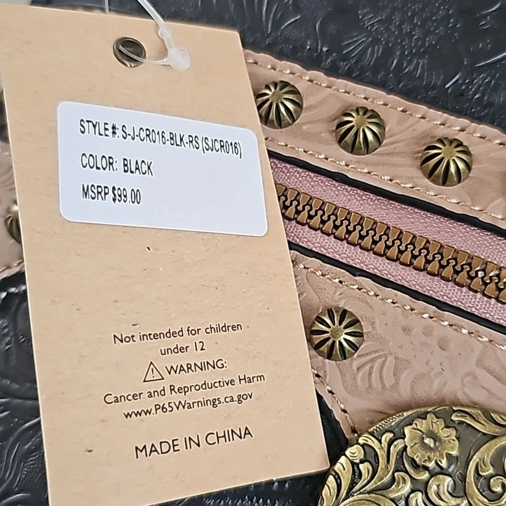 Rein & Bridle Studded Buckle Crossbody Embossed Faux Leather Bag NWT Details: Decorative front buckle Front zip pocket Top zip closure 1 interior zip pocket 2 interior slip pockets Adjustable cross-body strap MSRP: $99.00 Approx 10" H x 10" W Brass finished hardware Tags: boho bohemian vegan leather southwest southwestern black cream trending trendy southwest southwestern cowgirl festival party statement bag bags Purse Purses