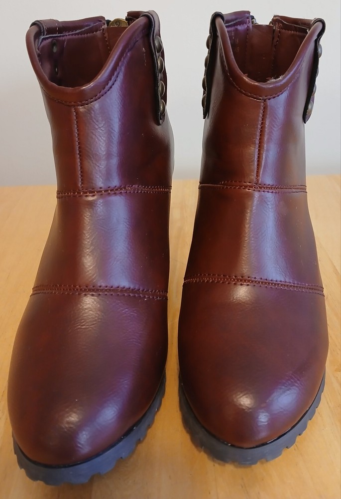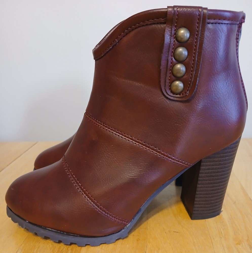Great pair of booties from my personal collection. Bought them for a fun party, but only wore them once. The heel was a little too high for me to wear frequently, but it worked well for that night! They are easy to get on, as they have a zipper in the back. They are stylish and fun! The color is beautiful. Wine/Mahogany. There are a couple very small fabric imperfections, barely noticeable. Anxious for them to find a good home! :)