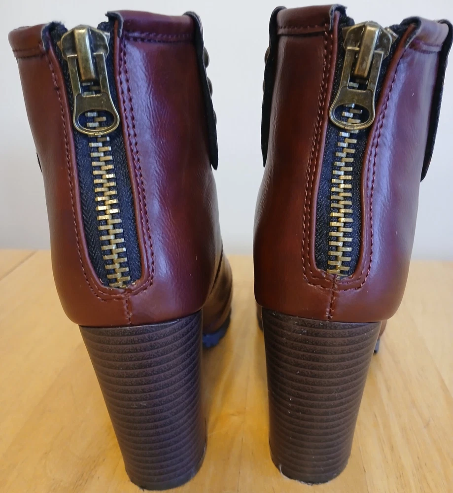 Platform Height: 3/8 Accents: Lace, Scalloped, Zipper Heel Style: Chunky Vintage: No Color: Mahogony US Shoe Size: 8.5 Shoe Shaft Style: Ankle Style: Bootie Upper Material: All man made Customized: No Lining Material: Faux Leather Department: Women UK Shoe Size: 6.5 AU Shoe Size: 7 Closure: zip and lace Brand: Seven Product Line: Seven Model: Seville boot Type: Boot Theme: fun Toe Shape: Almond Toe EU Shoe Size: 40 Country/Region of Manufacture: China Heel Height: High (3-3.9 in) Insole Material: Padded Outsole Material: Rubber Personalize: No Pattern: Solid Occasion: Casual Season: Fall, Spring, Summer, Winter Features: Padded, studded sides, studded trim, zipper heel Calf Width: N/A MPN: 2002