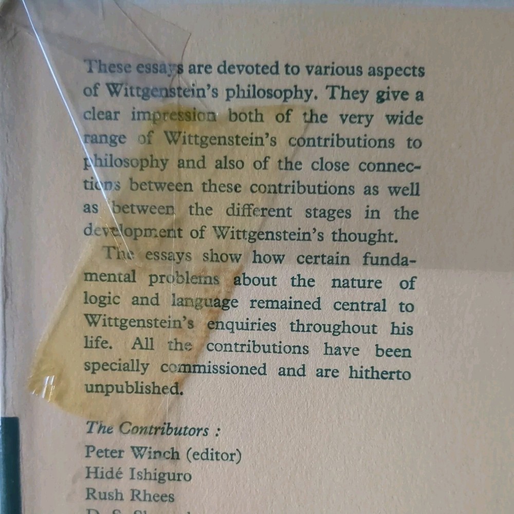Country of Origin: United Kingdom Author: Peter winch Language: English Format: Hardcover Genre: Philosophy Topic: philosophy Book Title: Studies in the Philosophy of Wittgenstein. Publication Year: 1969 Publisher: Routledge