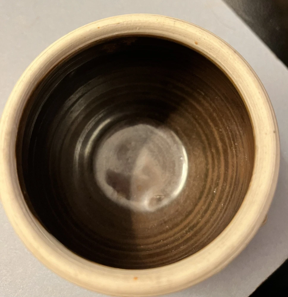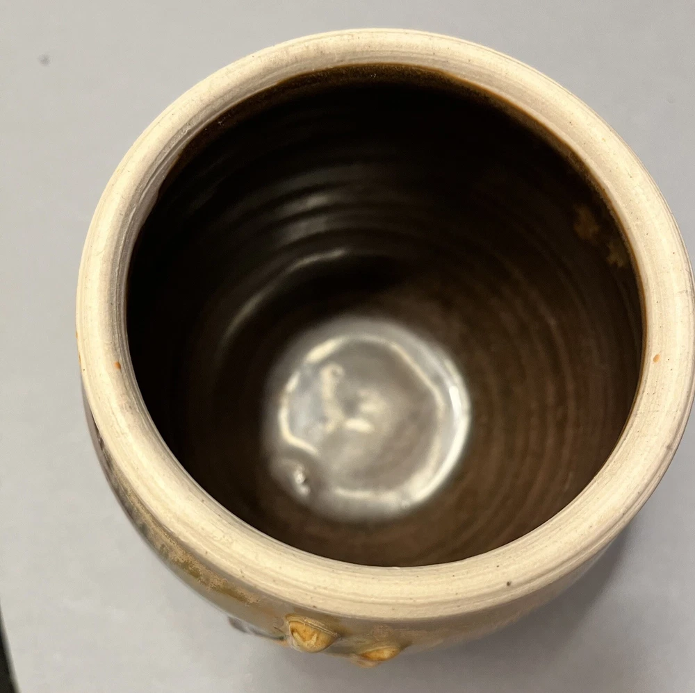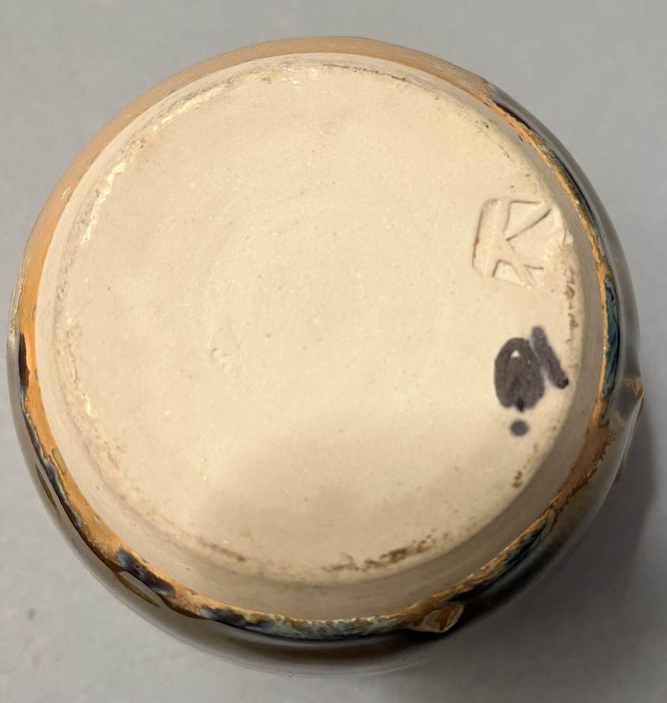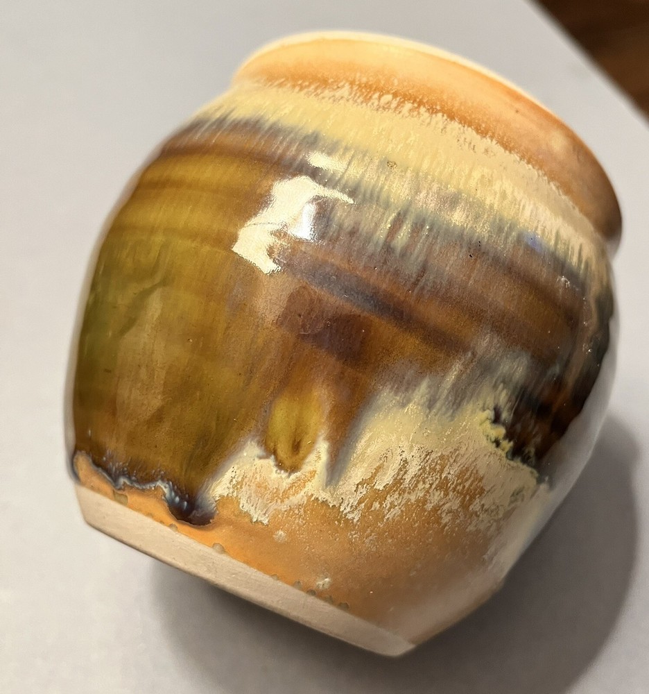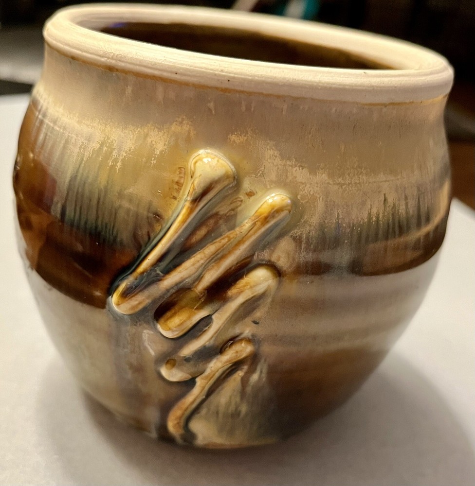 This is a handmade Studio pottery vase with a multicolor design of cream, brown, and blue drips. The vase is made of stoneware and has a high gloss finish. The vase is glazed and stamped on the bottom, and features hand-painted details. Its production style is art pottery, and the technique used is pottery. The vase is perfect for decorative purposes and can be used to hold flowers or other small items.