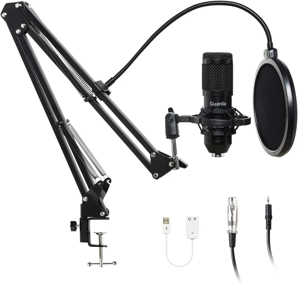 【PROFESSIONAL SOUND CHIPSET】 This condenser microphone is designed with a professional sound chipset so that microphones maintain high resolution sampling rates. Smooth, flat frequency response is excellent for singing, speech and Voice over, performance perfectly reproduced sound, high quality microphone ensures your exquisite voice again on the Internet. 【PLUG AND PLAY】The microphone has a 7.1 USB interface adapter for easy connection to your PC, MAC and Linux operating system, NO ADDITIONAL driver software required, no external sound card required. This makes you sound perfect on a podcast, live stream, video call, or most other recordings. 【ELECTRET CONDENSER TRANSDUCER & MAGNET RING】With 16mm electret capacitive transducer, USB microphone can give you a strong bass response. This professional condenser microphone picks crystal clear audio. The magnet ring on the USB microphone data line has a strong anti-interference function, so that you have a better feeling., so that you have a better feeling. 【STABLE MULTI-ANGLE MIC STAND DESIGN】A POP filter and foam windscreen, condenser microphone records your crystal clear sound, and shock absorber stand keeps microphone stable with damping function. Especially suitable for video voiceover; Podcasts. YouTube video. Skype meetings and so on. 【COMPATIBLE WITH ALL OS】Suitable for all laptops, PC and mobile phones. But if you want to connect to a phone, you'll need an OTG adapter (not included). Strong output, no distortion, low power consumption. Packing list: Capacitive microphone + adjustable arm + metal shock absorber + Pop filter + foam microphone windscreen + meter mounting clip + USB cable. Product Description Guarda Audio Technology Co., Ltd. was founded in 1992 , is a high-tech enterprise integrating technology, industry and trade. The company mainly designs, develops, produces, professional power amplifiers, microphones, professional audio mixers and professional equalizers and other electro-acoustic equipment series products. Today, Guarda Audio Technology Co., Ltd. has been tempered into a well-known professional audio manufacturer with unique management experience, advanced production equipment, strong design examples, strong marketing and service capabilities, leading the continuous improvement of professional audio technology in the Far East. Introduction GD100, professional condenser microphone which adopts the exacting complete electronic circuit control and gold-plate diaphragm capsule the microphone with a good cardioids polar pickup pattern, high output, low self-noise, and the accurate reproduction of even the most subtle sound, suitable especially for studios recording studios, broadcasting stations, stage performances and computer. Absolutely fulfill the requirement of high quality for broadcasting and recording. Feature Plug ‘n play - USB recording microphone plug and play, compatible with PC and Mac and live use of sound cards and other devices, no need to download special drivers or tools, can be used anytime, anywhere. This is a great microphone for streamers, online teachers, musicians and people who work from home. Stability - The boom arm can be easily installed on any desktop up to 1.8 "(46mm) thick, and its 360° rotation and 180° vertical and horizontal movement help you get the most comfortable position. Low noise - This capacitive microphone provides a quiet, noiseless output while maintaining maximum signal gain. Cardioid Polar Pattern - Cardioid is the most widely used pattern in professional microphones. It provides reliable performance in both stage and studio. As you move around to the sides and bottom of the microphone, the cardioid pattern becomes less sensitive and will pickup less sound. Specifications: Polar pattern: uni-directional Frequency response: 20Hz-20kHz Sensitivity: -38dB±2dB (0dB=1V/Pa at 1kHz) Output impedance:150Ω±30%(at 1kHz) Load impedance: ≥1000 Ω Equivalent noise level: 16dBA Maximum sound pressure level:130dB(at 1kHz≤1%T.H.D) Signal noise ratio: 78db Electrical current: 3mA