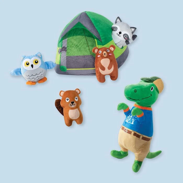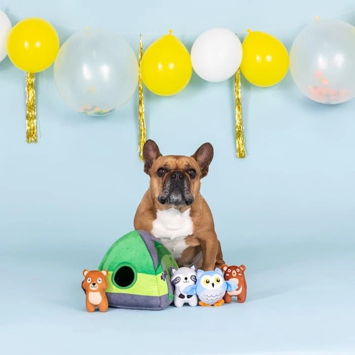 Life is good in the woods! Petshop by Studio “Happy Campers” burrow toy set is made for pups with lots of energy that enjoy interactive puzzle toys. This burrow toy set includes 4 mini toys each with a loud squeaker and stuffed with fluff. Simply hide the mini toys inside the burrow structure, squeak the mini toy and watch your dog try to figure out how to pull them out. This brain teaser is sure to be some in-tents fun! Great for small dogs and not intended for aggressive chewers. 5 toys in Keeps dogs entertained and occupied with hide-and-seek fun 4 forest critter mini toys, each with a loud squeaker Perfect for small sized dogs, Each mini toy is approximately 4.5” x 4.5” Burrow toy is approximately 8.5” x 8.5”