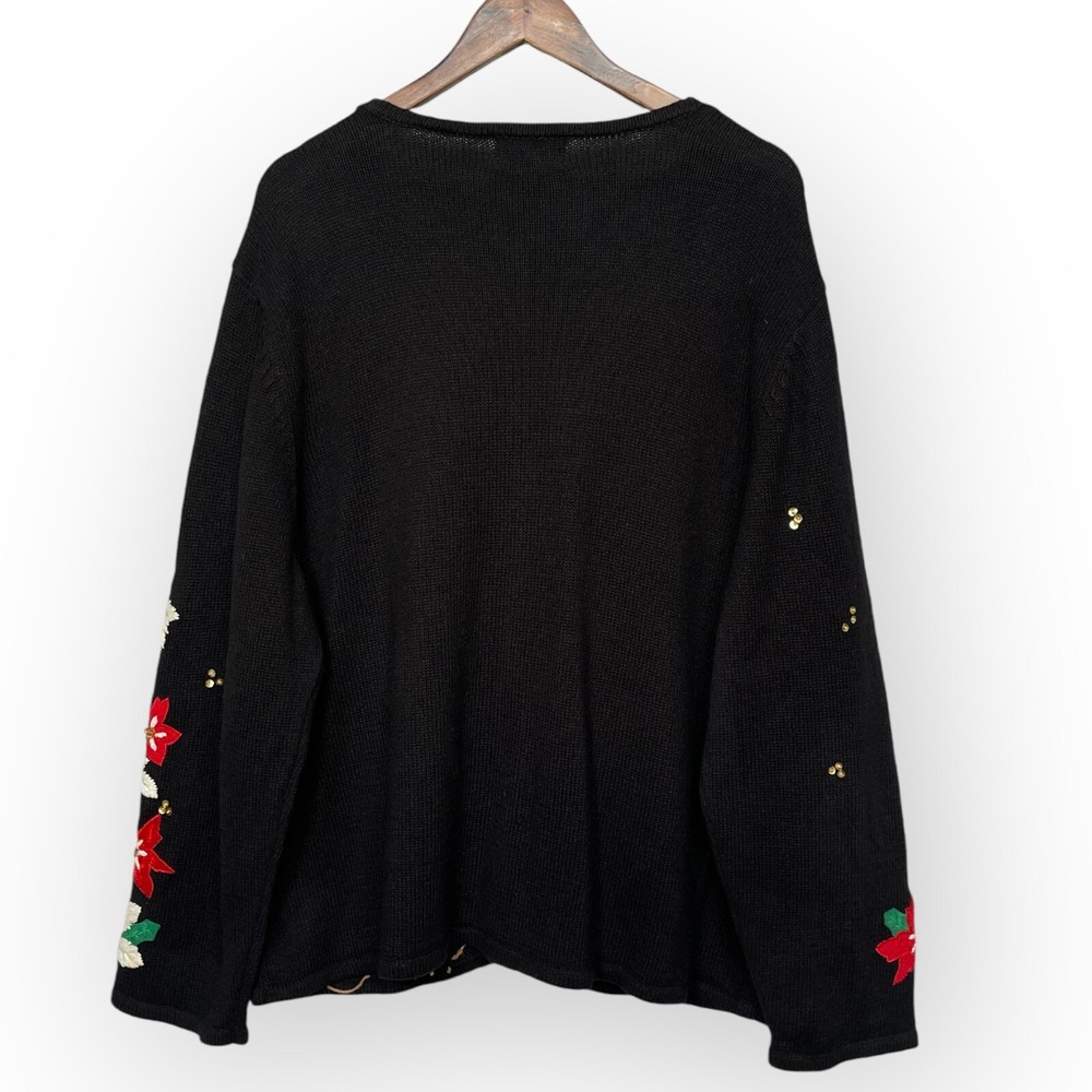 * Studio Joy Button Front Cardigan Women Size 3X Black Floral Sequins Embroidery * *Good Pre-owned Condition *Please see photos for approximate measurements (in inches), fabric make, washing instructions, and other notable details. *Purchased items are shipped out next business day.