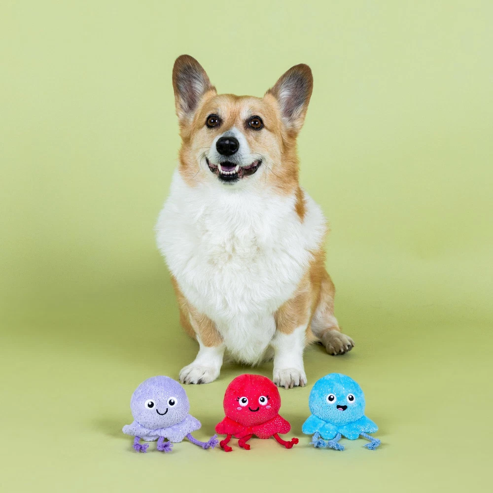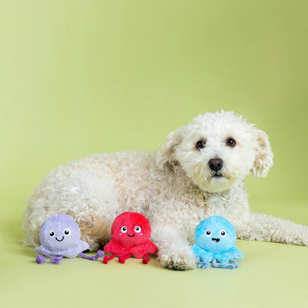Feelin' octo-mistic! PetShop by Studio's “Too Tenta-Cool” 3 piece mini plush toy set is perfect for the pup that likes to play all day. Made with a loud squeaker and crazy crinkle paper in each toy, plus tuggable rope on each toy, this trio is sure to octo-py your pup. Great for small dogs and not intended for aggressive chewers. 3 toys for 3 times the fun Loud squeaker in each toy Crinkle paper in each toy Tuggable rope on each toy Approximate sizes - Blue Octopus: 5.5" h x 4.25" w; Pink Octopus: 5.5" h x 4.25" w; Lavender Octopus: 5.5" h x 4.25" w