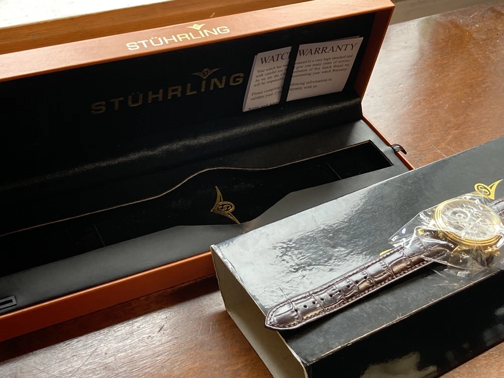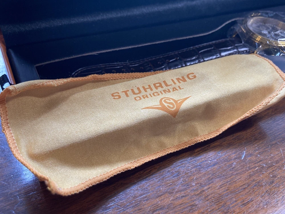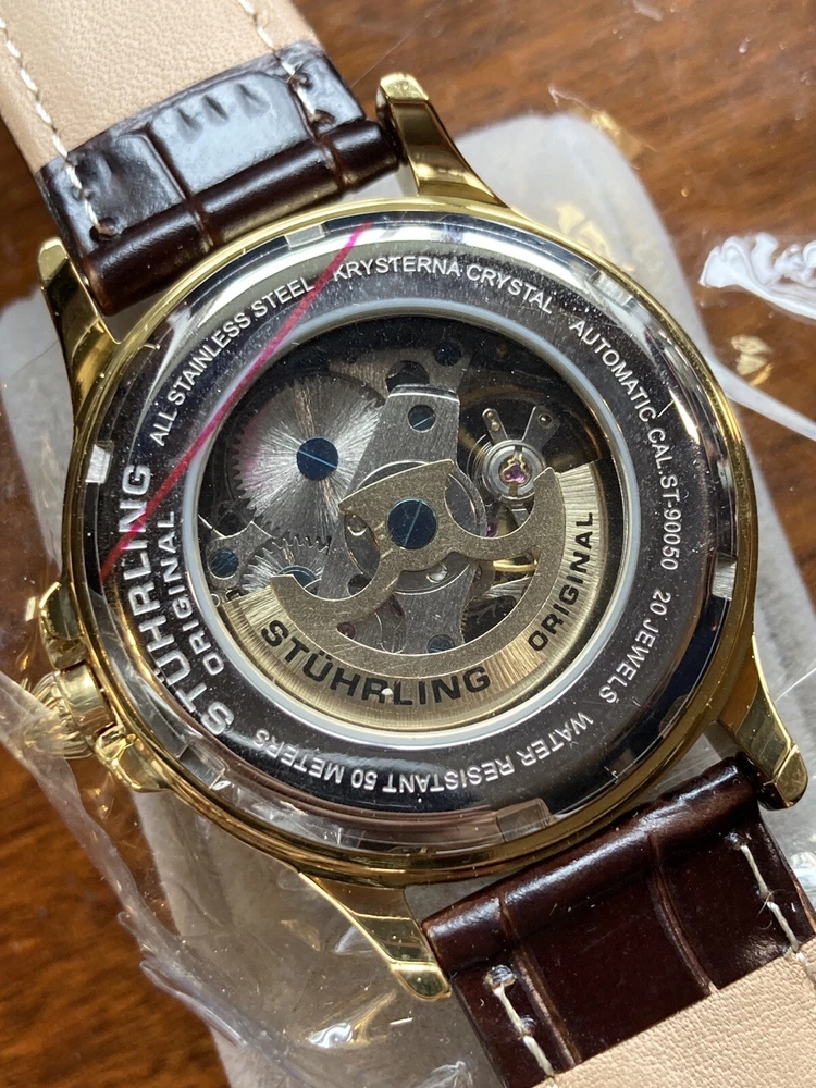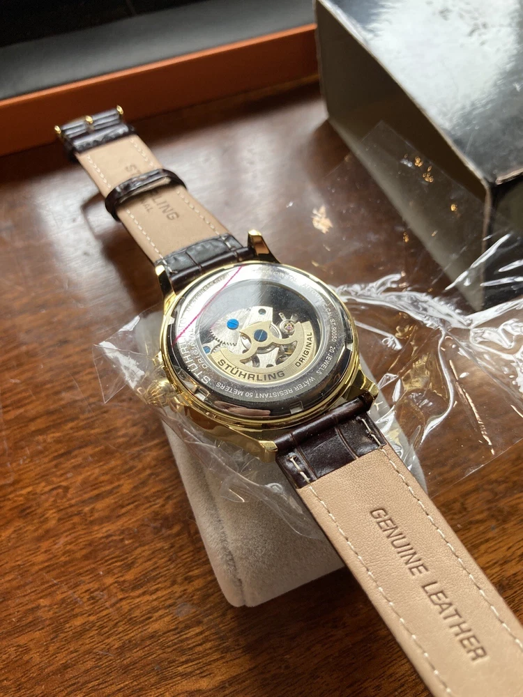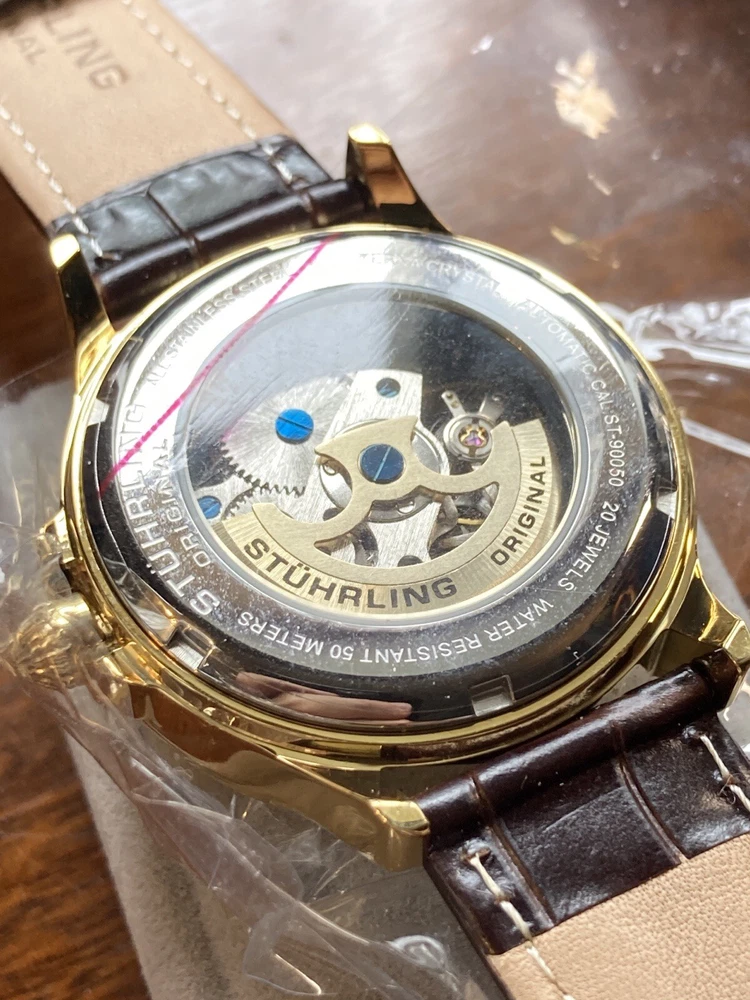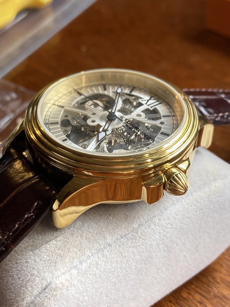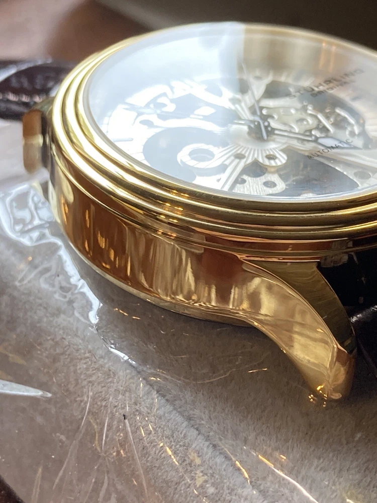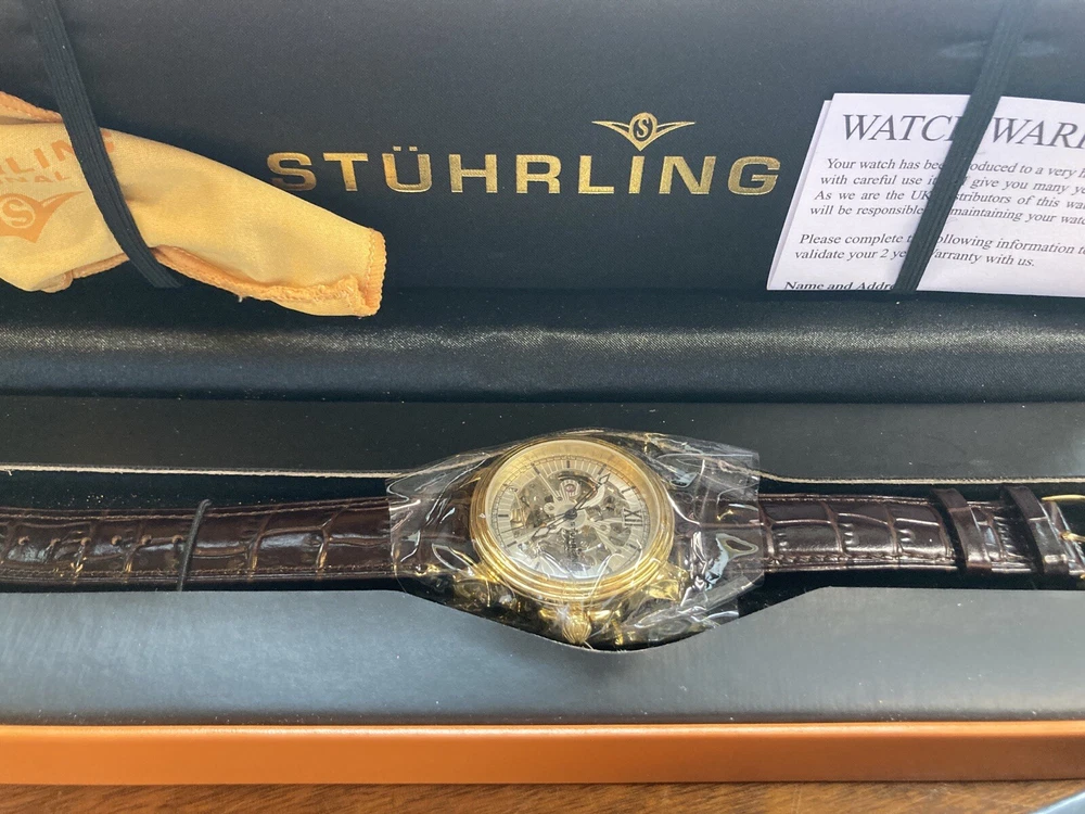 Stührling Original Cal. ST-90050 Men's Watch. Unworn/like new, plastic coat and back sticker still on. Selling as “used” just because the outer box is a bit damaged on the edges. A pristine and elegant timepiece with a striking gold colour, Krysterna crystal and fantastic crown. It comes with its original box and papers, as well as a Stührling branded wipe-cloth for polishing your watch surface. Perfectly working automatic movement inside can be seen through the exhibition caseback.
