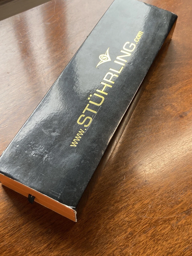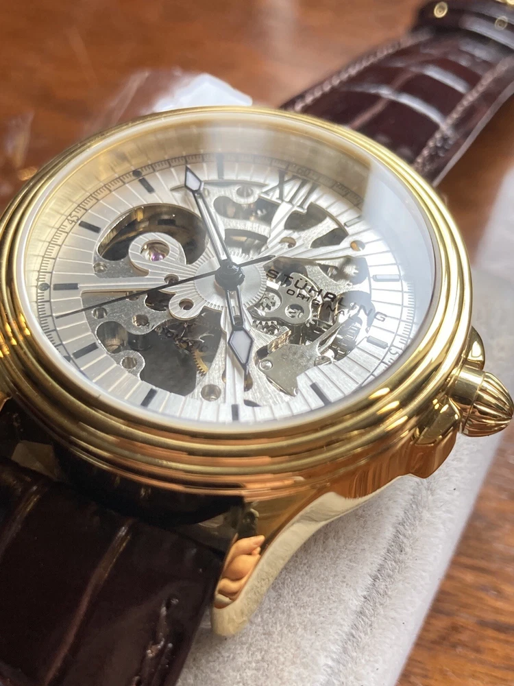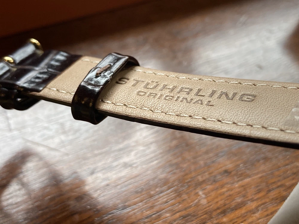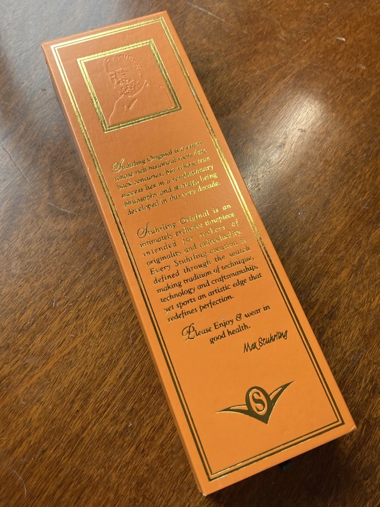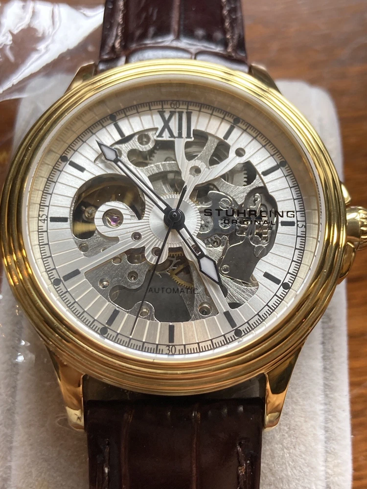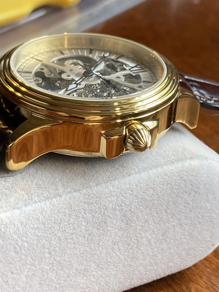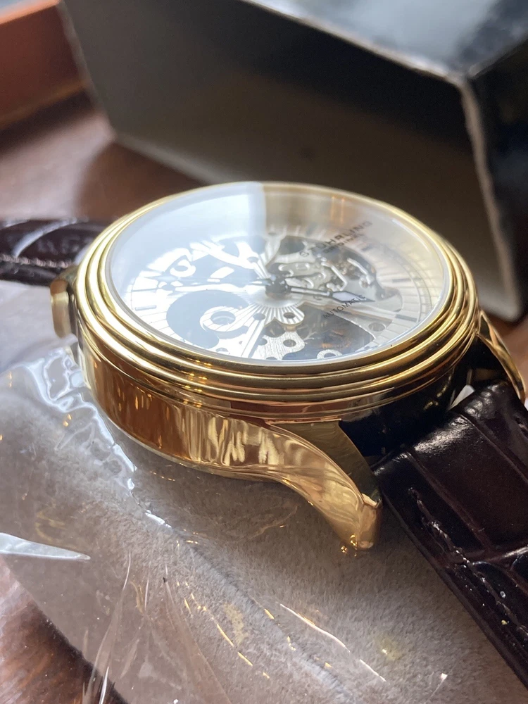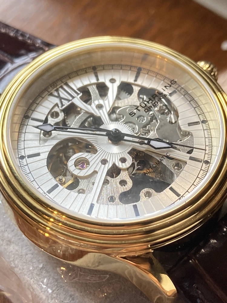 Stührling Original Cal. ST-90050 Men's Watch. Unworn/like new, plastic coat and back sticker still on. Selling as “used” just because the outer box is a bit damaged on the edges. A pristine and elegant timepiece with a striking gold colour, Krysterna crystal and fantastic crown. It comes with its original box and papers, as well as a Stührling branded wipe-cloth for polishing your watch surface. Perfectly working automatic movement inside can be seen through the exhibition caseback.