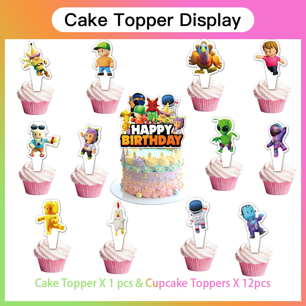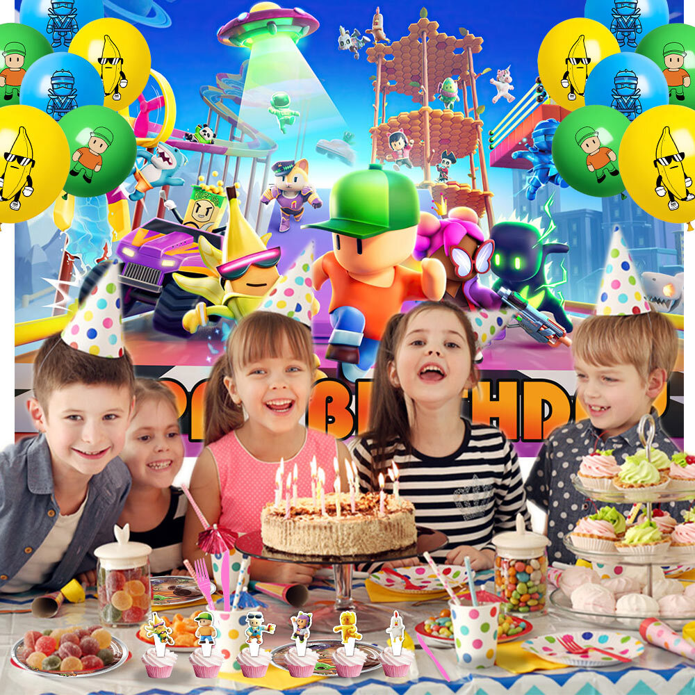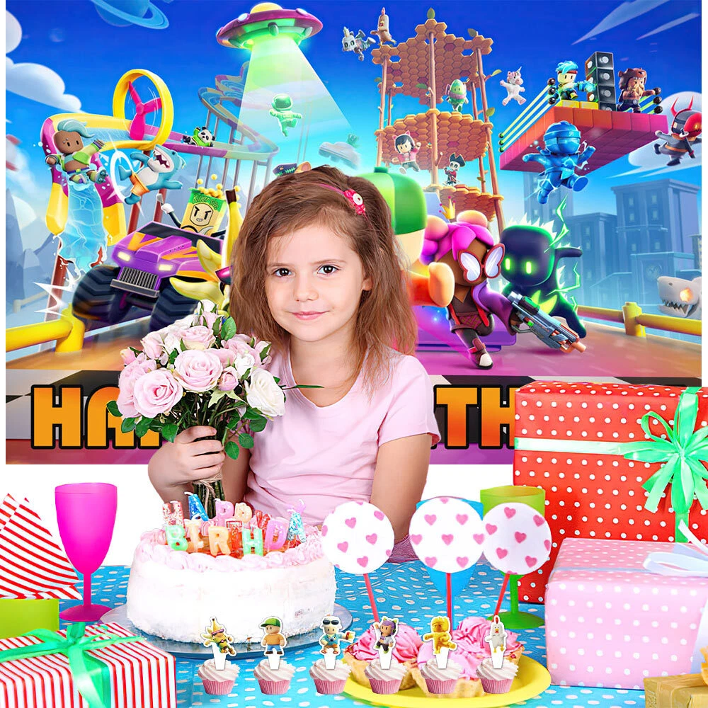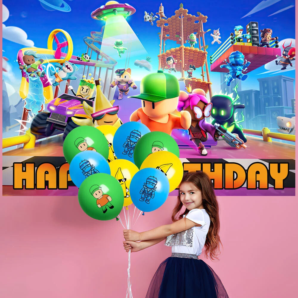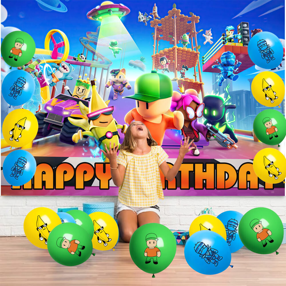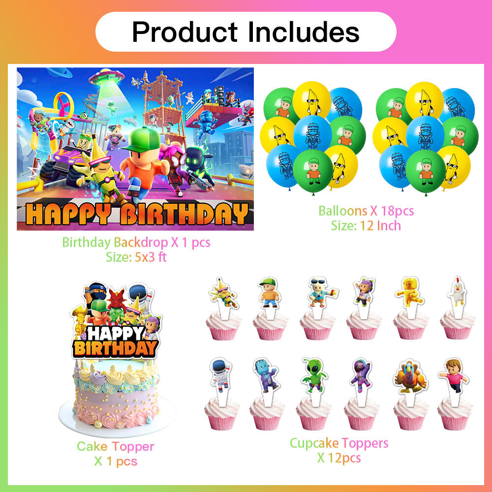 About this item 【Themed Sets of Matching Units】: ☰ Take this good favor for themed party to impress your kids and their friends. ☰ Enrich your kids’childhood dream well,giving them a fantastic surprise. 【Party Decor Is So Easy】: ☰ It contains all of your Stumble Guys theme birthday party tableware needs and is completely disposable. ☰ You can save more time to enjoy this party with your guests. 【Real Savings For You】 ☰ The shiny large backdrop decor will attract you eyes and make everyone laugh.The banner cloth is printed in high definition, making it the perfect party background wall. It is made of thick cloth, not paper. ☰ You will save over 70% compared to buying 2 Stumble Guys party supplies separately. 【Super Value Stumble Guys Package】: ✪ 1PCS X Large Happy Birthday Banner 5x 3ft(150x100cm) ✪ 18PCS Balloons. ✪ 1PCS X Cake Topper. ✪ 12PC X Cupcake Toppers. 【After Sale Service】: ☰ We try our best to bring the best use experience to our customers. ☰ If you are not satisfied with the purchase of this set or have any questions about the product,please contact us at any time.We will definitely solve the problem for you in the first time. ☰ We can aslo custom backdrop other size or pictures you want. Any questions please contact us.