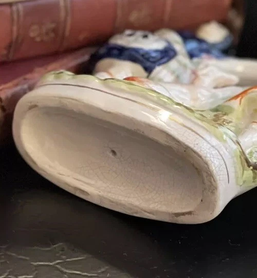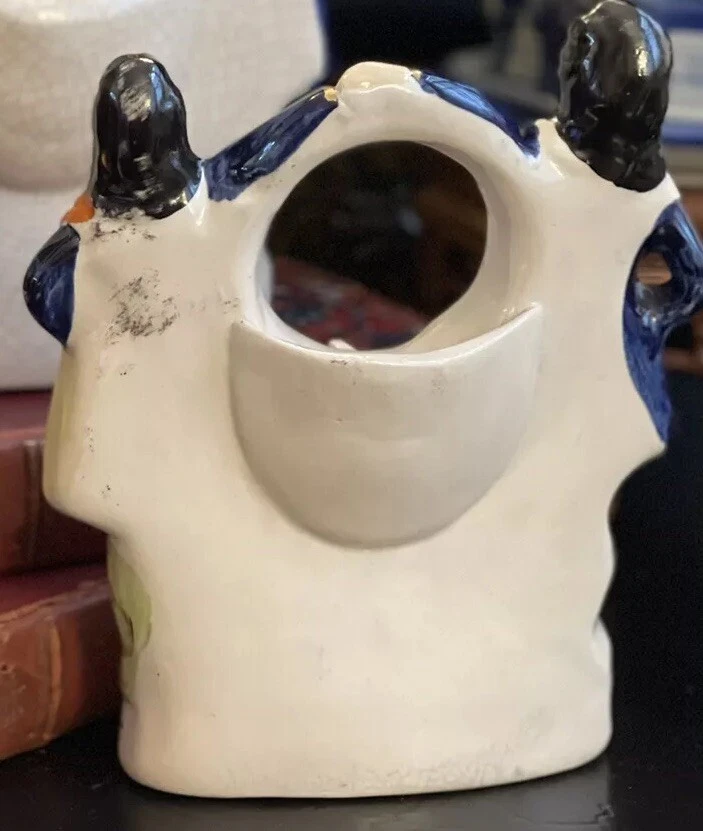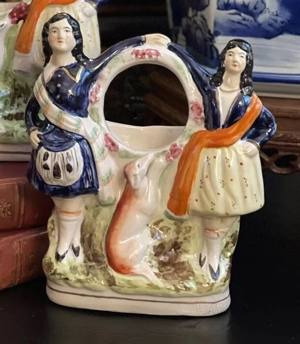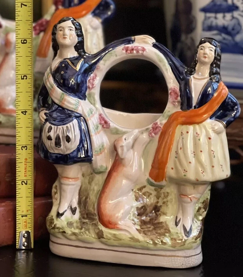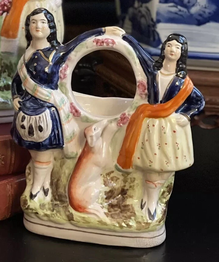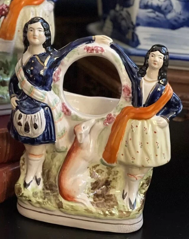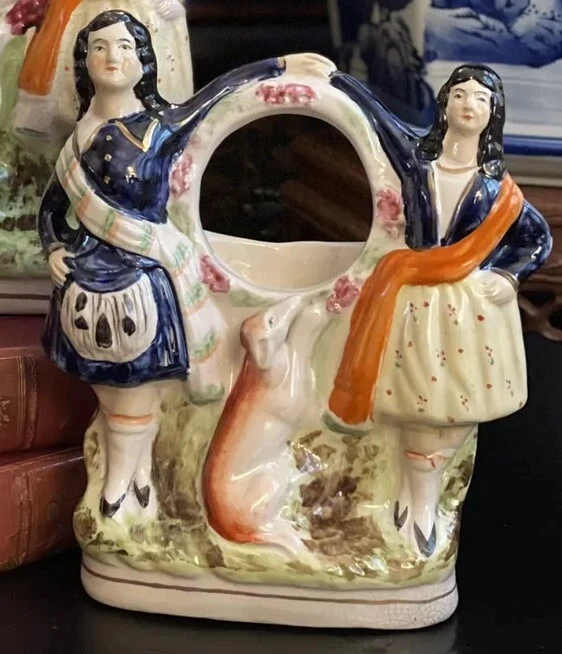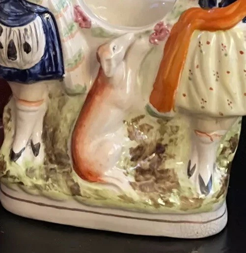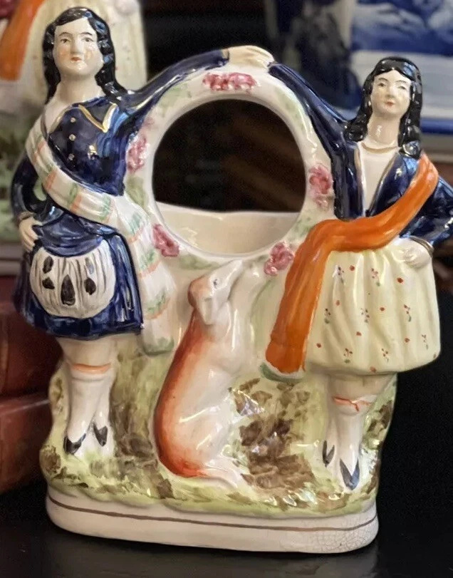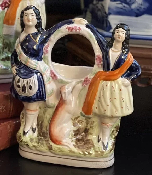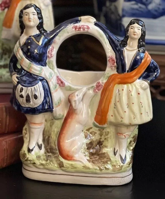 Wonderful Rare Antique 19th Century English Country Life Staffordshire Mantle Pocket Watch Holder Depicting Highland Figures with Dog β’ Elegant Original Period English Country Life Staffordshire β’ 6.5β This stunning early English country life themed mantle pocket watch holder featuring right and left highland figures in traditional attire with their precious canine friend alongside. It almost looks as if the sweet dog is holding up the watch if one were to be in the slot, turning the piece in to a clock, an ingenious design. This rare curated piece will make elegant showpiece when placed on its own or as a stunning addition to a collection or arrangement. Marvelous piece to fascinate and delight every admirer. Excellent surviving period example. Minimal expected post production wear. Wonderful gallery quality find to enjoy and treasure. Happy Bidding!! Height 6.5β