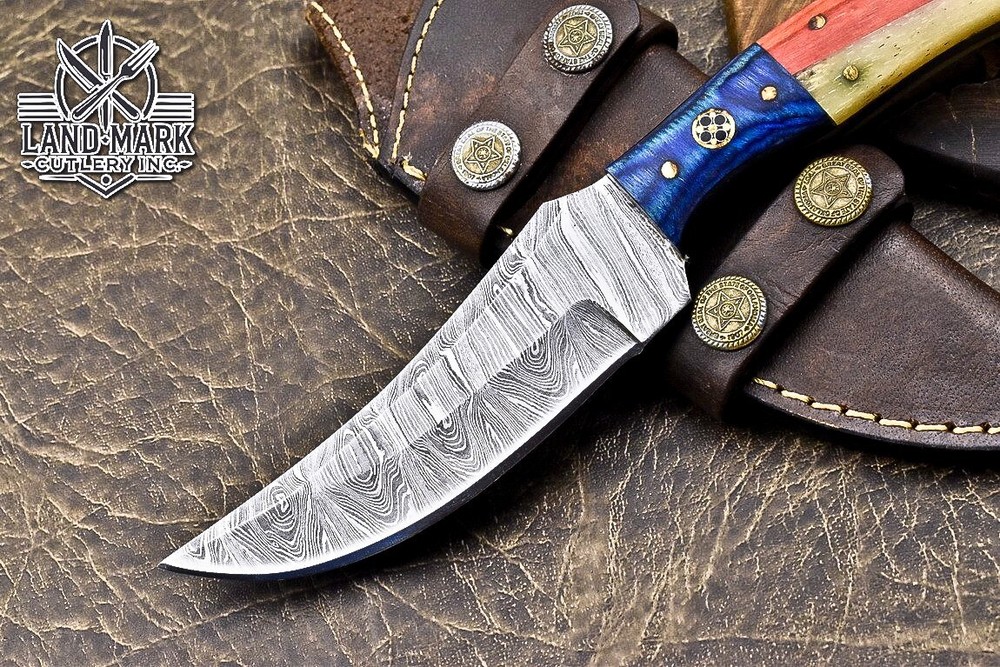Custom Hand Made DAMASCUS STEEL HUNTING KNIFE WITH USA FLAG HANDLE We offer a shipping discount for More then one purchased . And discount will be apply on combine invoice, Discount will not apply on separate payment. ITEM DETAILS OVER ALL LENGTH 8.0 inches long (Approx) HANDLE LENGTH 4.0 inches long (Approx) BLADE LENGTH 4.0 inches long (Approx) BLADE HARDNESS 58-60 HRC Which Holds The Sharp Edge For Long Time. HANDLE WOOD AND BONE COVER LEATHER SHEATH This Awesome custom made KNIFE has a nice hand forged with the combination of 4340 & 1080 steel. HOW OUR DAMASCUS IS MADE: All our Damascus is real and not just an acid etch. Damascus is a mixture of 1080HC and 4340 nickel carbon. You heat them up together and then fold the bar over and over to get the desired layers, ours are 396 layers. Then you burn the blade in acid, and it turns the nickel satin color and the high carbon turns blackish gray. This is how the layers are exposed to show the layers of the new steel created coined "Damascus". All Damascus is acid etched to show the layers. If you high polish the metal it will be shinny satin like all steels. Only after you burn the sides of the blade with acid do you see the layers of the two steels. Makes sense? After we make our knives we high polish the handles and put an edge on the blade. The high polishing buffs off the acid burned layer of the handle, and the blade edge is sharpened and the acid burned edge becomes satin. You can re-burn the tang of the blade near the handles and the edge of the blade and it will show the layers once more. All our knives are hand made, durable and unique ***** YOU WILL RECEIVED THE SAME KNIFE Qality Standards Our Damascus blades are made from high quality non-stainless steels which rival or exceed any Damascus blade made from the 10 series with 4340. Our Damascus combination has taken years to perfect and has been tested under a variety of application which will offer professional performance in categories of toughness, strength (lateral stress) and edge honing and holding ability. In a 5 spot Rockwell test our blades will average near or close to 58 which offers a perfect balances between its toughness and strength.Our blades due to carbon content need to be regularly treated with wax and/or 3 in 1 oil to maintain its superior quality. Questions if you have any question feel free to send us message we aim to answer all questions within 24 hours Feedback If you are not satisfied with our service please contact us before leaving any negative or natural feedback. We will resolve all issues as quickly as possible. Disclaimer We are not responsible for any injuries associated with the use of our tools. Our products are intended for legal use only by responsible buyers. Therefore, we will not sell our products to anyone under the age of 18. Before bidding please check your country laws as some countries Custom don't allow this. If your purchase is held by Custom Authorities in your country/State we will not be responsible for that and no refund will be issued Shipping We offer a 20% shipping discount for More then one purchased . And discount will be apply on combine invoice, Discount will not apply on separate payment We ship within 24 hours after receiving complete payment but this can be delayed due to week ends or Governments and Religious Festivals . . This is beyond our control and we apologize for this inconvenience. Precautions Our Tools are very sharp so open and use them very carefully We are not responsible for any injuries associated with the use of our tools Tips to Care knife 1. NEVER STORE YOUR KNIFE FOR LONG TIME IN LEATHER SHEATH. 2. LEATHER CAN ABSORB WATER, WHICH WILL RUST THE KNIFE. 3. ALWAYS CLEAN THE BLADE AFTER USING WITH OIL OR WAX